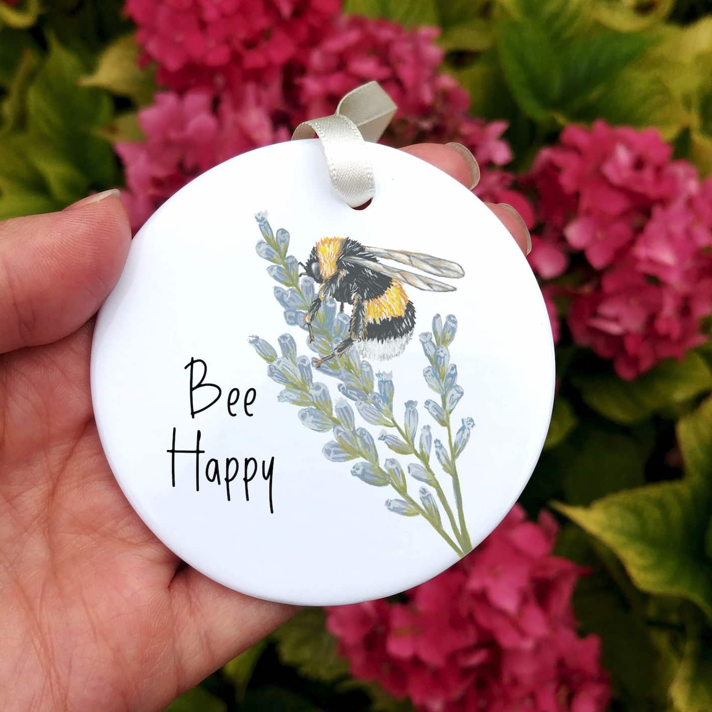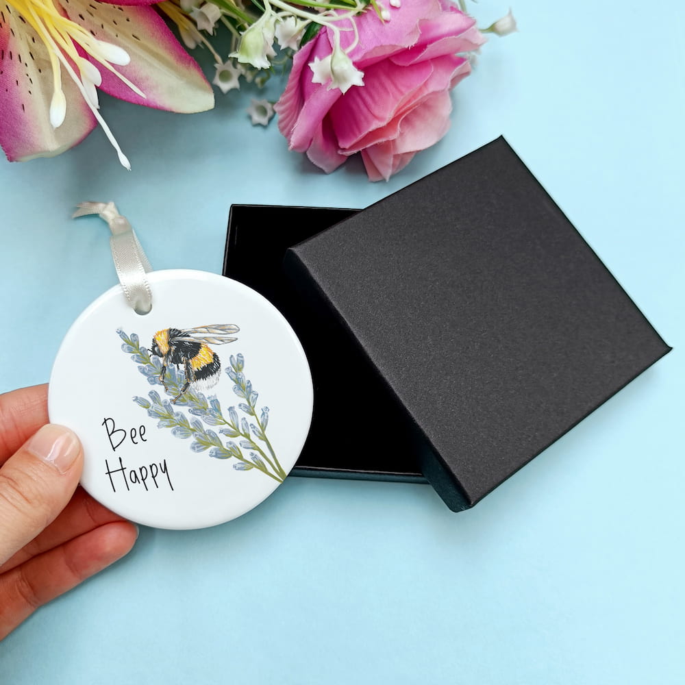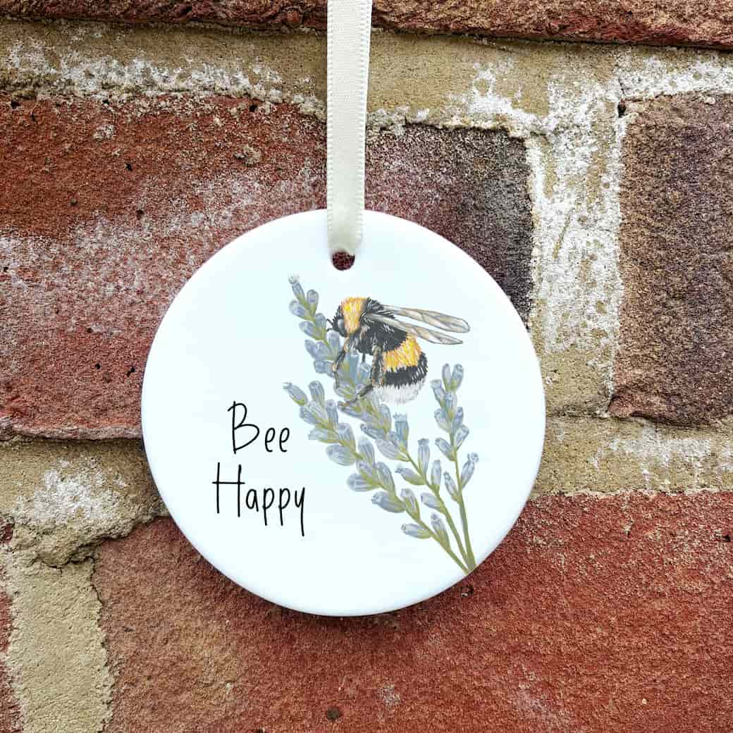 Ceramic ornaments are 7cm by 7cm and are flat, print is only on one side. Comes with a cream ribbon. Print shows Laura's hand-painted on bumble bee on lavender with the text 'Bee Happy'.