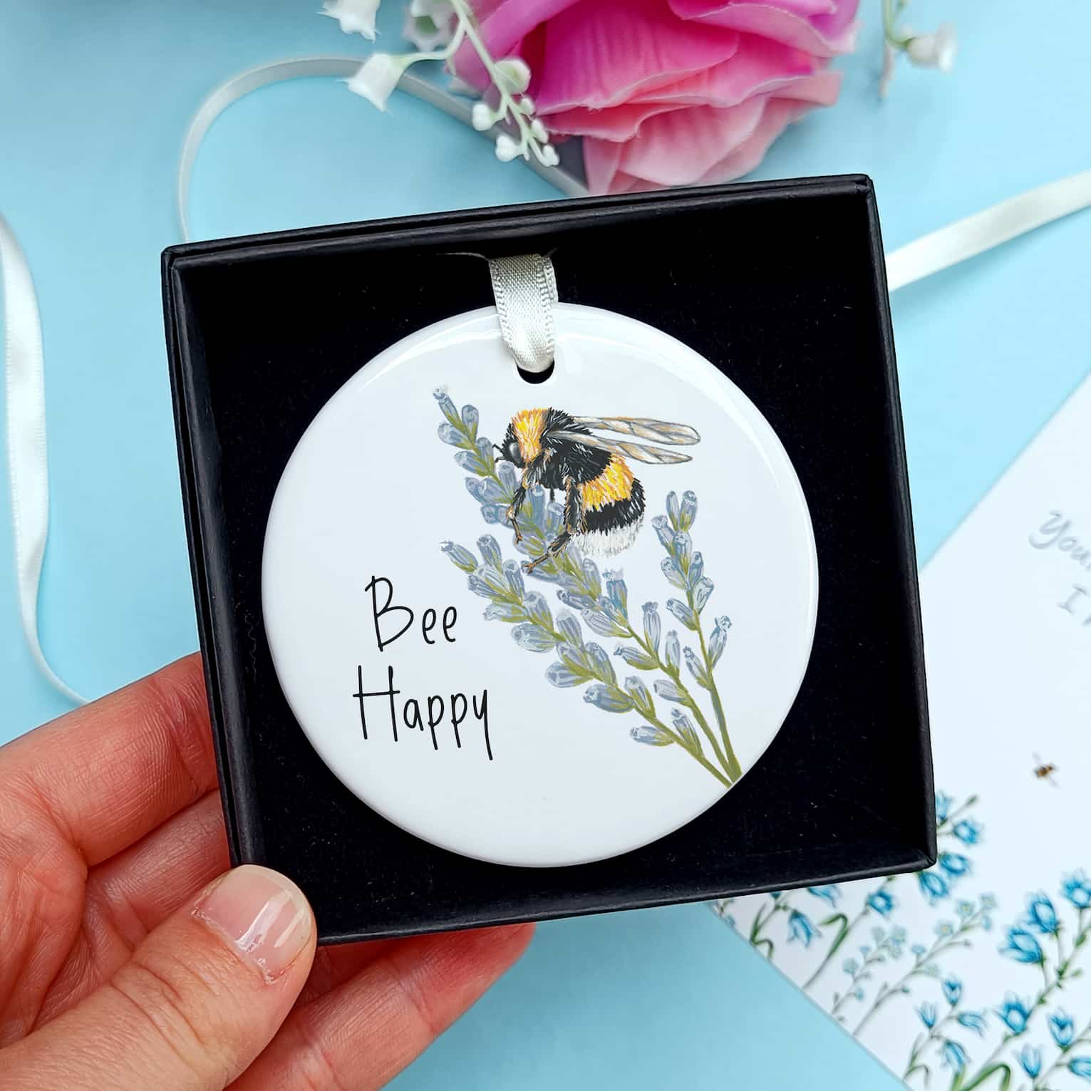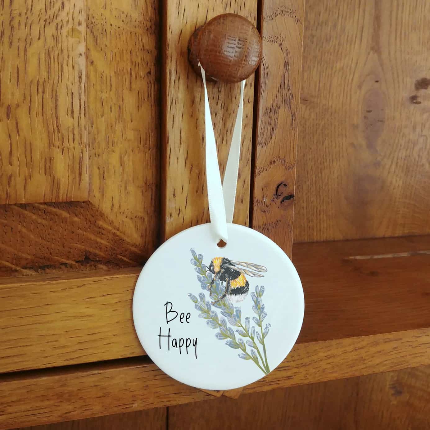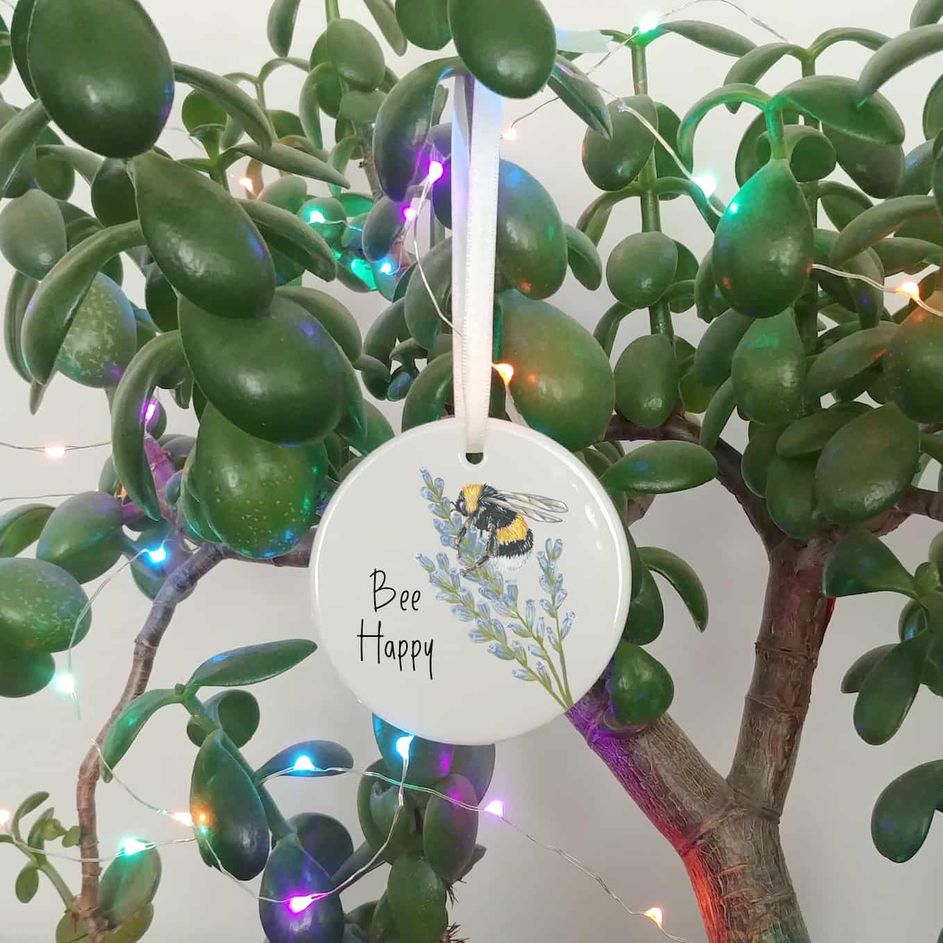 Ceramic ornaments are 7cm by 7cm and are flat, print is only on one side. Comes with a cream ribbon. Print shows Laura's hand-painted on bumble bee on lavender with the text 'Bee Happy'.