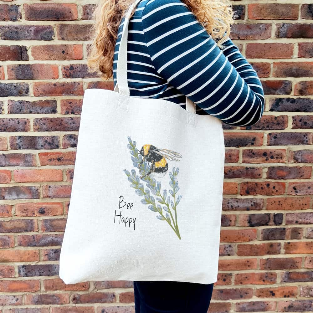 Print shows Laura's hand-painted bumble bee on lavender with the text 'Bee Happy'.