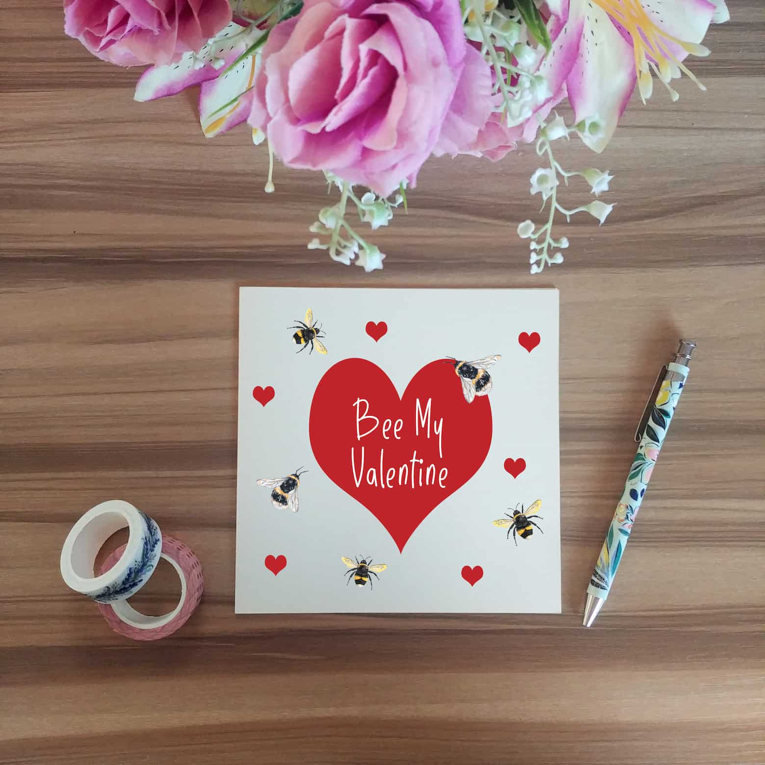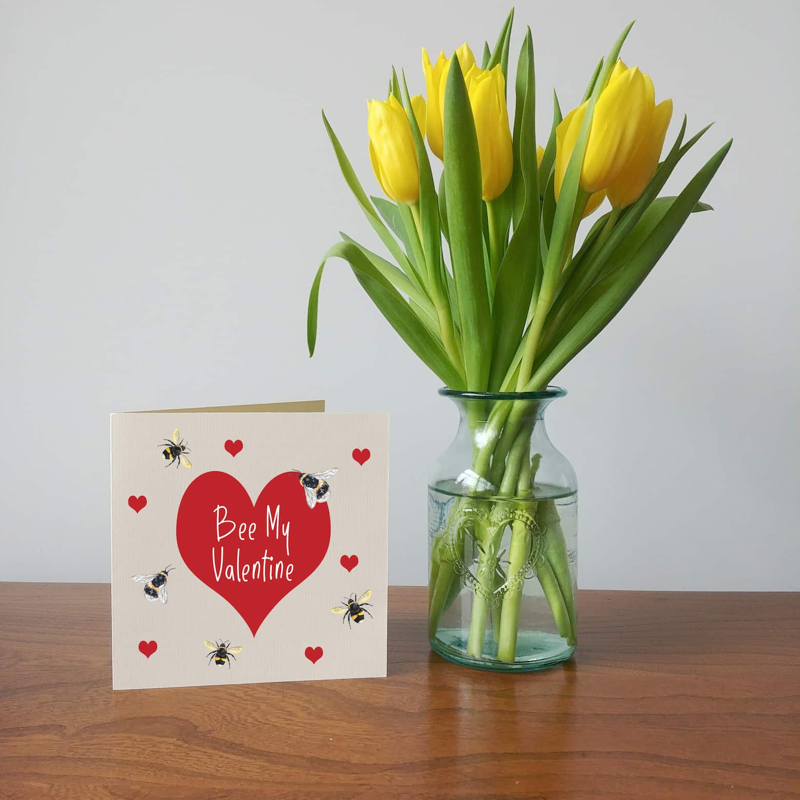 Bumble bee valentine's day card, featuring a digital print of Laura's hand-painted bee's in gouache paint.