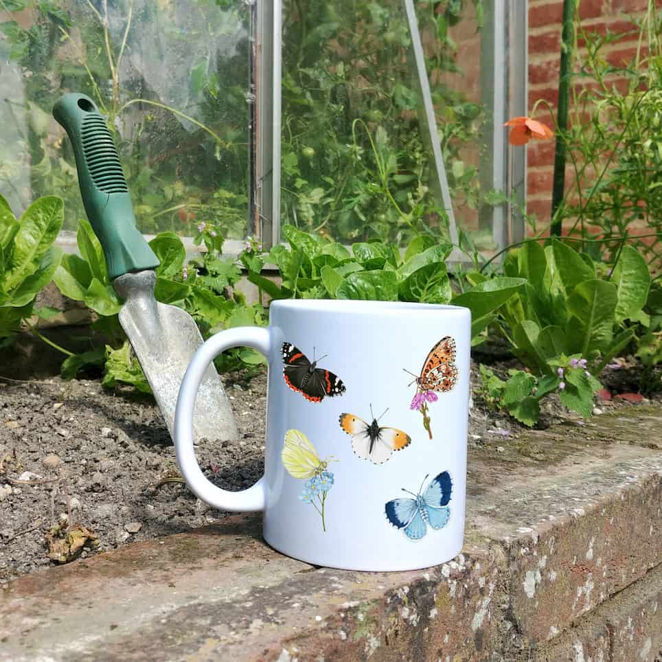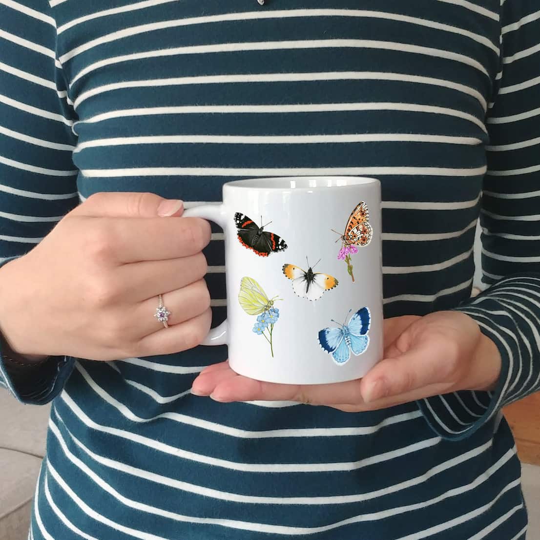 Original artwork painted in gouache. The names of the butterflies that appear on the mug are, red admiral, holly blue, orange tip, green veined white and a small pearl bordered fritillary.