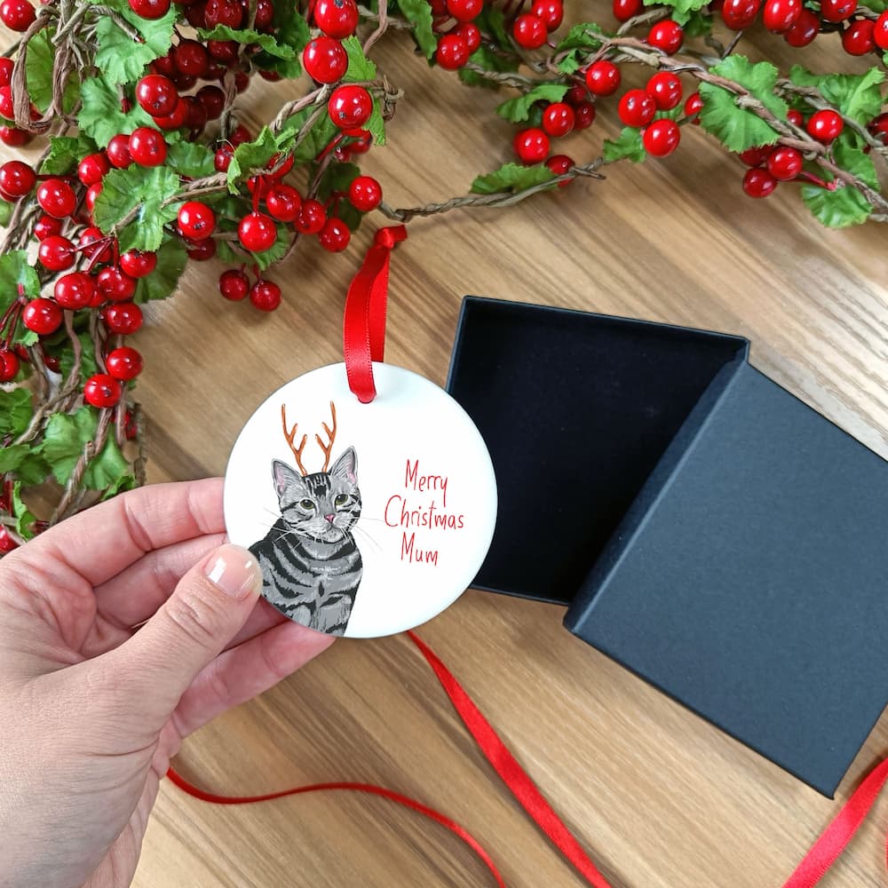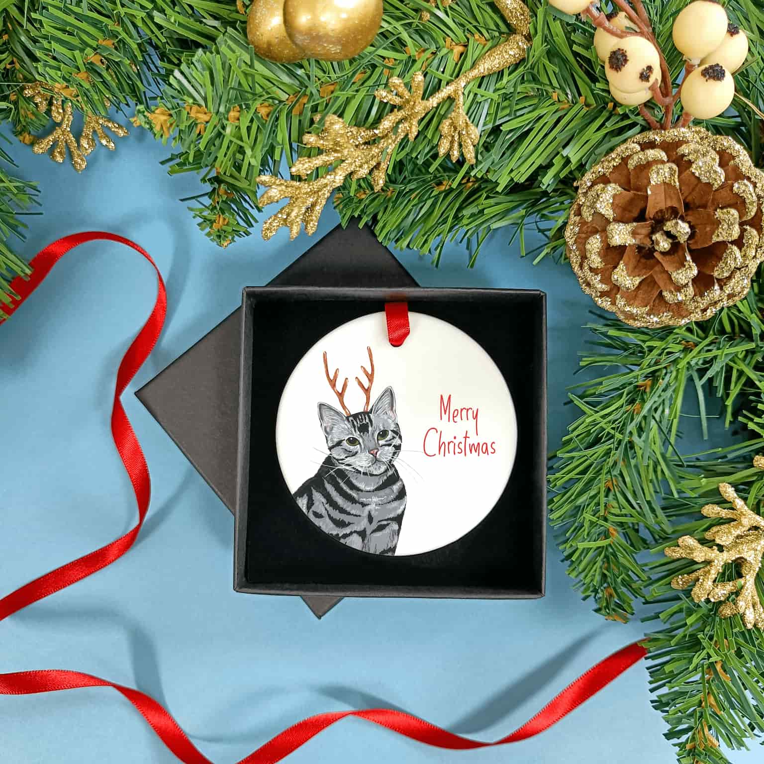 Ceramic ornaments are 7cm by 7cm and are flat, print is only on one side. Comes with a 0.7cm by 25cm red ribbon. Print shows Laura's hand-painted cat with antlers and the text 'Merry Christmas'.