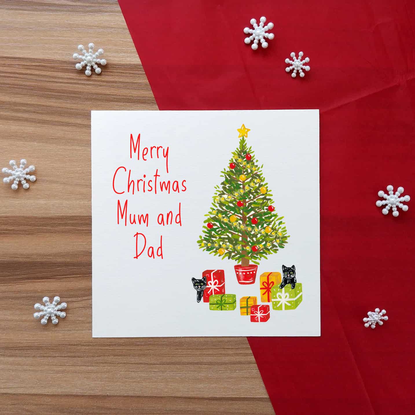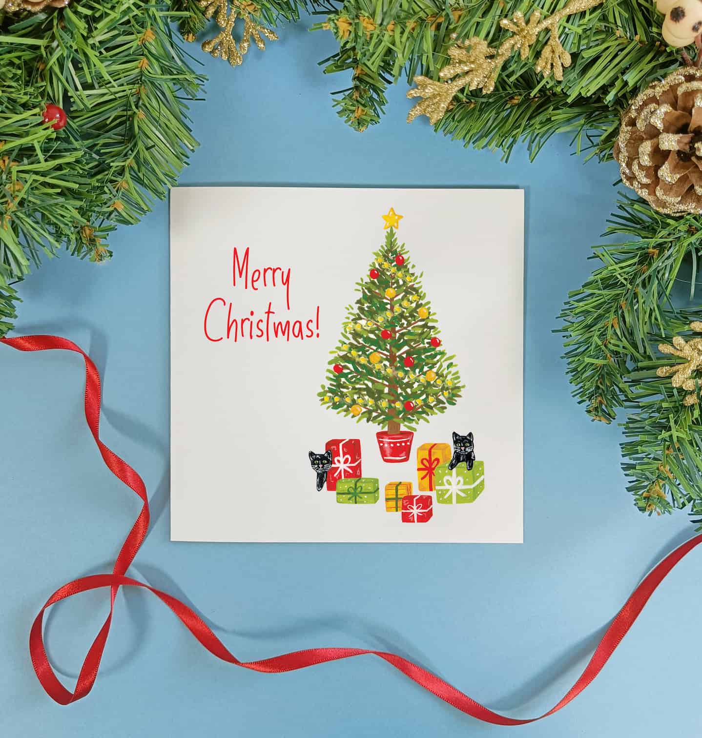 Cat's Christmas Tree card, featuring a digital print of Laura's Christmas tree with present and cats illustration in gouache.