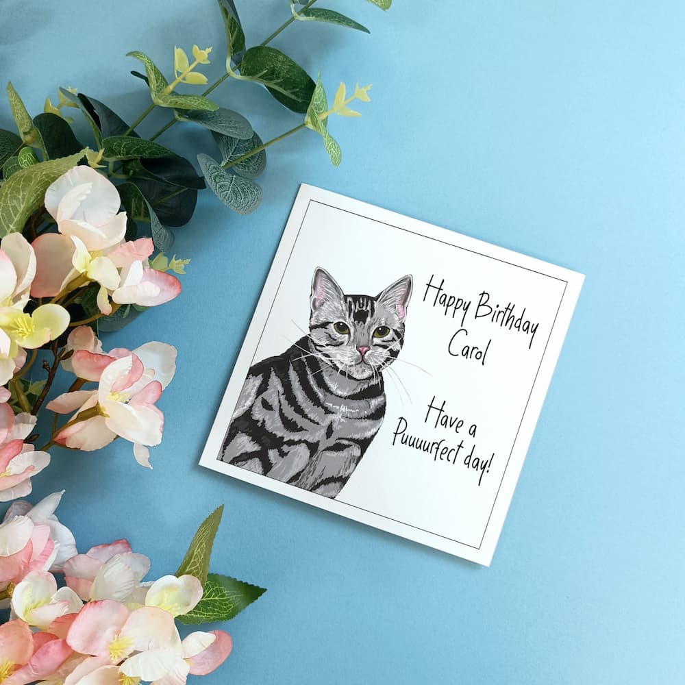 The card shows a tabby cat that has been hand painted in gouache paint, with the text 'Happy Birthday Have a Puuuurfect Day'. You can also personalise with the recipient's name making it extra special.