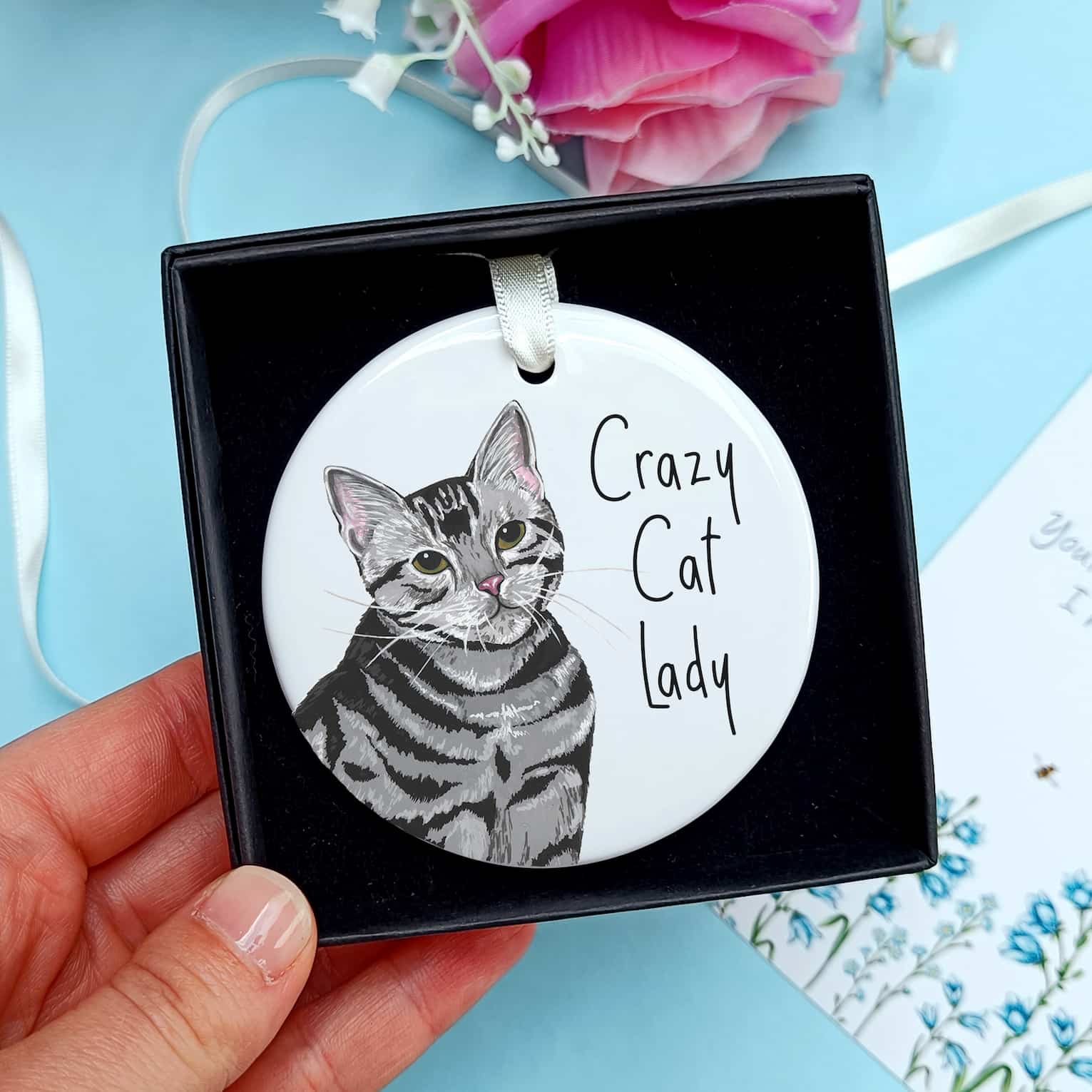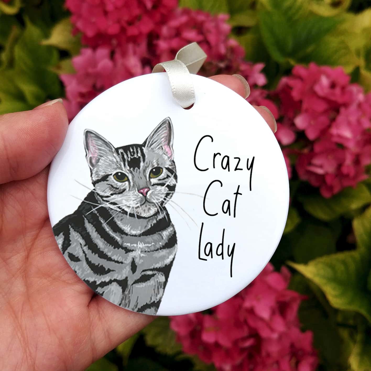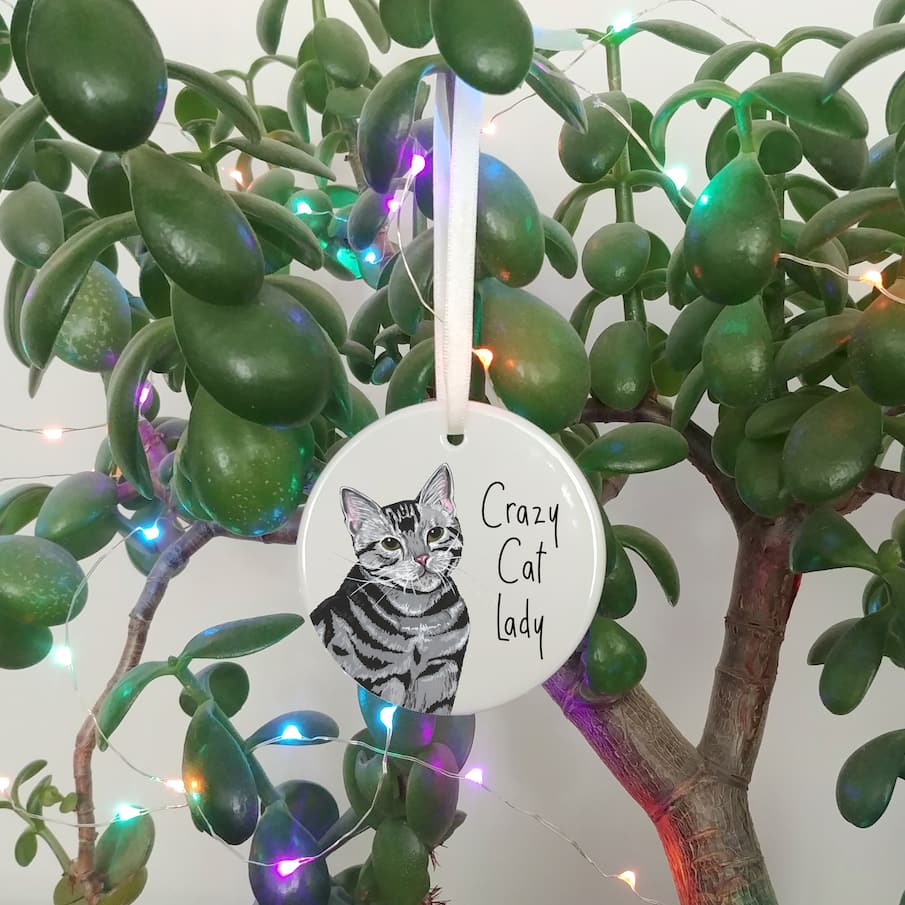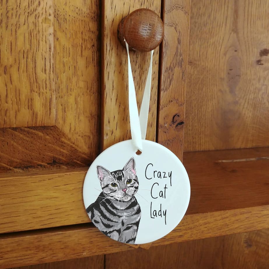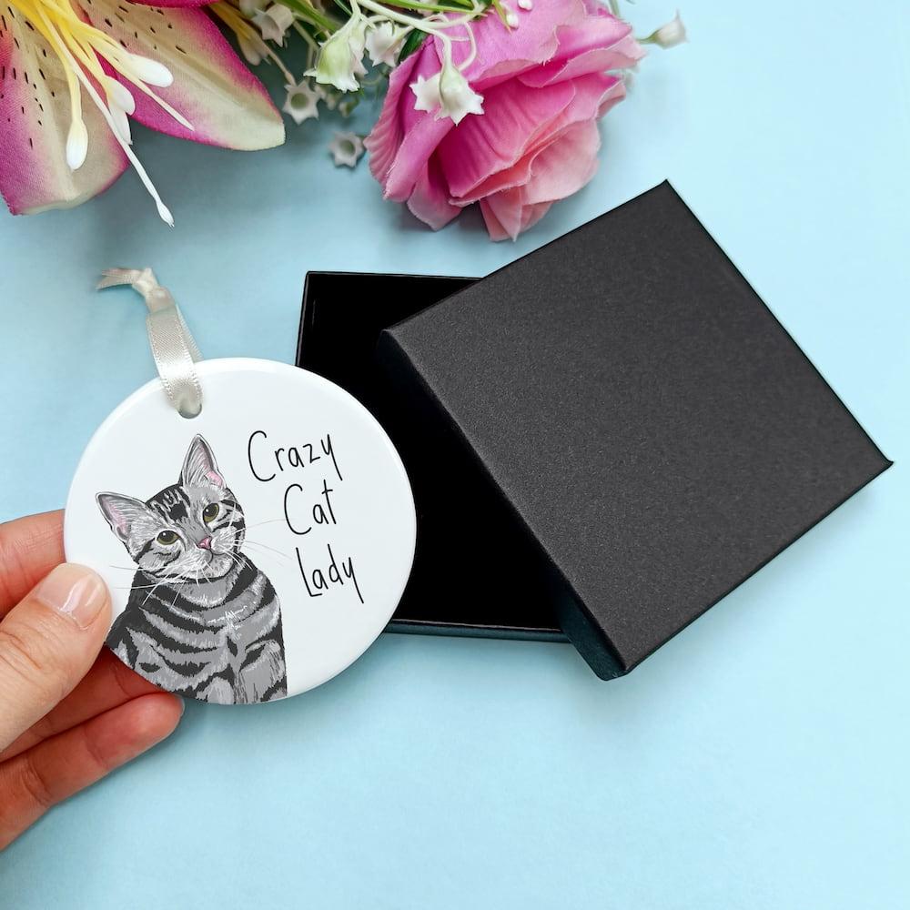 Ceramic ornaments are 7cm by 7cm and are flat, print is only on one side. Comes with a cream ribbon. Print shows Laura's hand-painted on tabby cat with the text 'Crazy Cat Lady'.