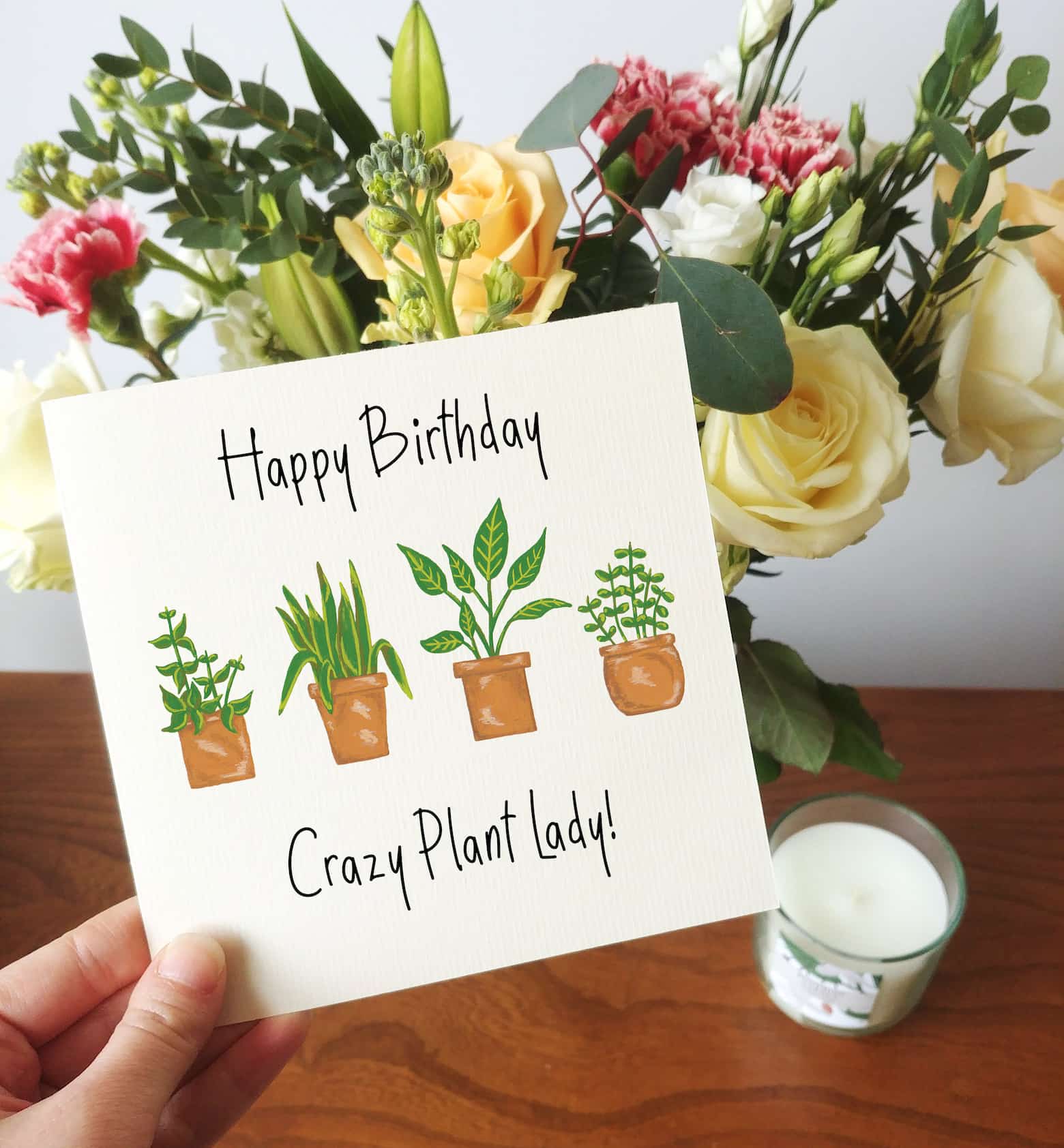 Crazy Plant Lady Birthday card, featuring a digital print of Laura's house plant illustrations in gouache.