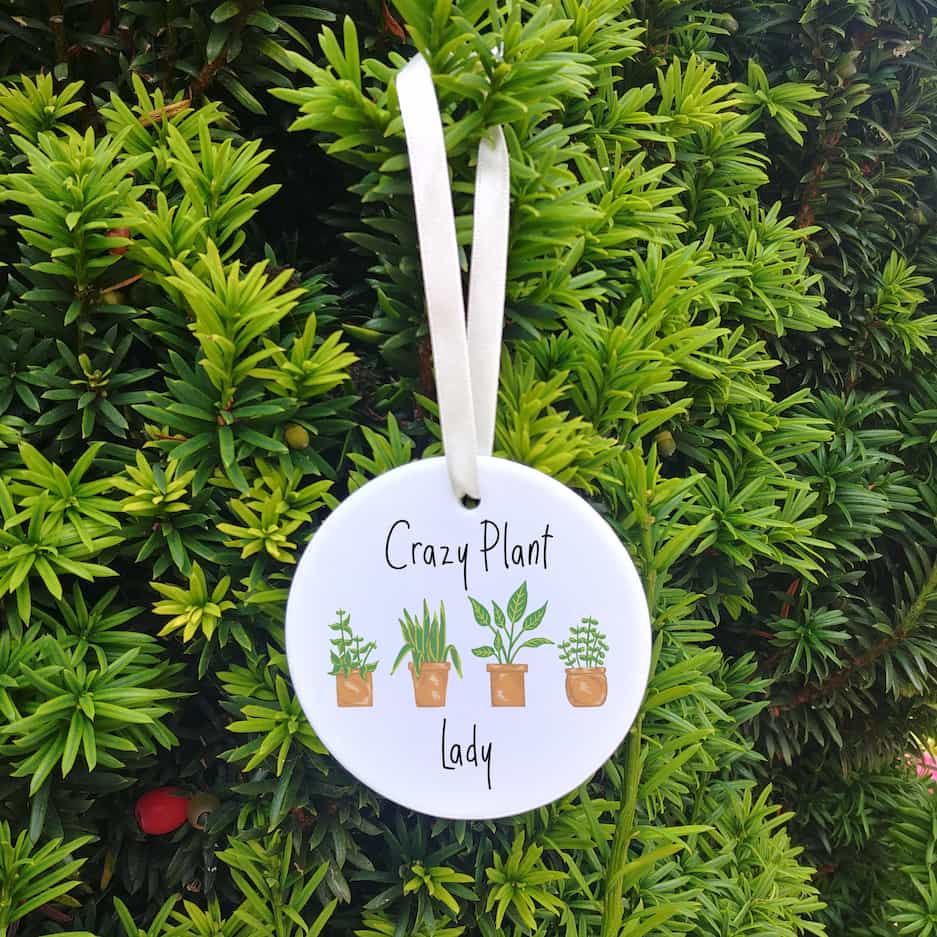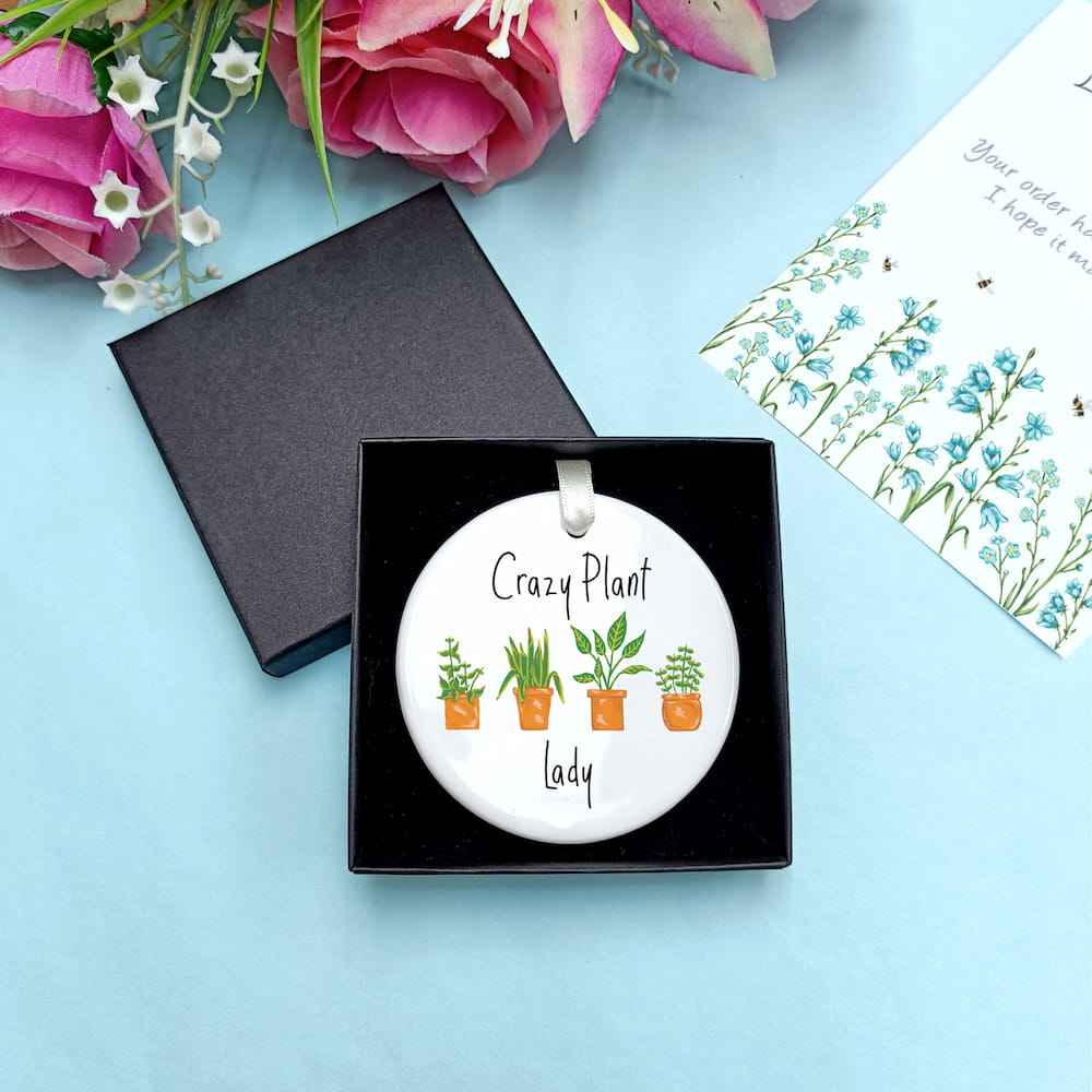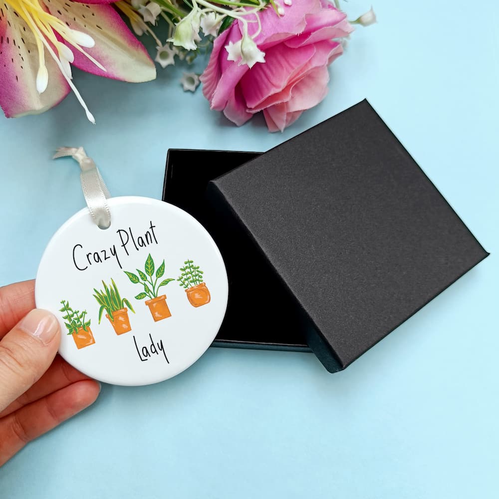 Ceramic ornaments are 7cm by 7cm and are flat, print is only on one side. Comes with a cream ribbon. Print shows Laura's hand-painted potted plants with the choice between the text 'Crazy Plant Lady' or 'Crazy Plant Man'.