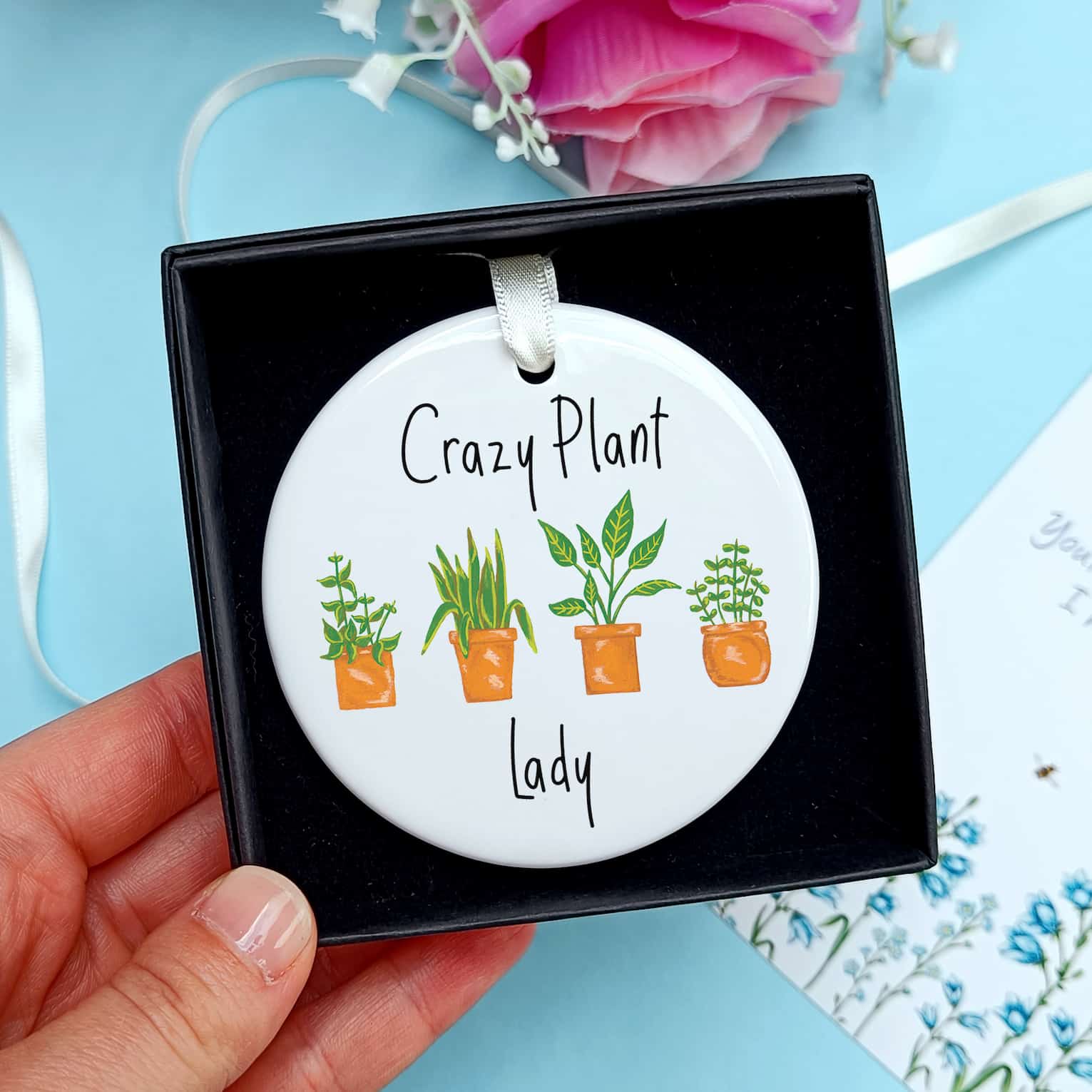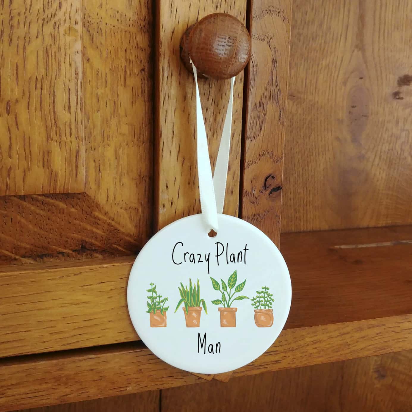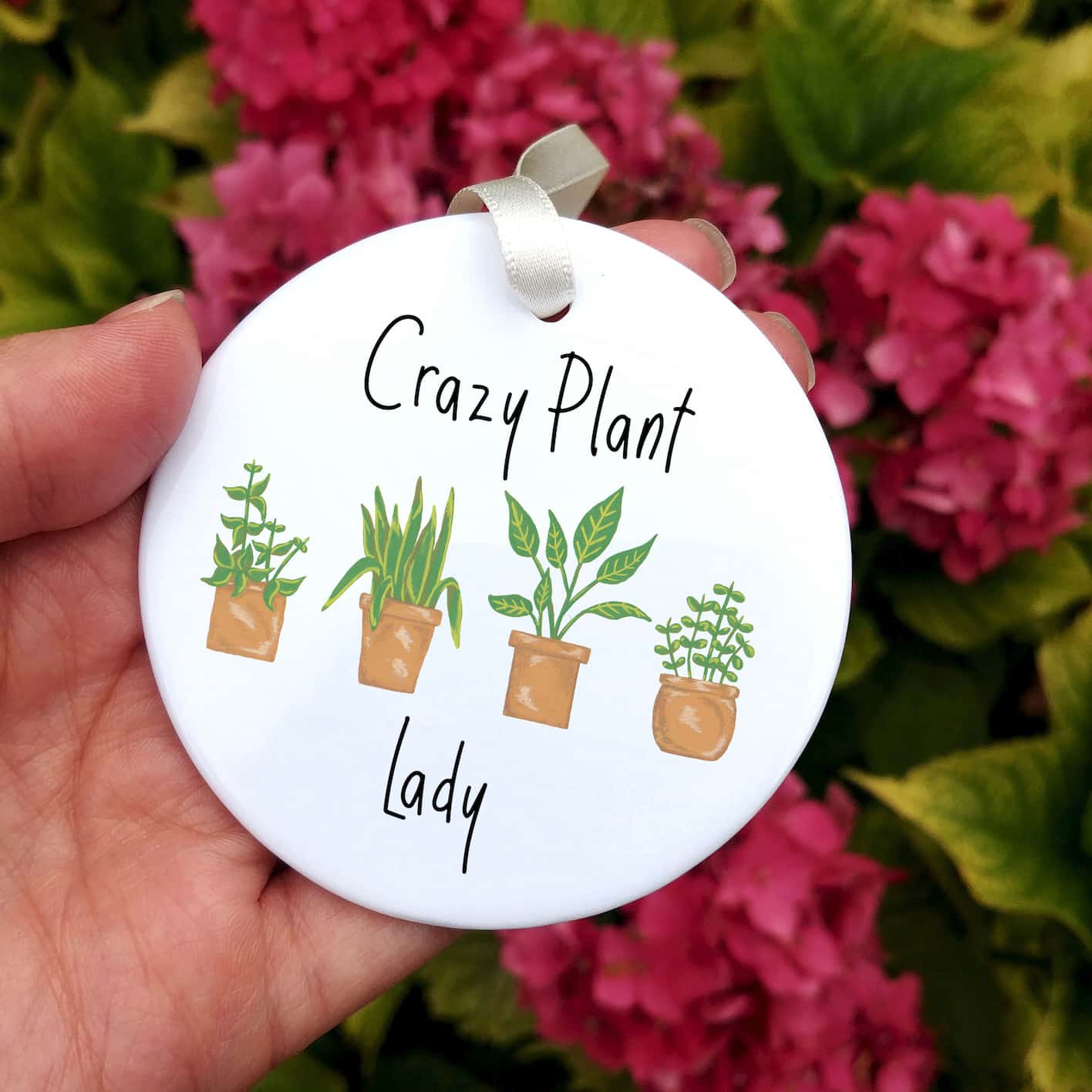 Ceramic ornaments are 7cm by 7cm and are flat, print is only on one side. Comes with a cream ribbon. Print shows Laura's hand-painted potted plants with the choice between the text 'Crazy Plant Lady' or 'Crazy Plant Man'.