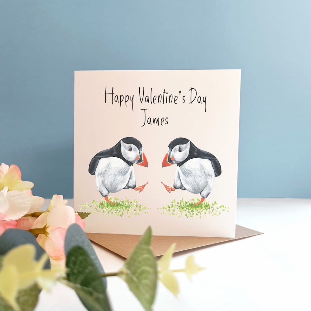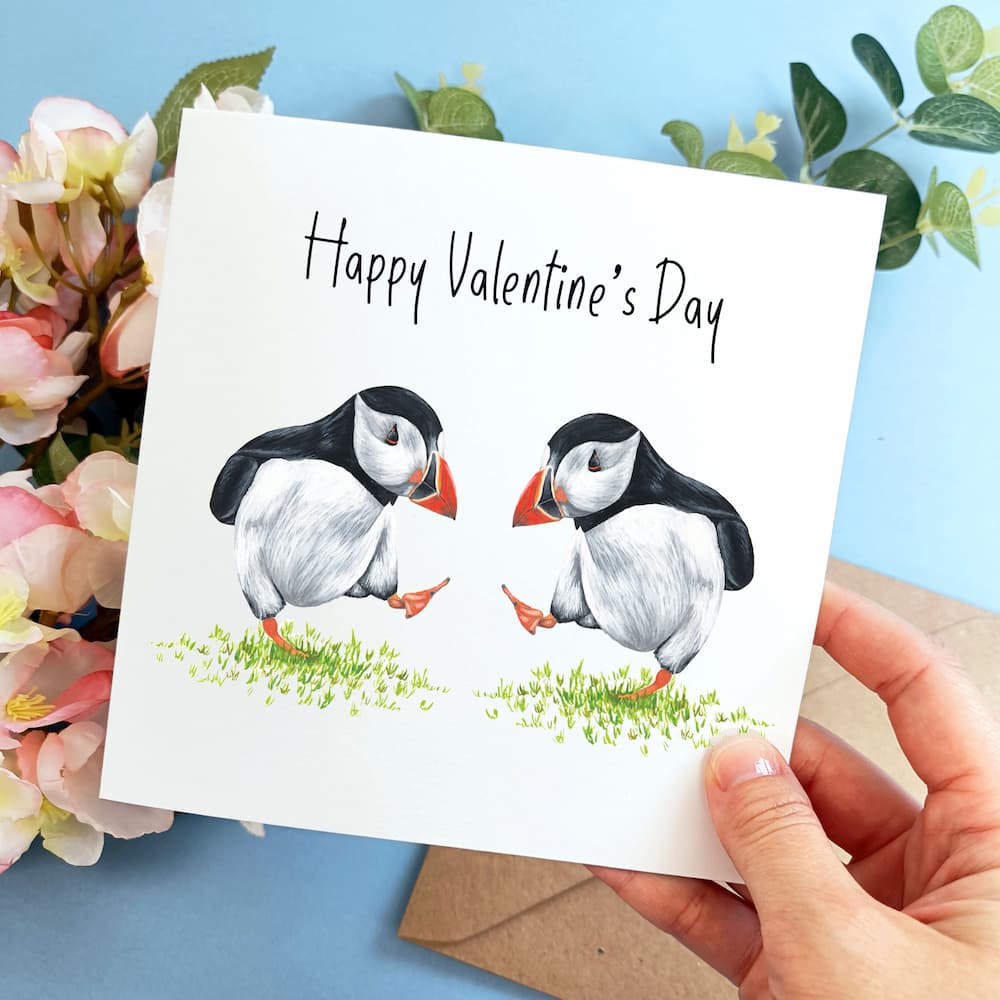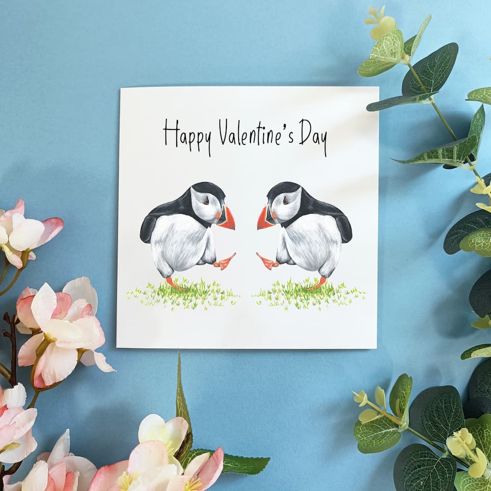 A beautifully illustrated puffin valentine's day card, perfect for anyone who loves cute puffins.
