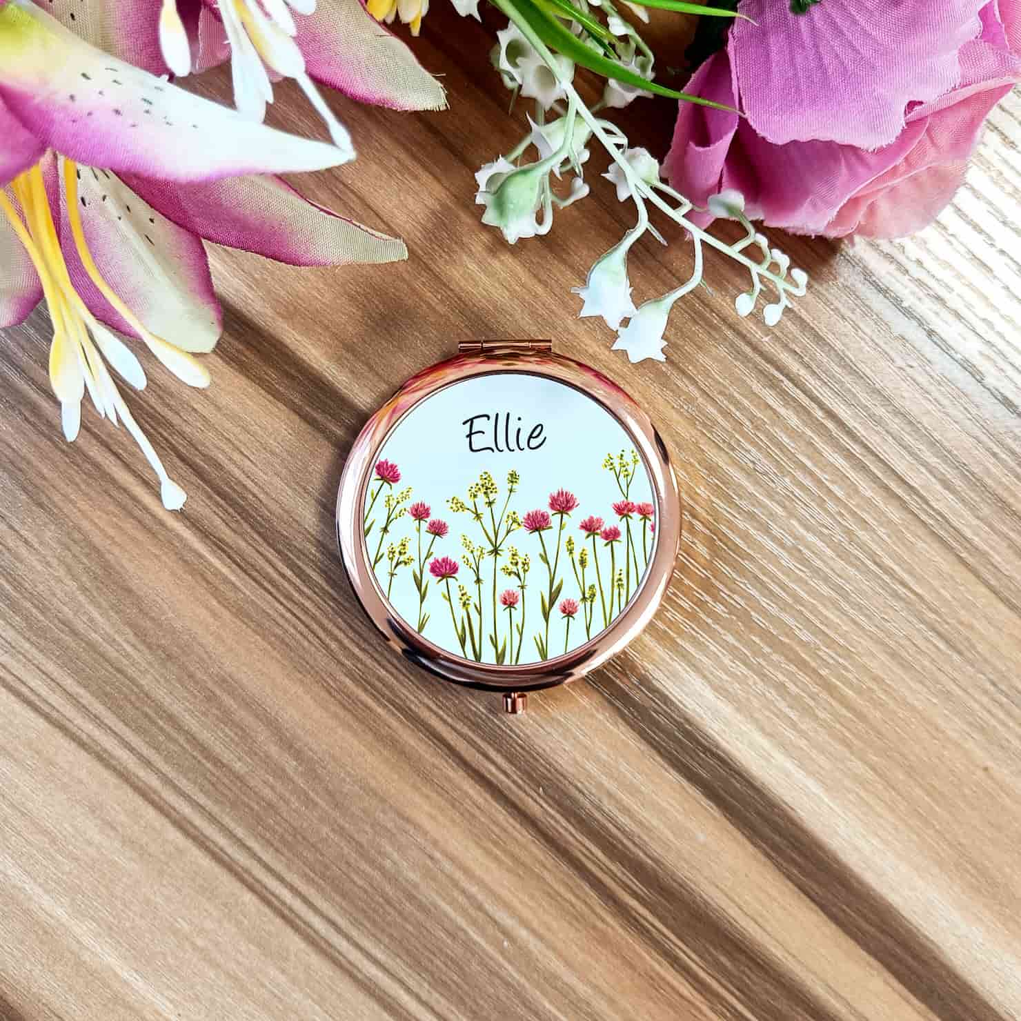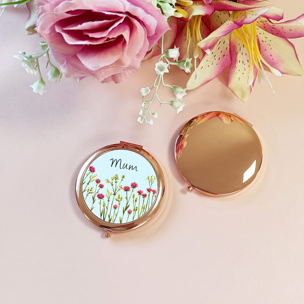 Floral Name Pocket Mirror | Pink Flowers Rose Gold Compact Mirror