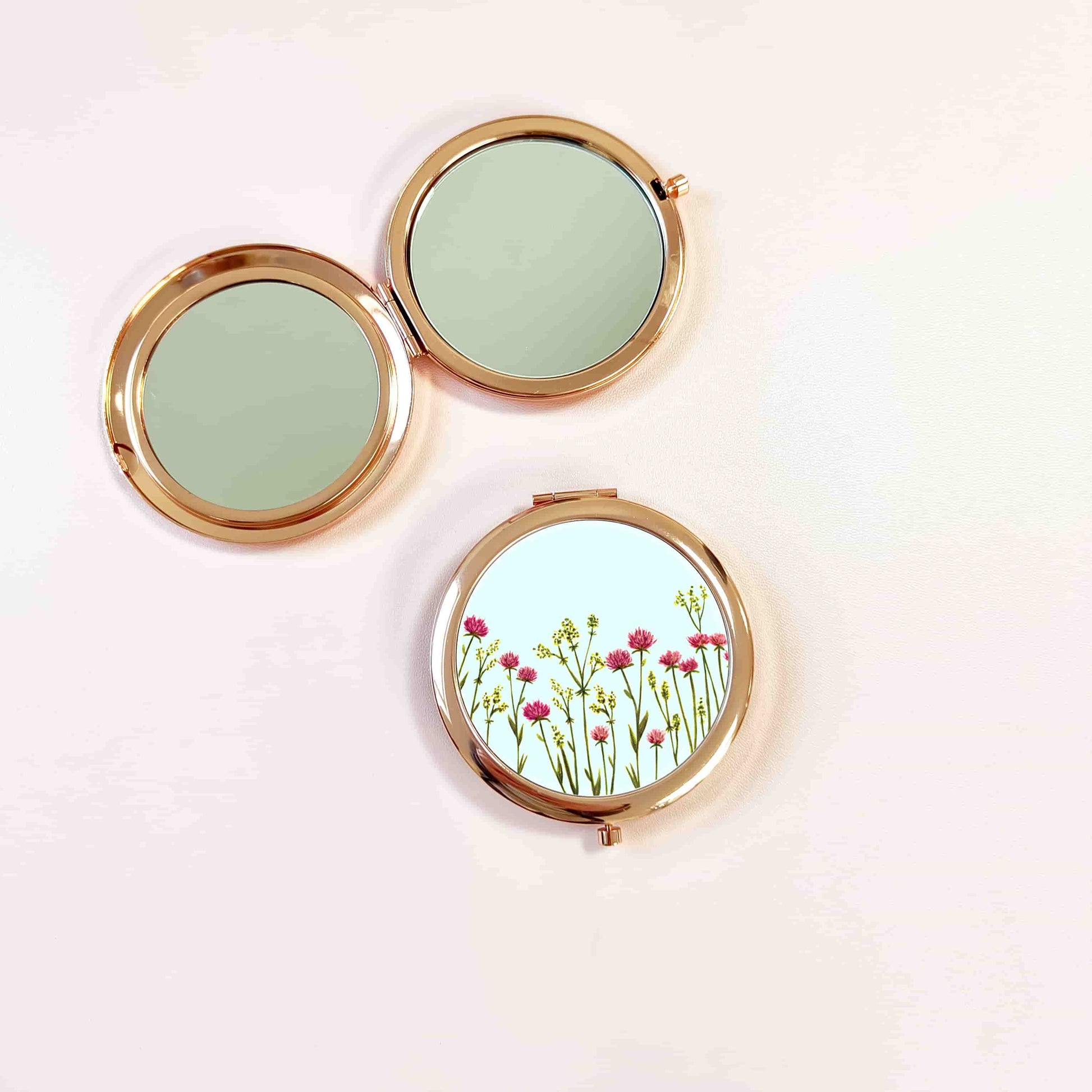 Pocket mirrors are 7cm by 7cm by 1cm, print is only on one side the other side is the rose gold metal.