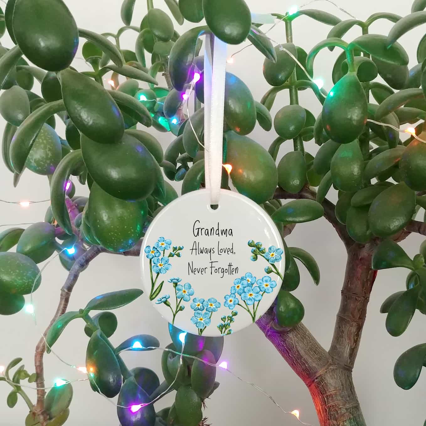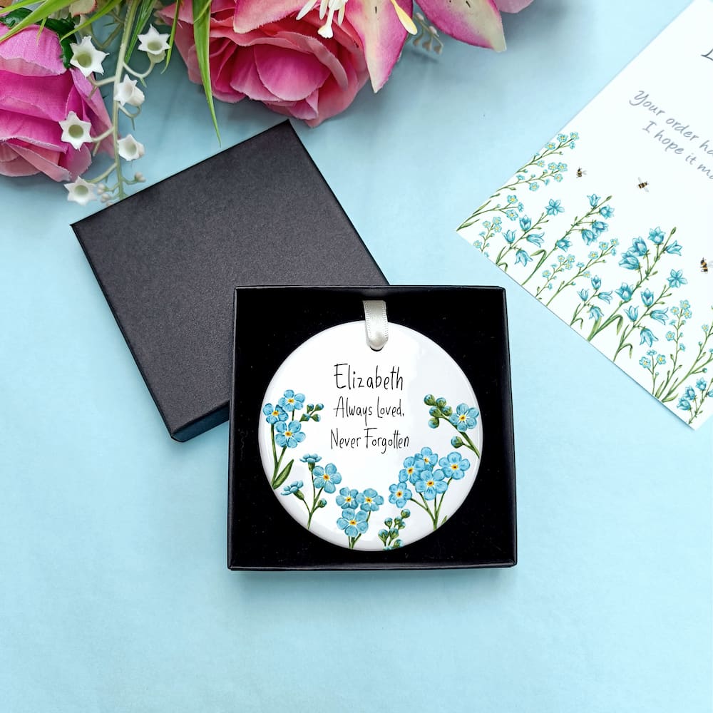 Ceramic ornaments are 7cm by 7cm and are flat, print is only on one side. Comes with a 0.7cm by 25cm cream ribbon. Print shows Laura's hand-painted forget me nots with the text 'Forever Loved, Never Forgotten.'