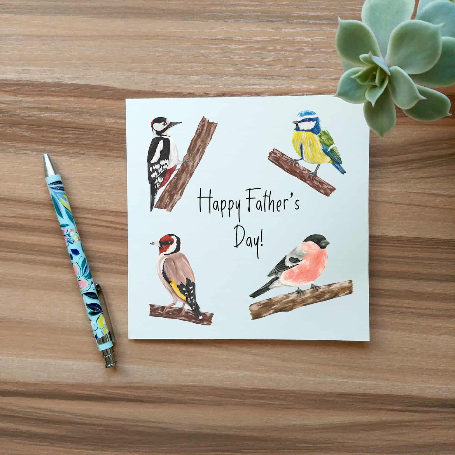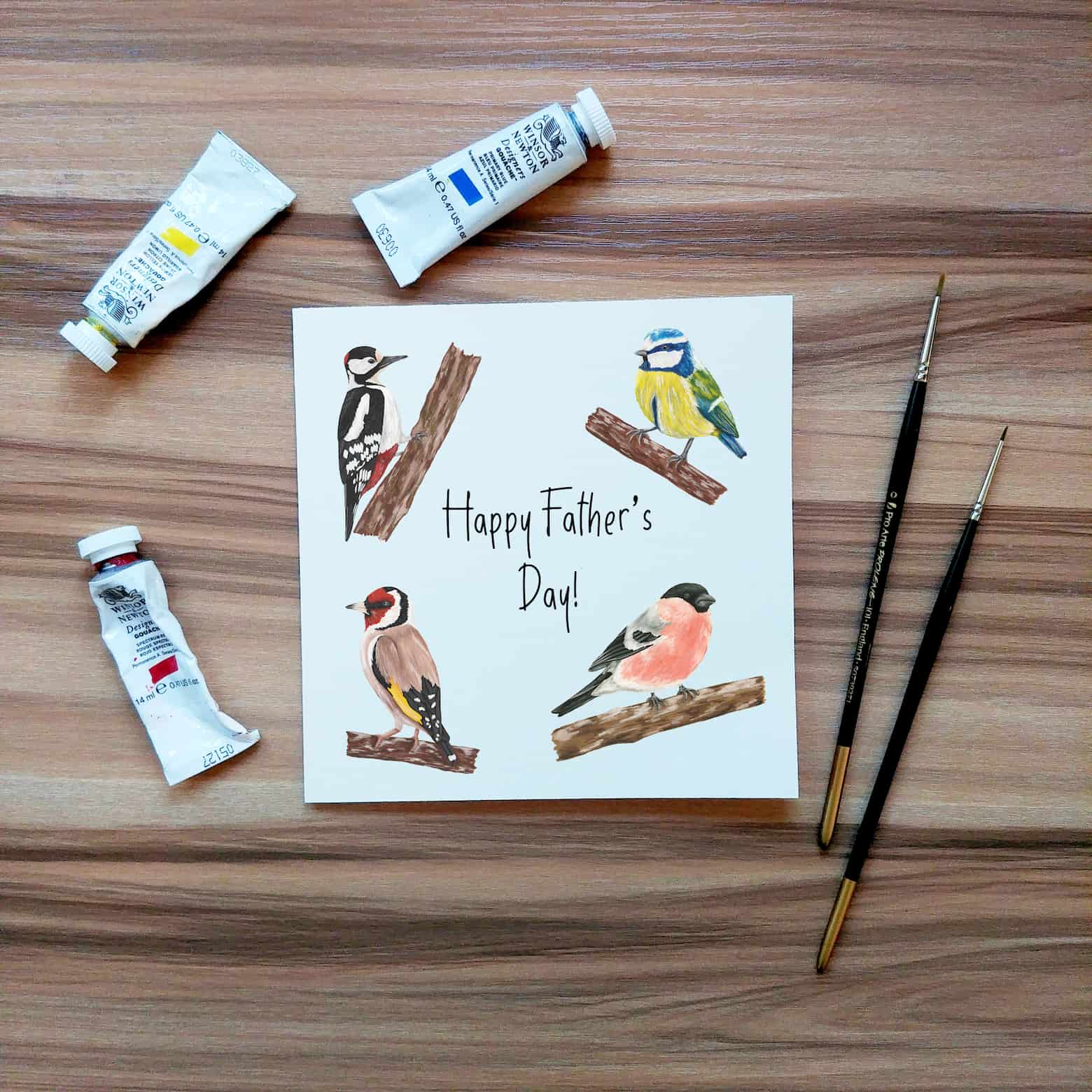 Garden Birds greeting card, featuring a digital print of Laura's hand-painted bluetit, bullfinch, goldfinch, and woodpecker in gouache paint.