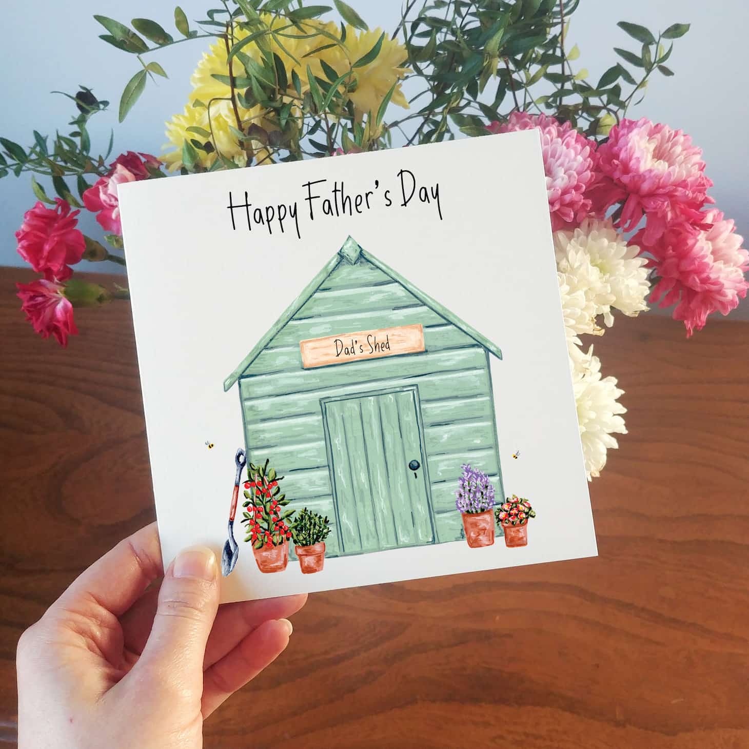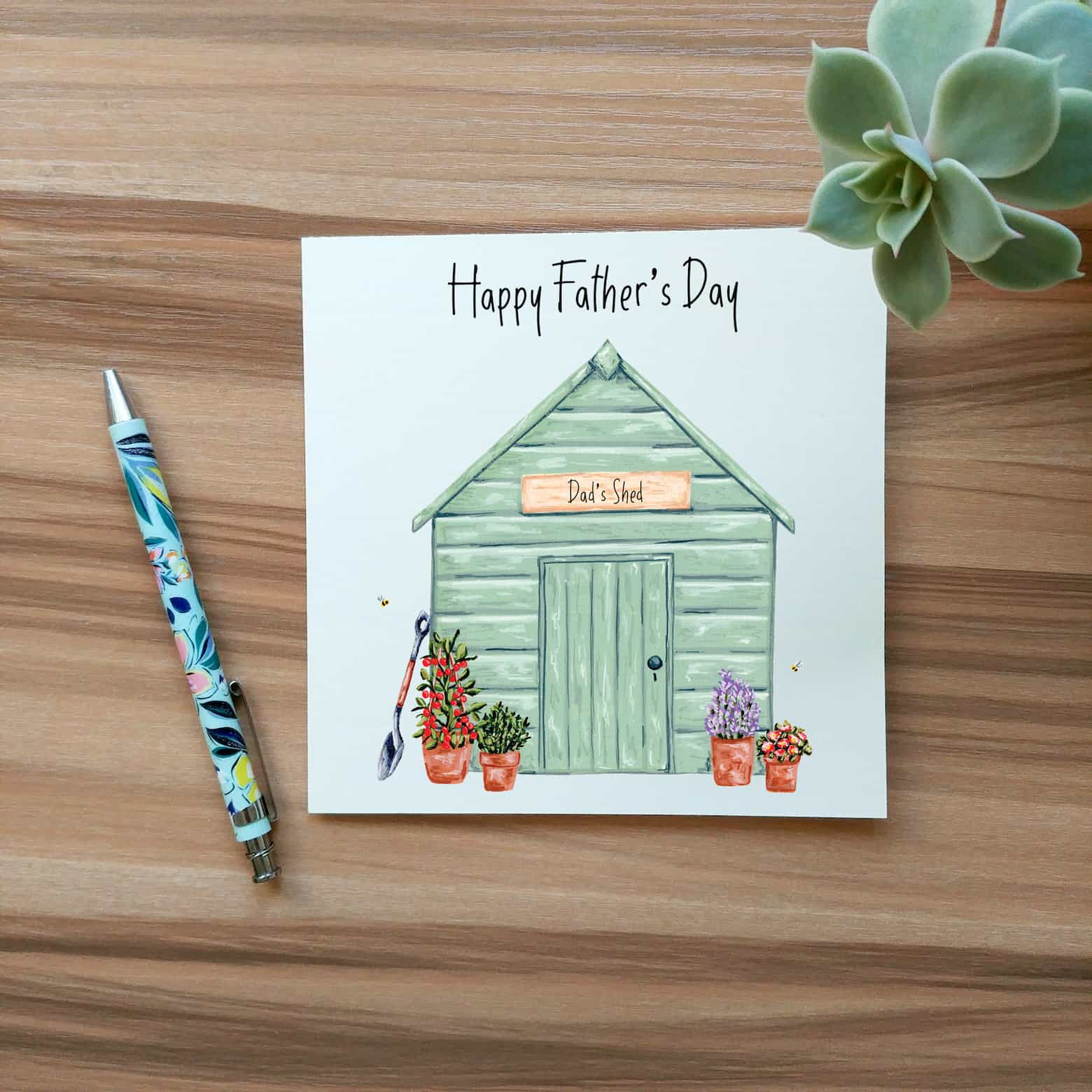 Garden Shed fathers day card, featuring a digital print of Laura's hand-painted shed with potted plants and bees.
