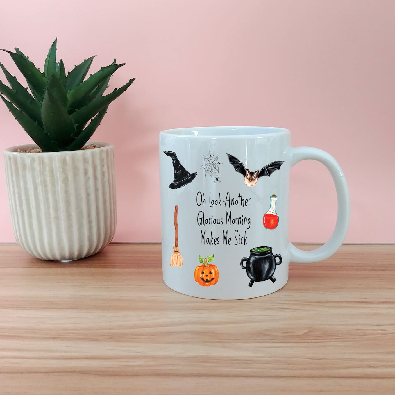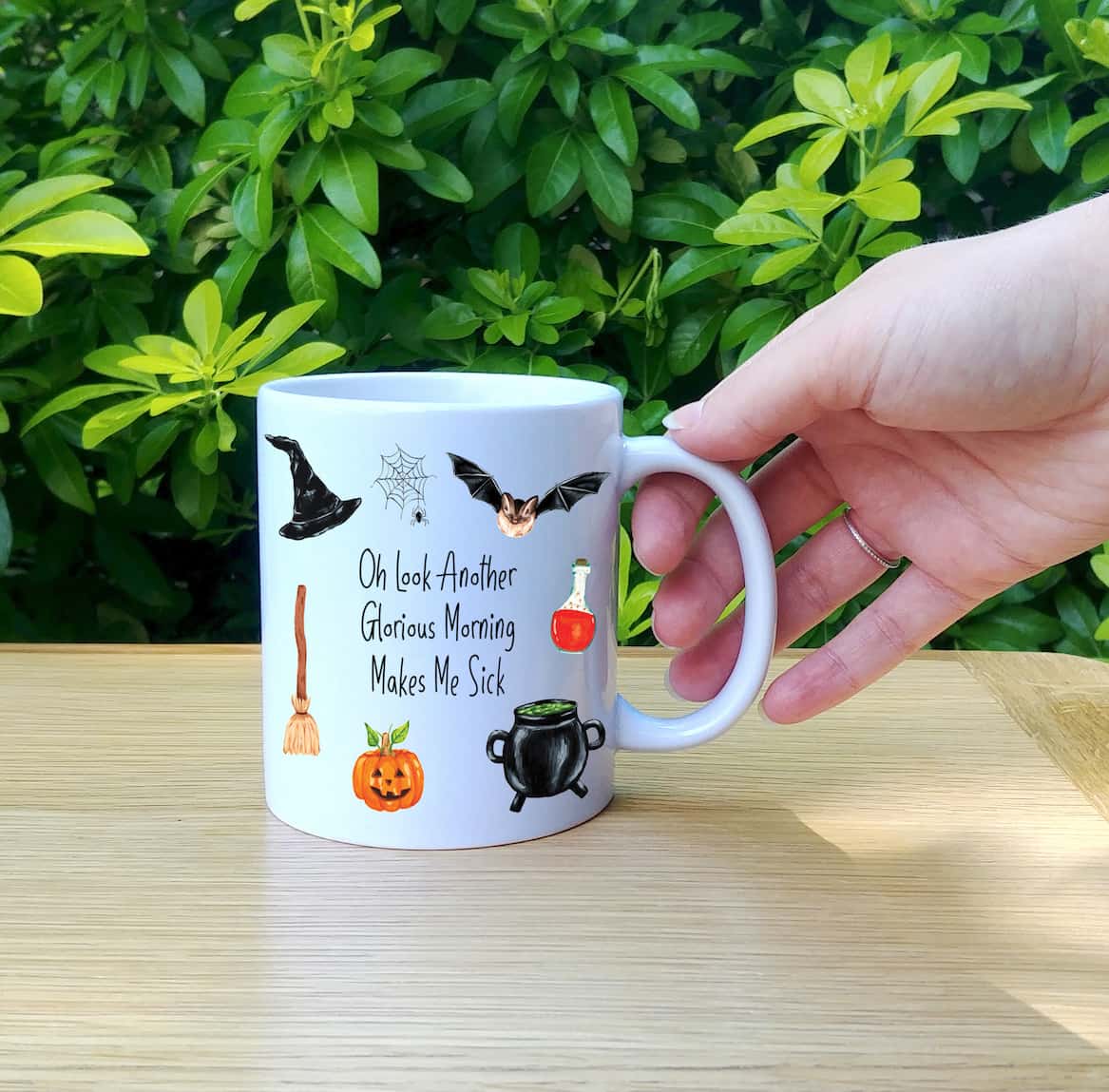 Choose the text on one side of the mug, either 'Oh Look Another Glorious Morning Makes Me Sick', or 'Witches Brew'.