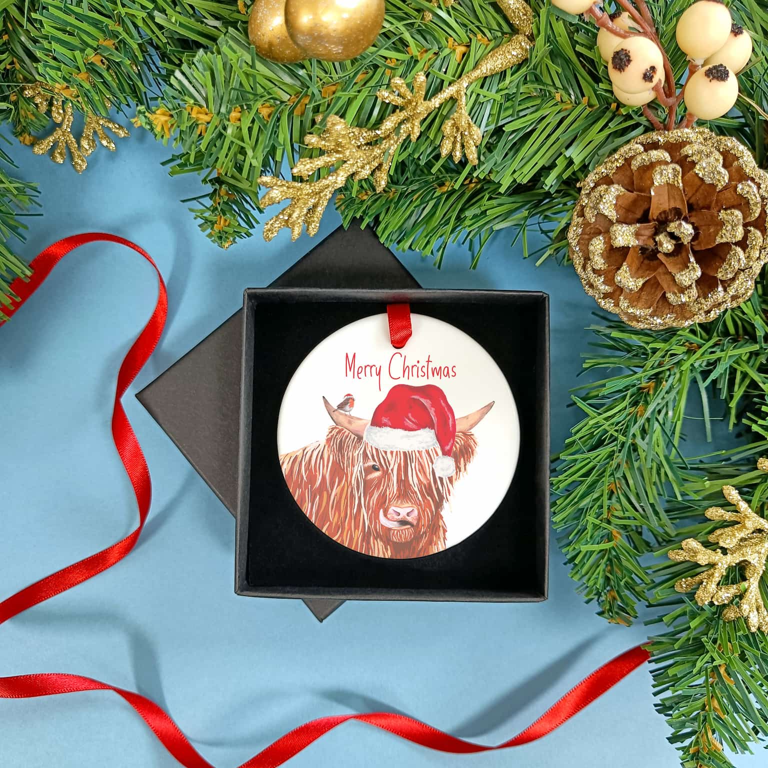Ceramic ornaments are 7cm by 7cm and are flat, print is only on one side. Comes with a red ribbon. Print shows Laura's hand-painted highland cow with a Santa's hat.