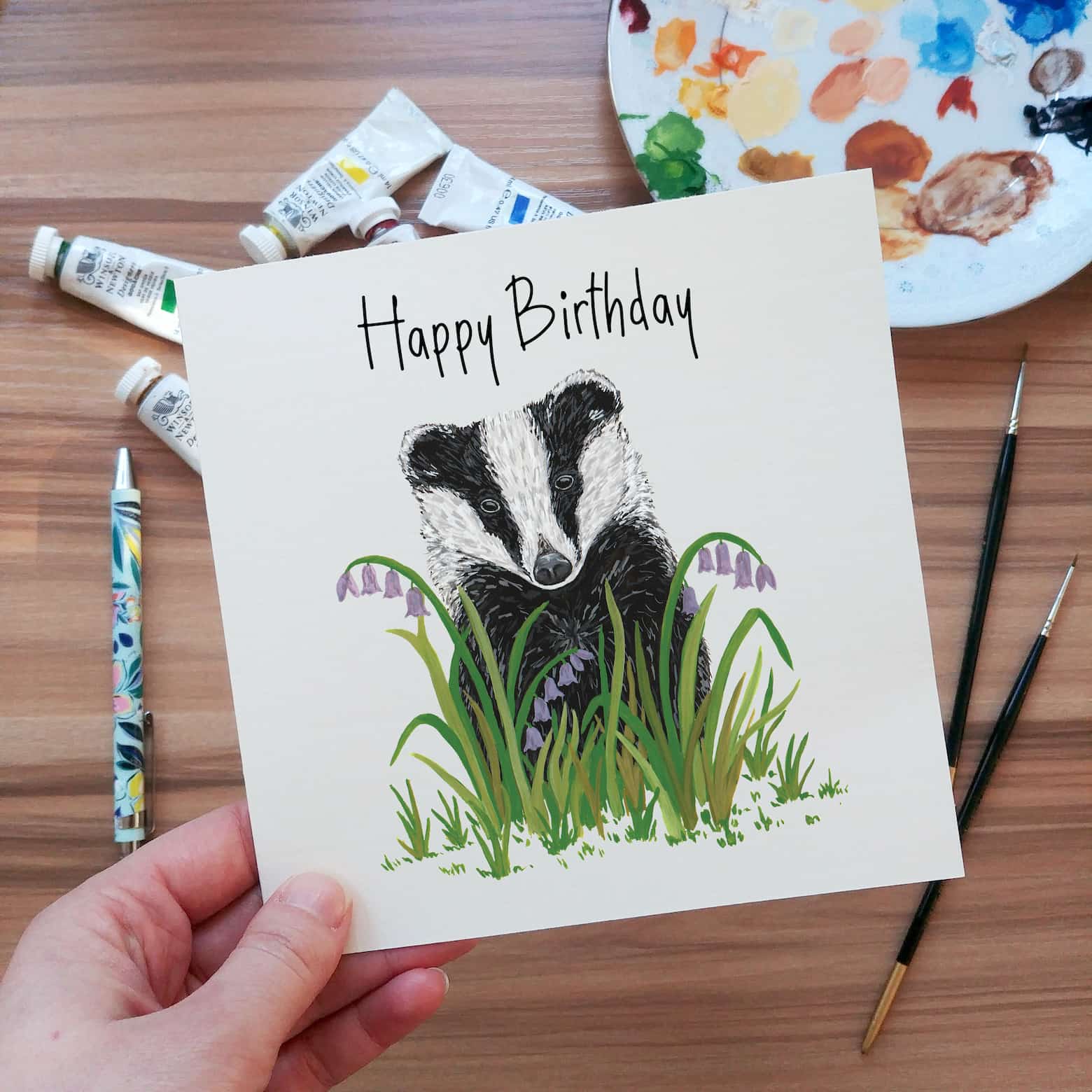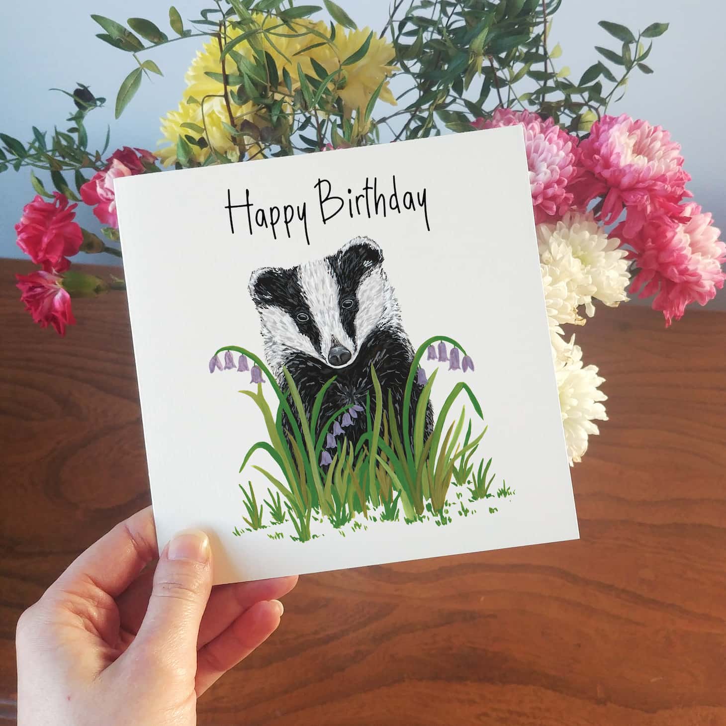 Badger greeting card, featuring a digital print of Laura's hand painted badger with bluebells in gouache paint.