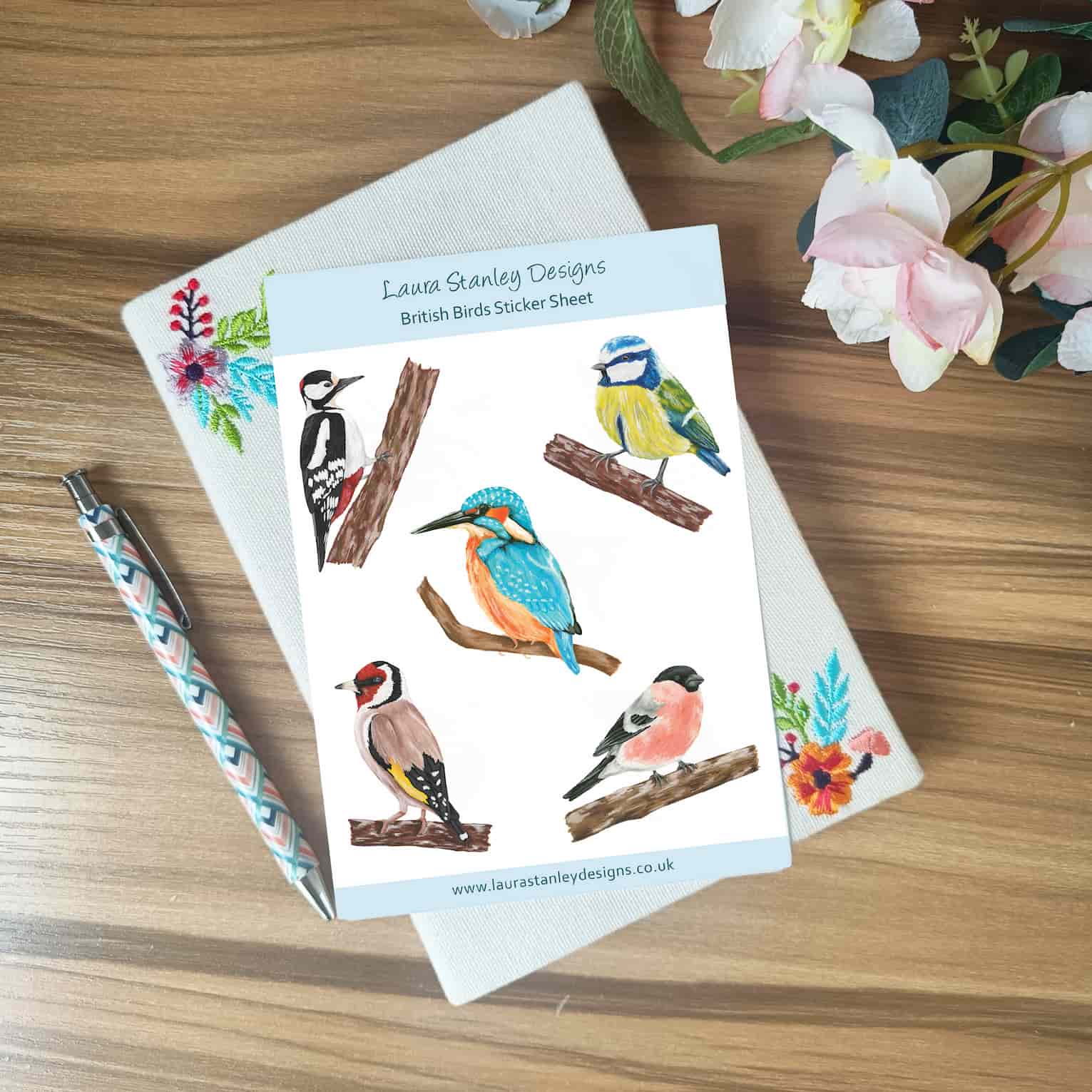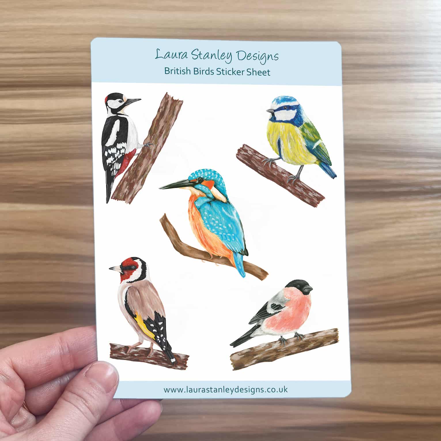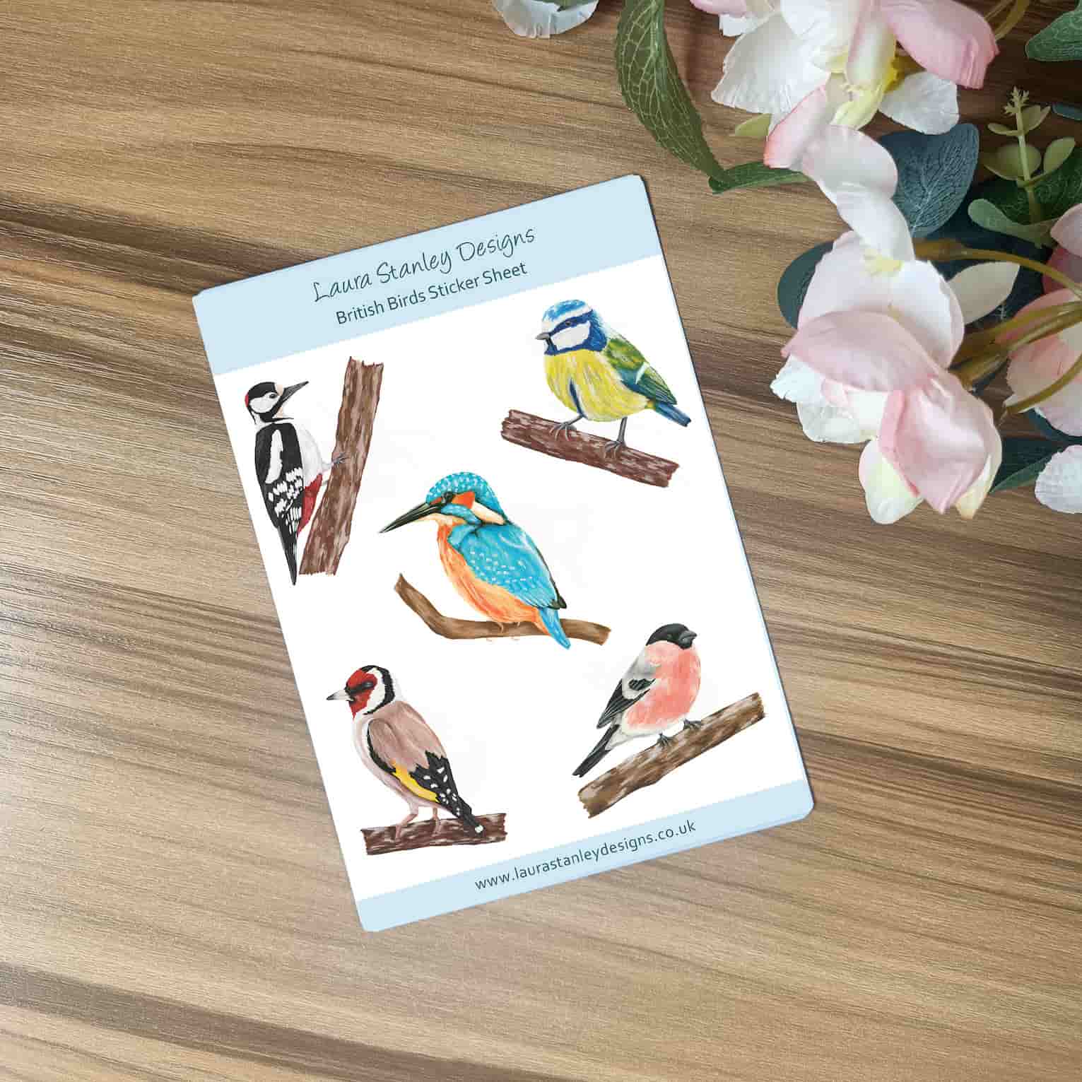 British Birds Sticker Sheet, featuring a digital print of Laura's hand painted birds in gouache paint.