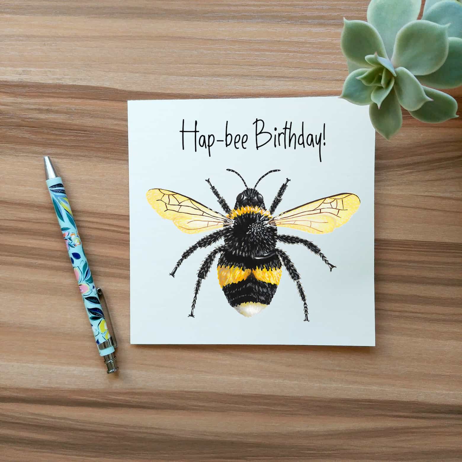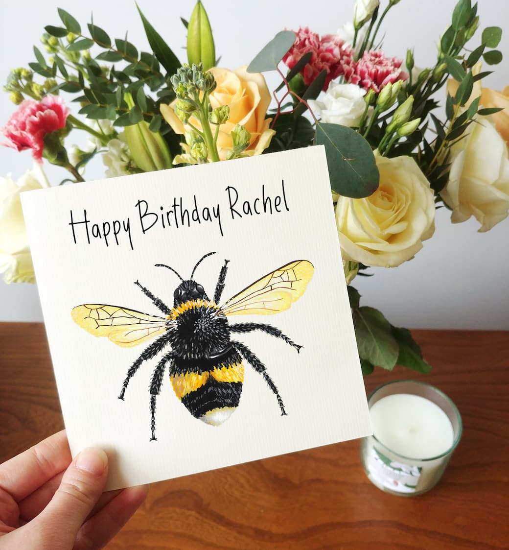 This card has the option to change the text on the front by selecting what you would like from the drop-down menu. You can choose between no text 'Blank' or 'Hap-bee Birthday!', or 'Personalised' where you can write exactly what you like. For examples, you can look through the photos.