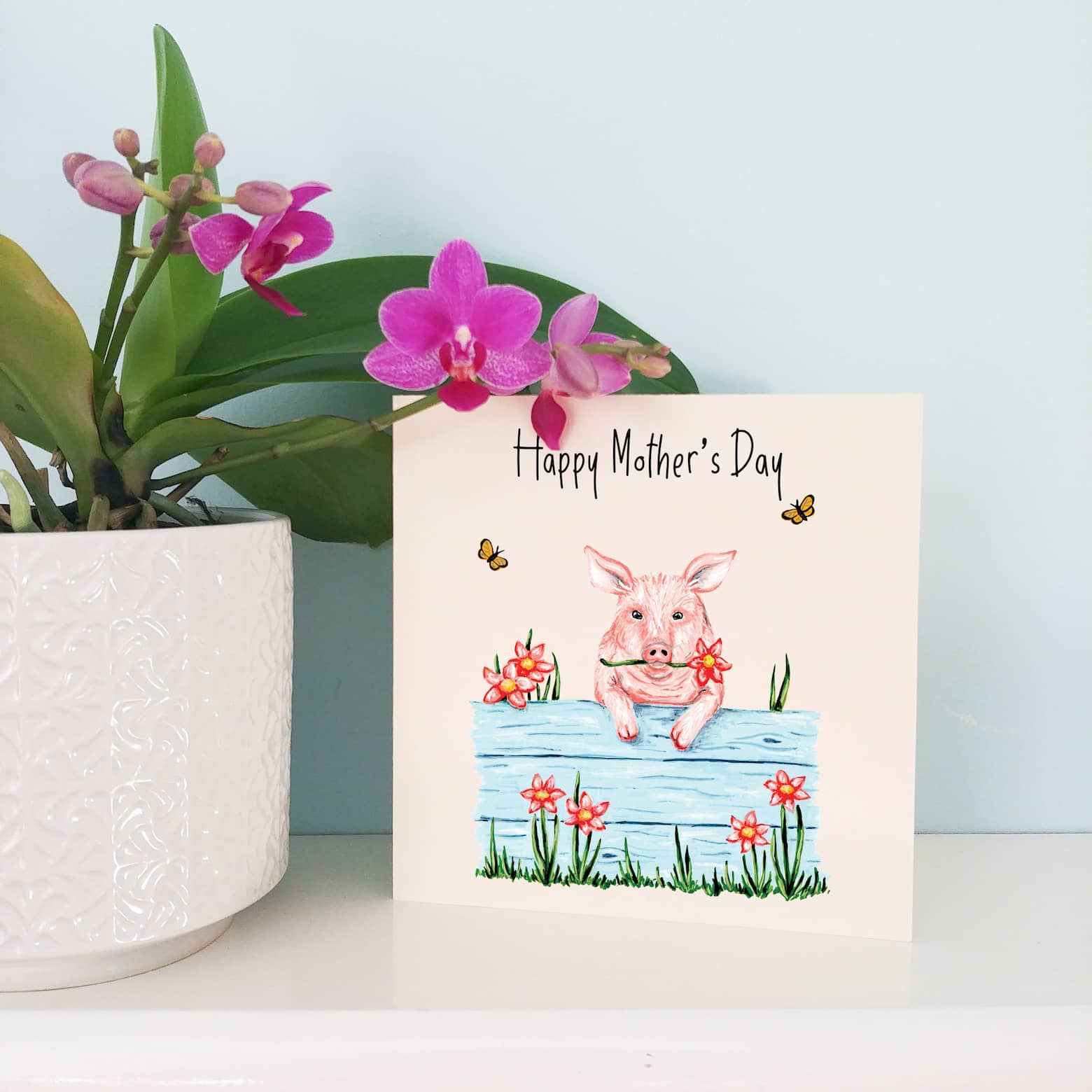This beautifully illustrated pig with flowers makes a lovely cute card for your mum this Mother's Day.