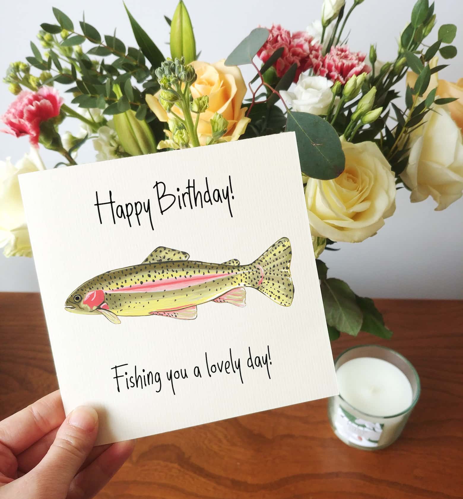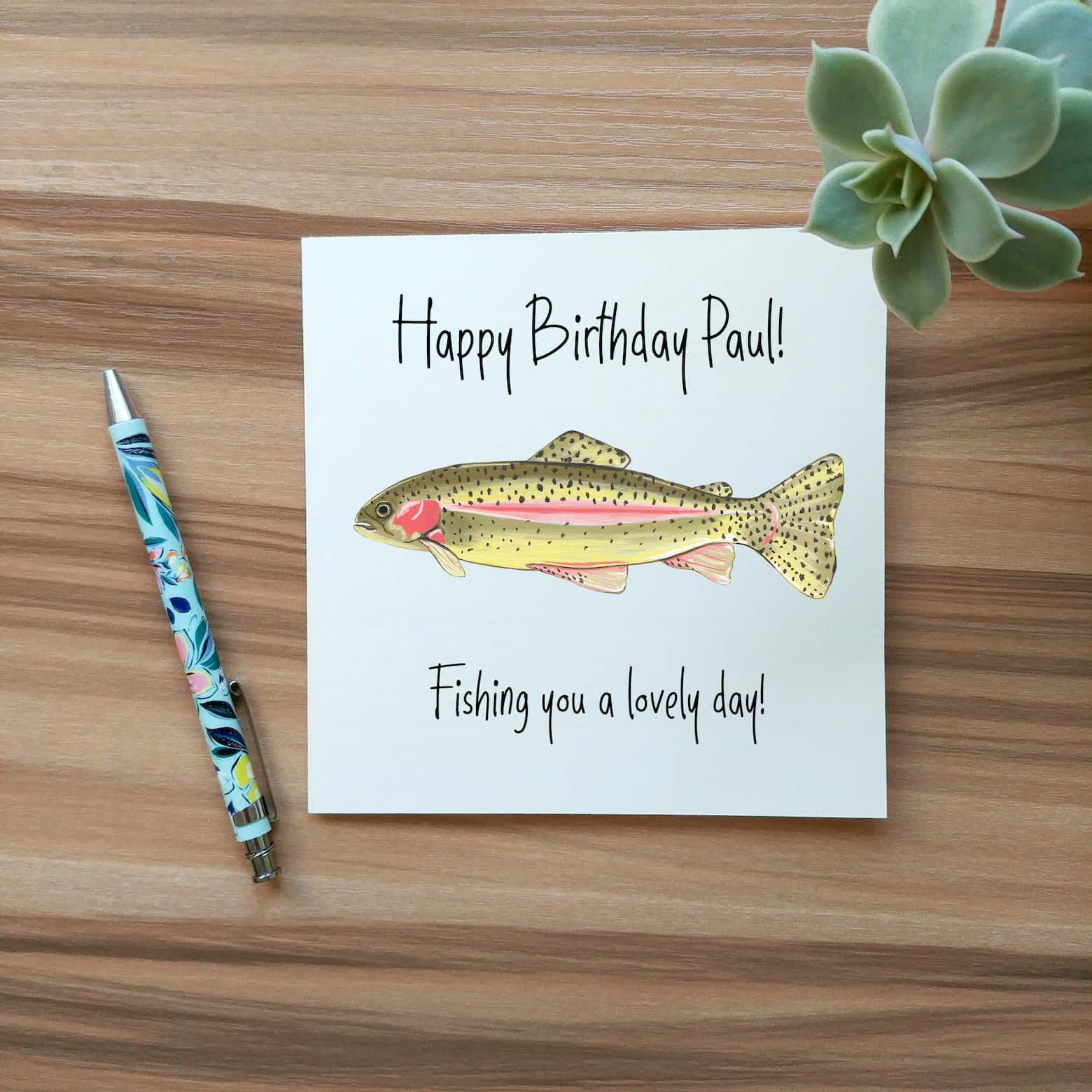 This rainbow trout birthday card is perfect for any fishing lovers in your life, and now with the option to add the recipient’s name.