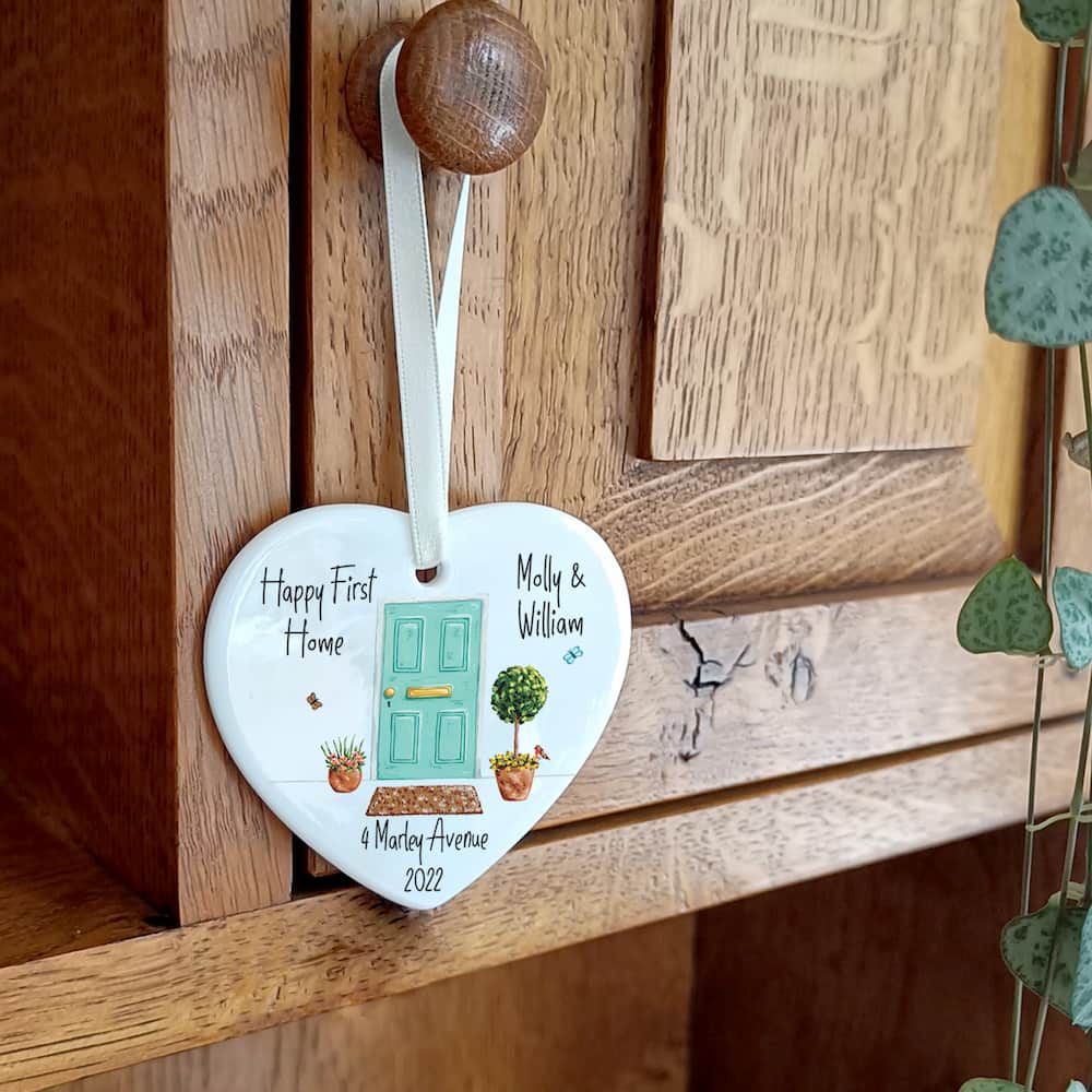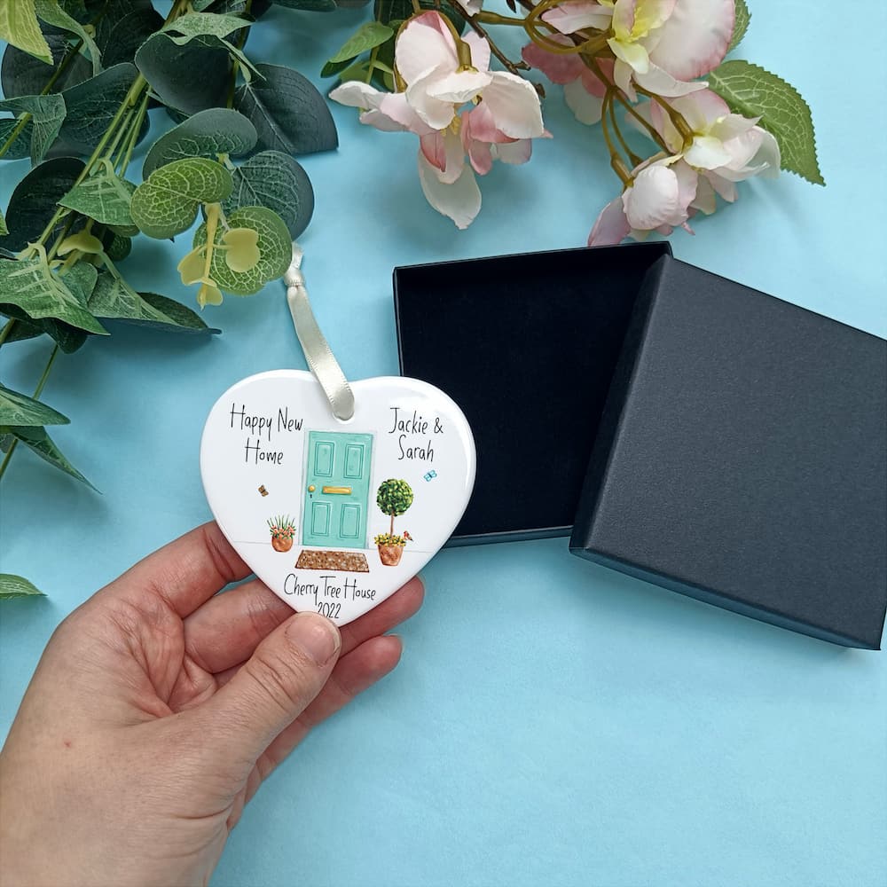 Ceramic ornaments are heart shaped, roughly 7.4 cm by 6.9 cm and are flat, print is only on one side. Comes with a 0.7cm by 25cm cream ribbon. Print shows Laura's hand-painted front door with the choice of text 'Happy New Home,' or 'Happy First Home' and you can then add the home owners names, the house number and road name with the year you moved in.
