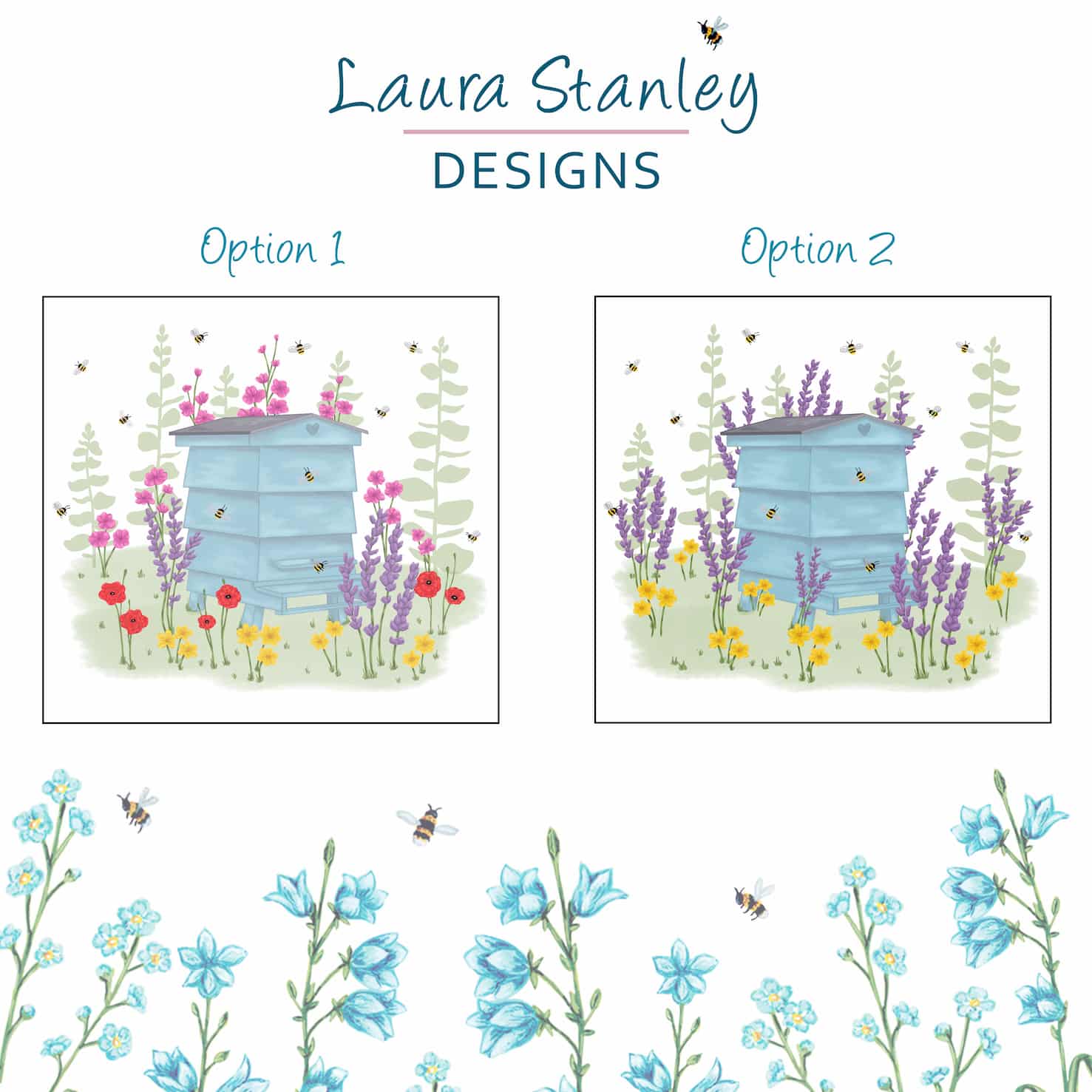 This new home greeting card features a digital print of Laura's hand-drawn bee hive with lots of flowers and bumble bees.
