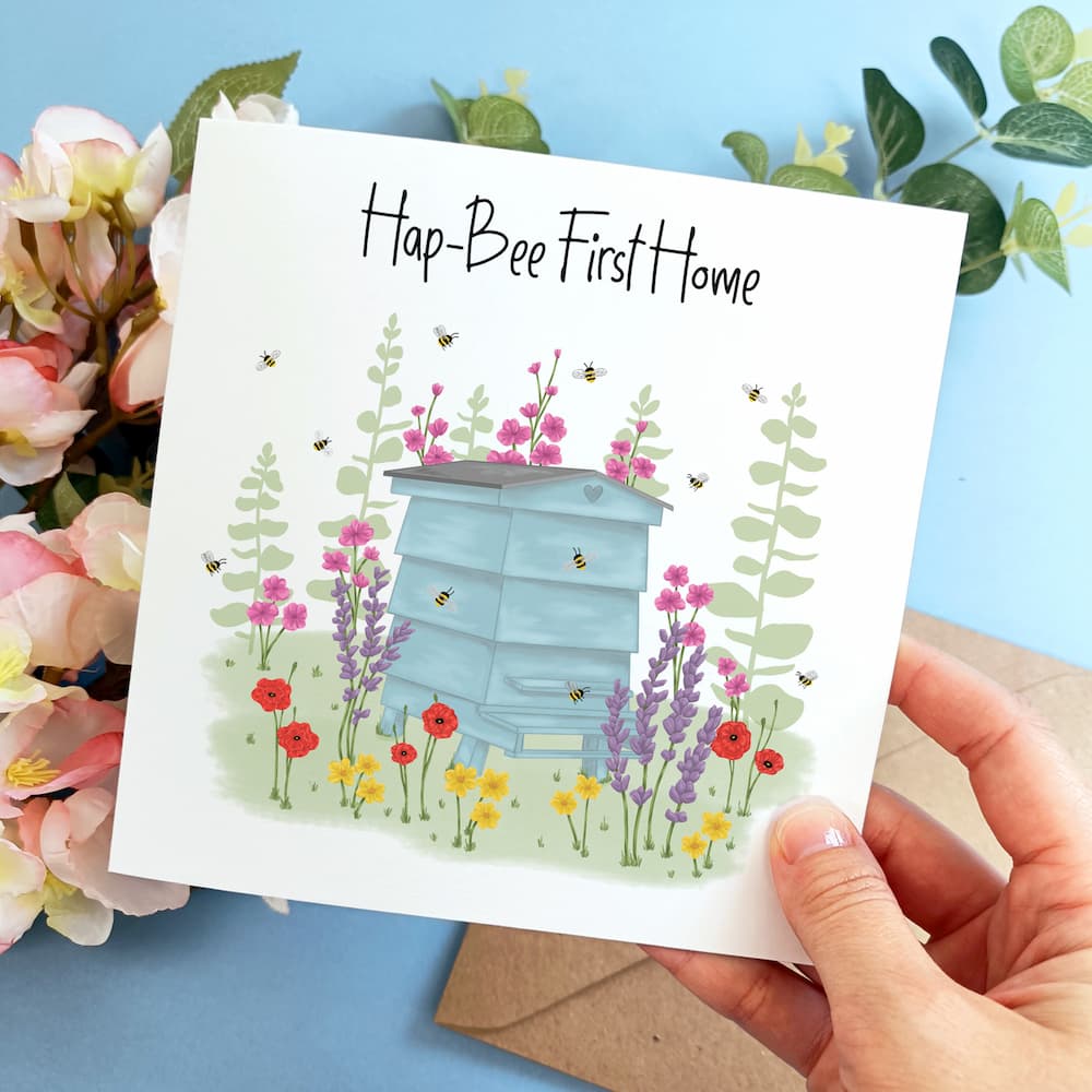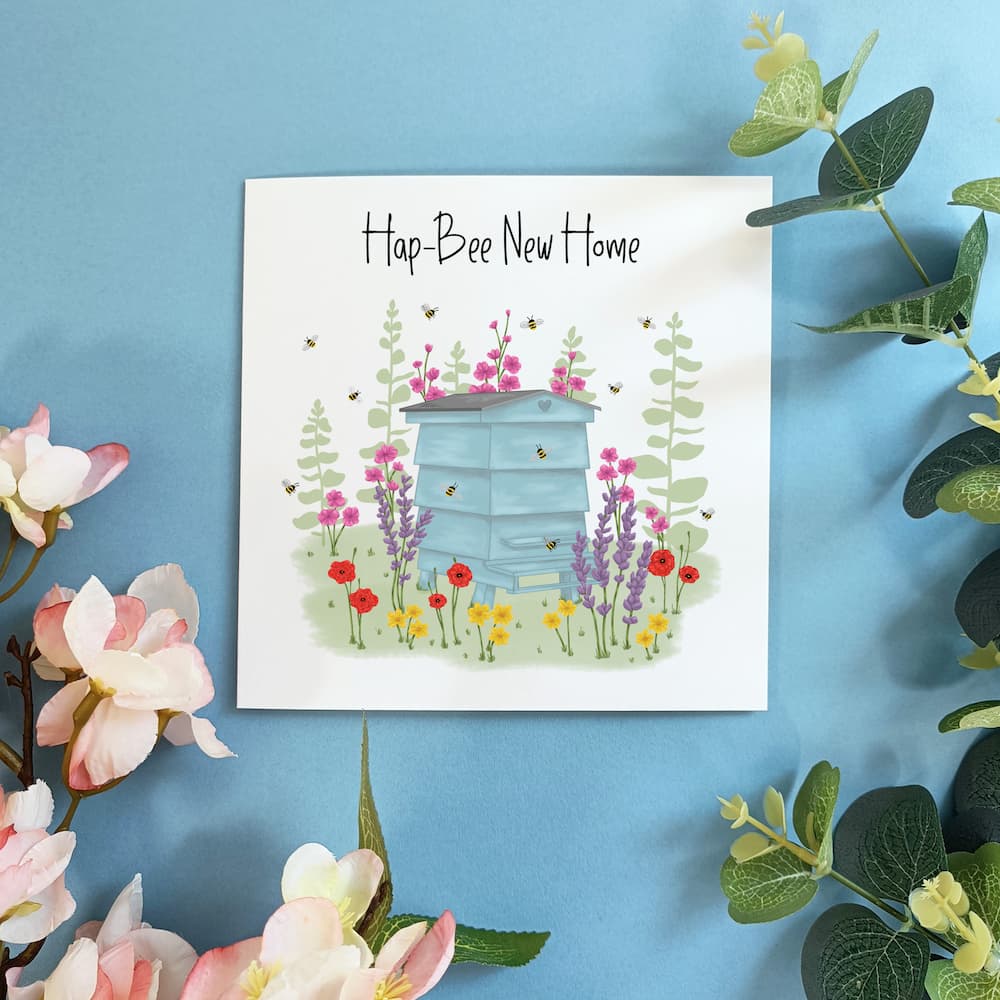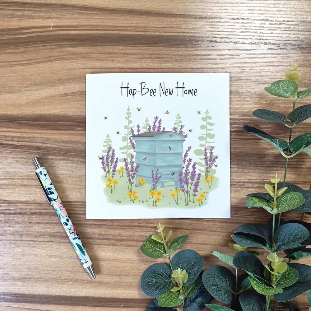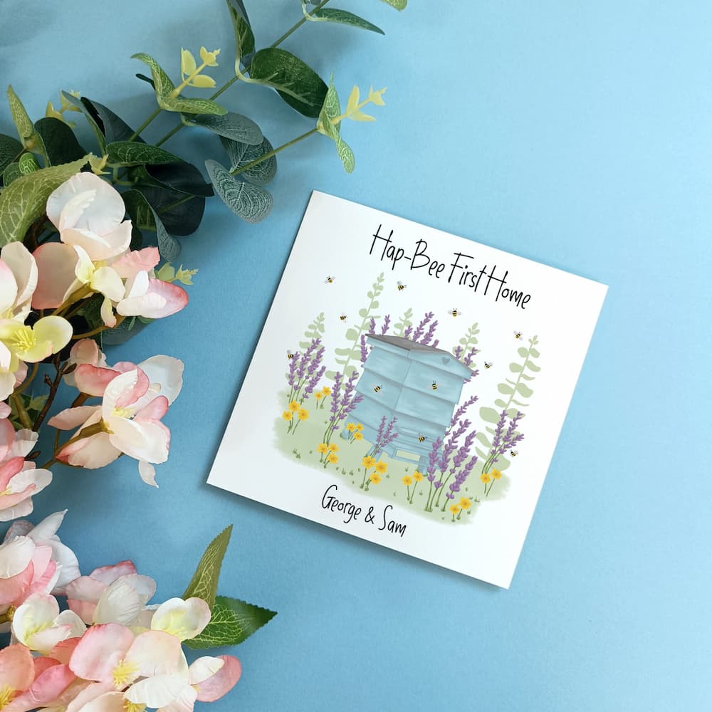 Choose between two designs and the text 'Hap-Bee New Home' or 'Hap-Bee First Home'. You can also add names to the card by typing them into the personalisation box.