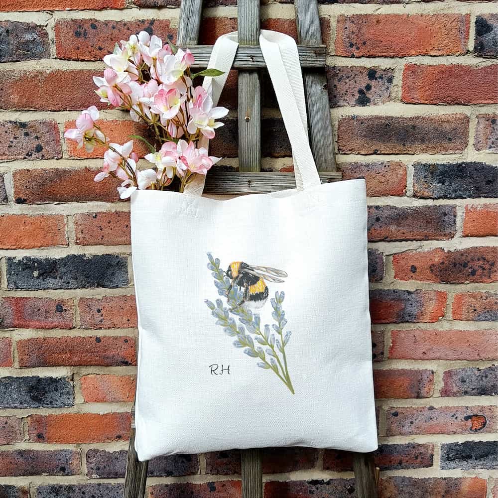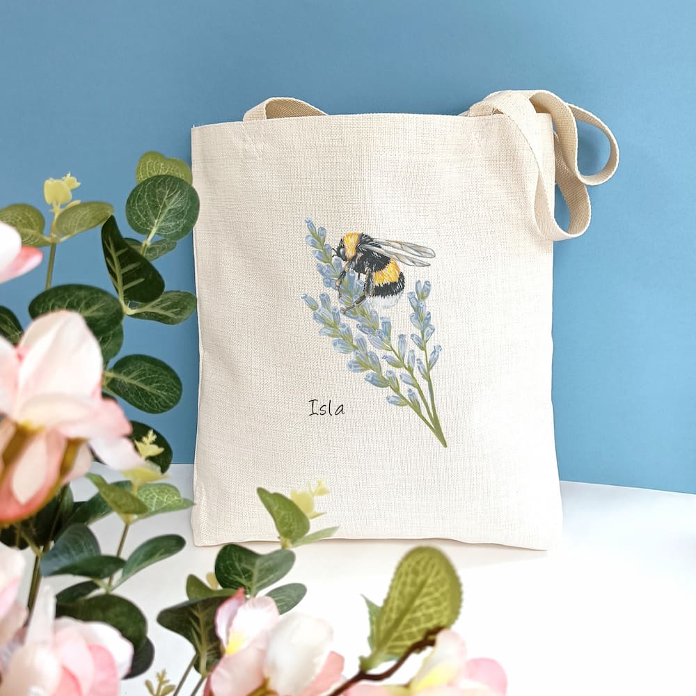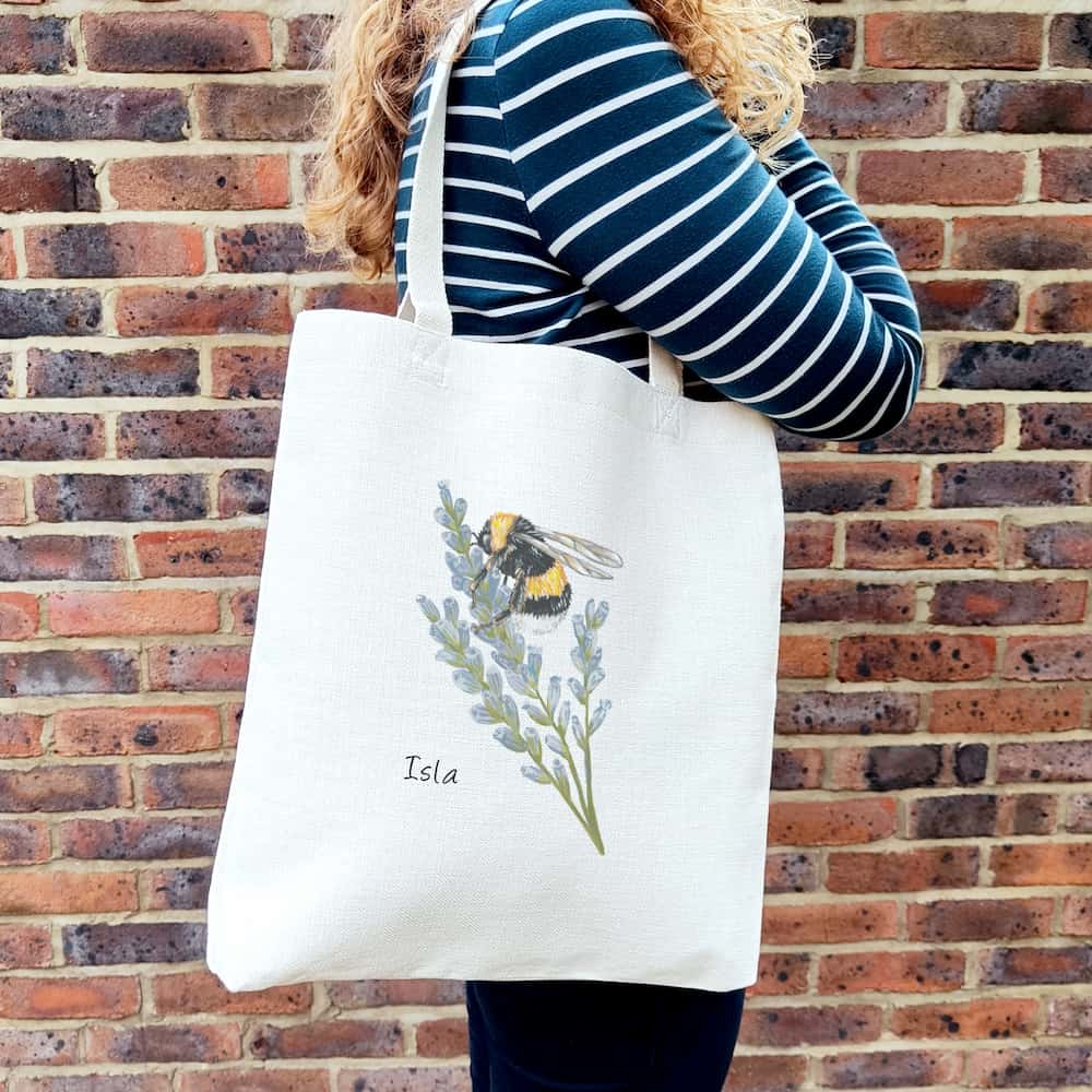 These tote bags make a lovely gift for anyone, you can even add their name or initials to make it extra special, with a beautifully illustrated bumble bee on lavender.