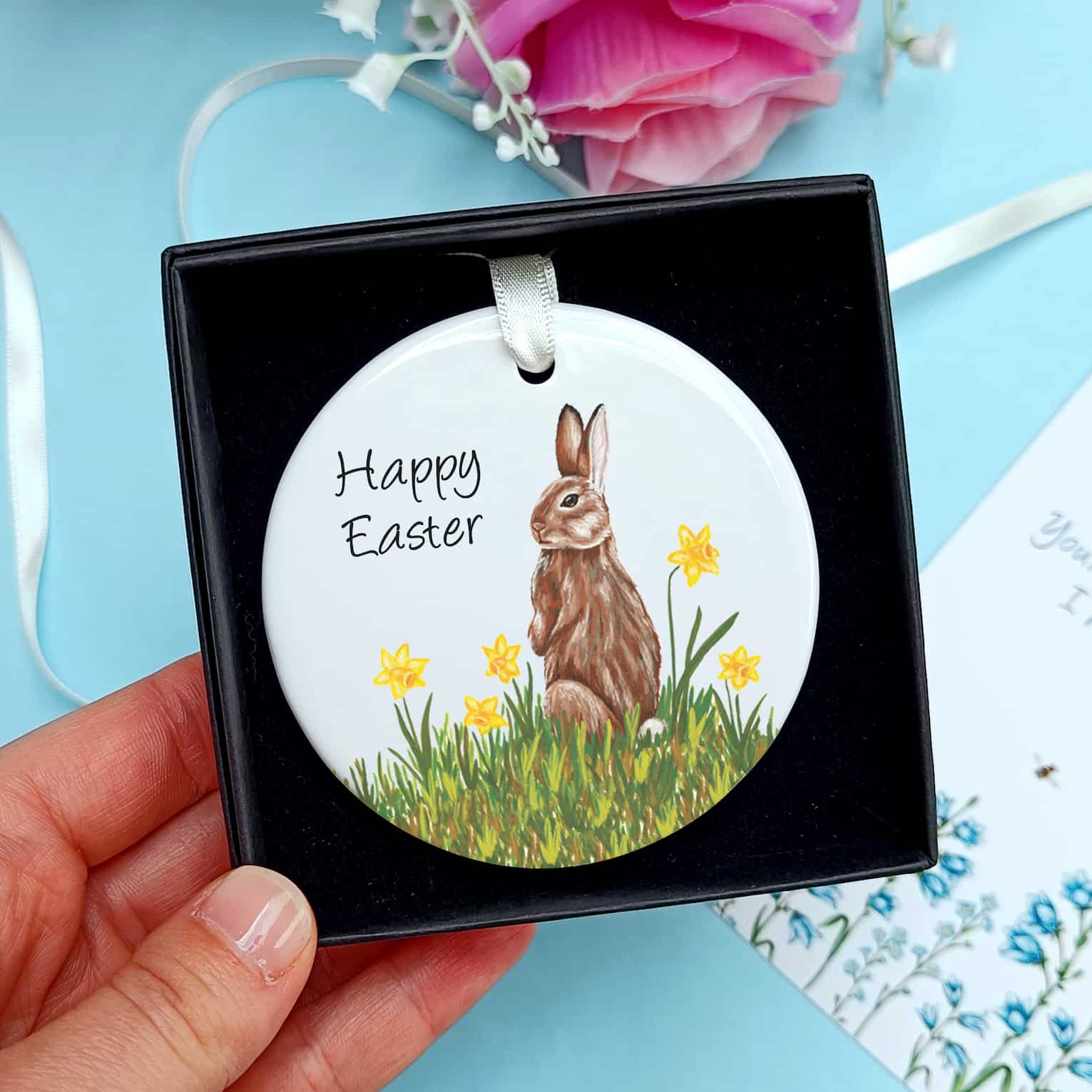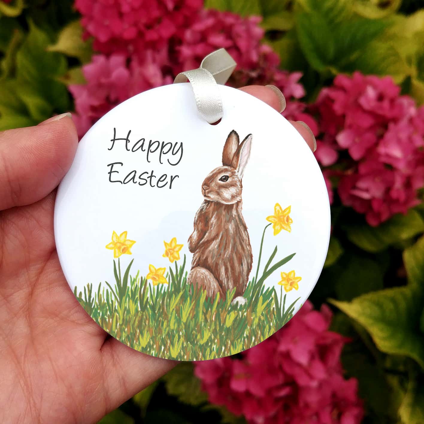 Print shows Laura's rabbit and daffodils illustration with the text 'Happy Easter'.