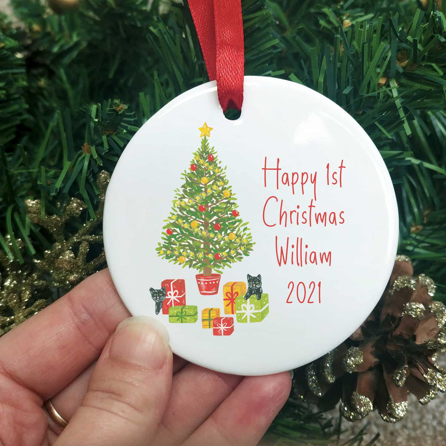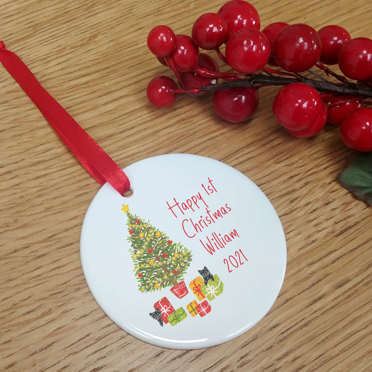 Remember your baby's first Christmas with this lovely keepsake decoration that can be personalised with a name and date. Keep it for years to come as a special reminder. Decorate your home or tree with this beautifully illustrated hanging ornament.