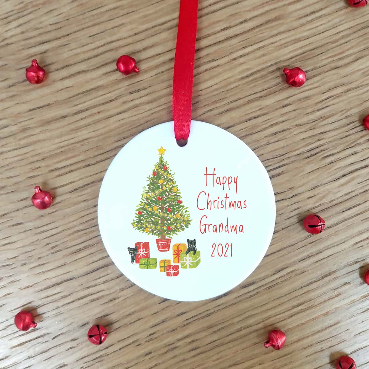 Ceramic ornaments are 7cm by 7cm and are flat, print is only on one side. Comes with a 0.7cm by 25cm cream ribbon. Print shows Laura's hand-painted Christmas Tree with cats and presents with the text of your choice.