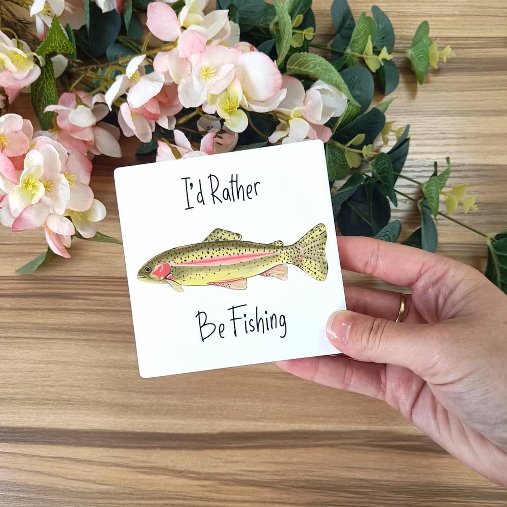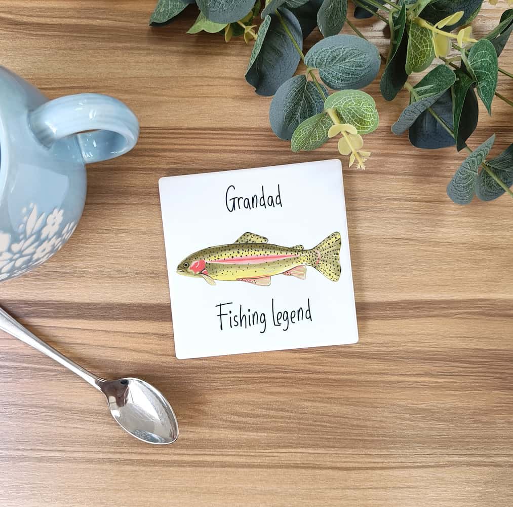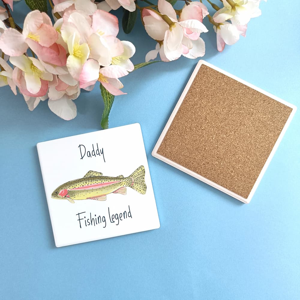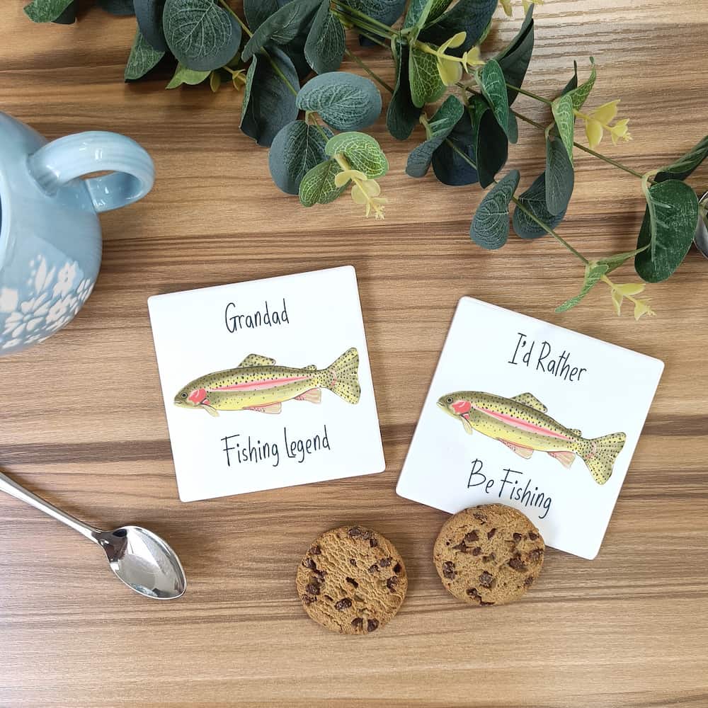 Square ceramic coasters are 9.8cm by 9.8cm with a smooth glossy finish and a cork bottom. Print shows a rainbow trout fish.
