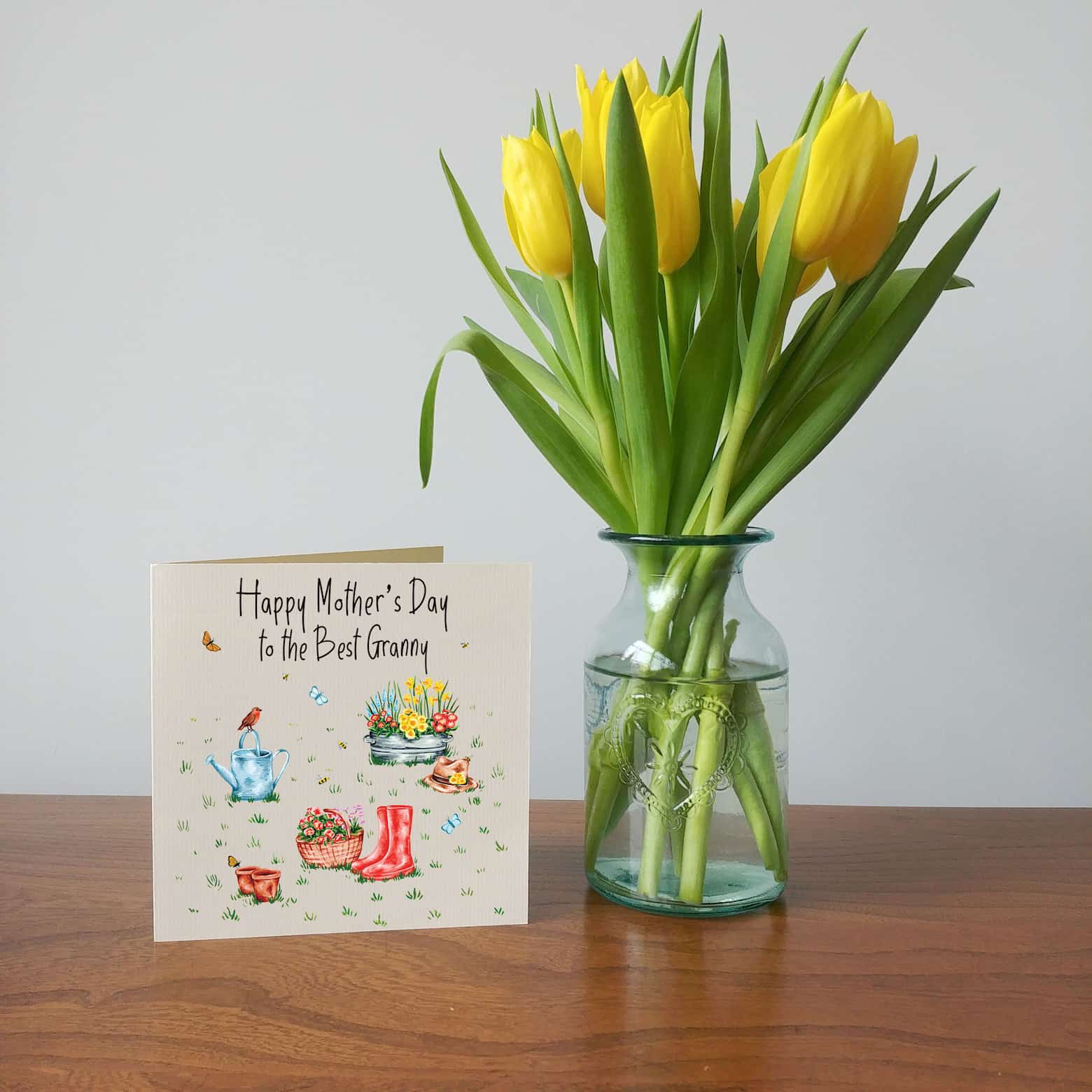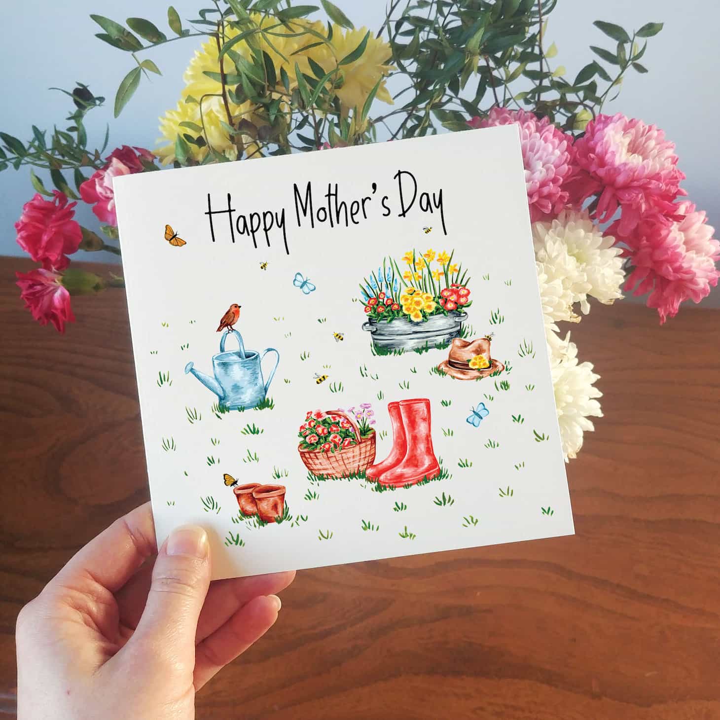 This beautifully illustrated floral garden scene makes a lovely bright card for your mum this Mother's Day.