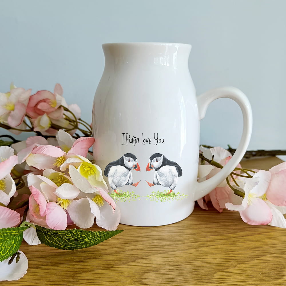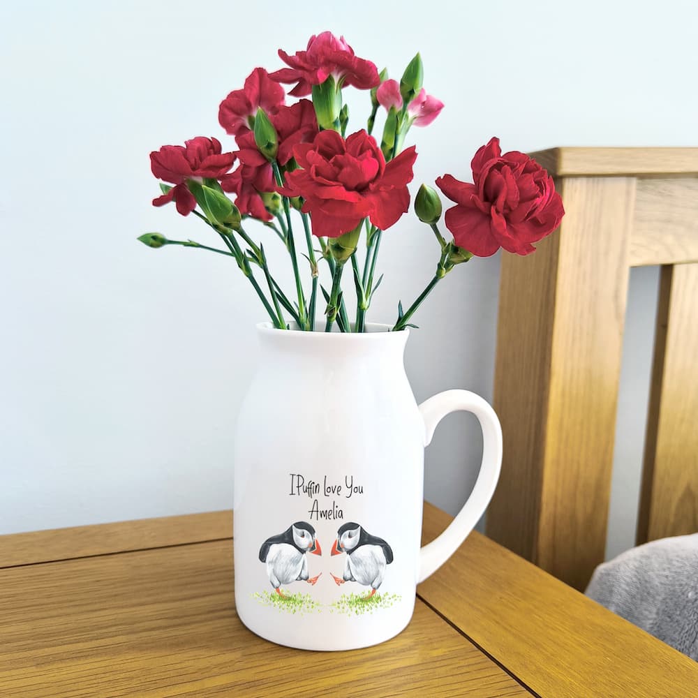 Show your love with our charming personalised I Puffin Love You Vase! This unique Dancing Puffin Flower Jug is the perfect gift for anniversaries or special occasions. Surprise her with this beautiful Flower Vase.