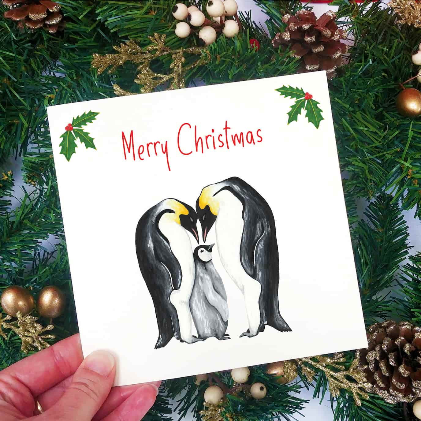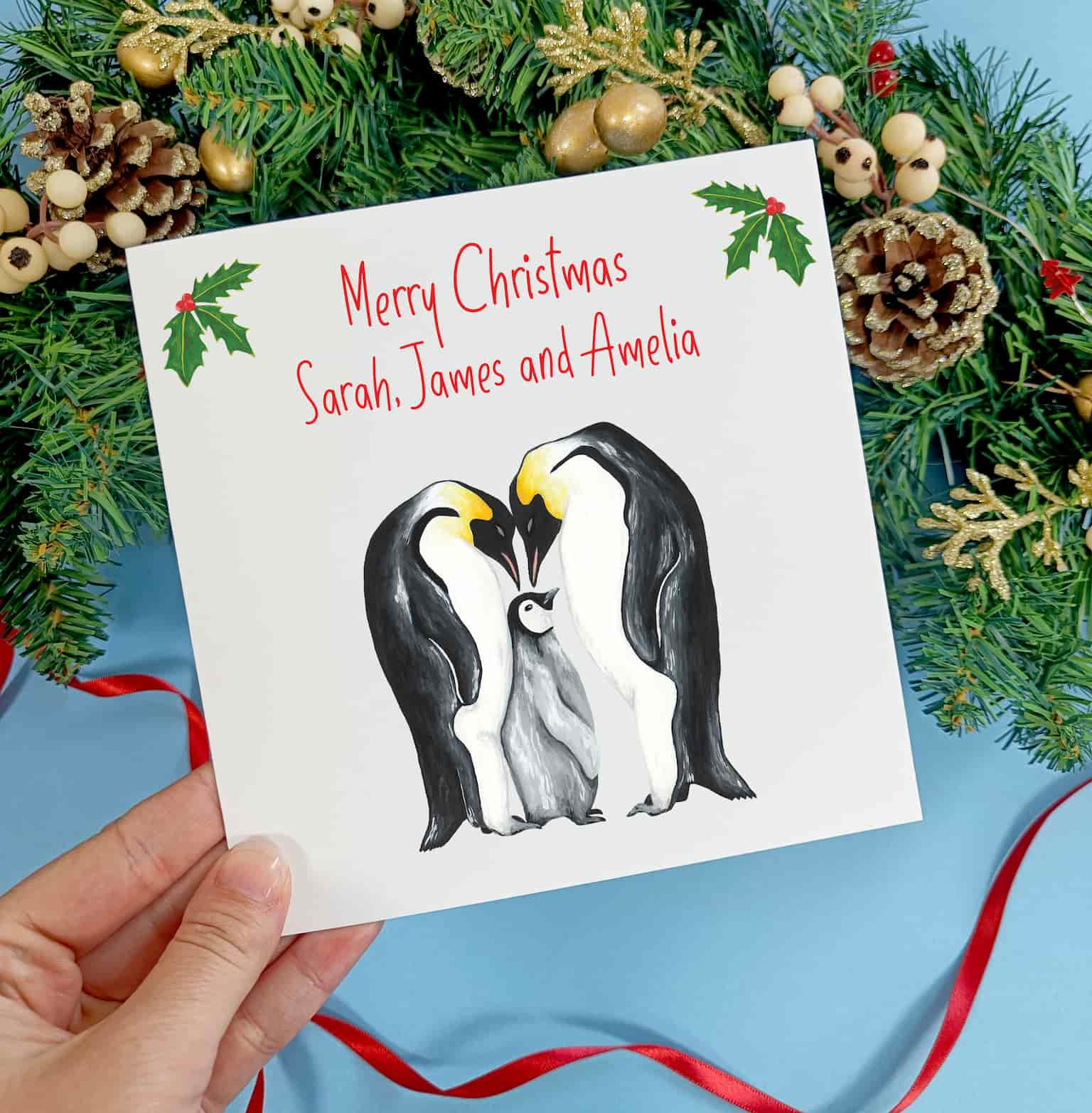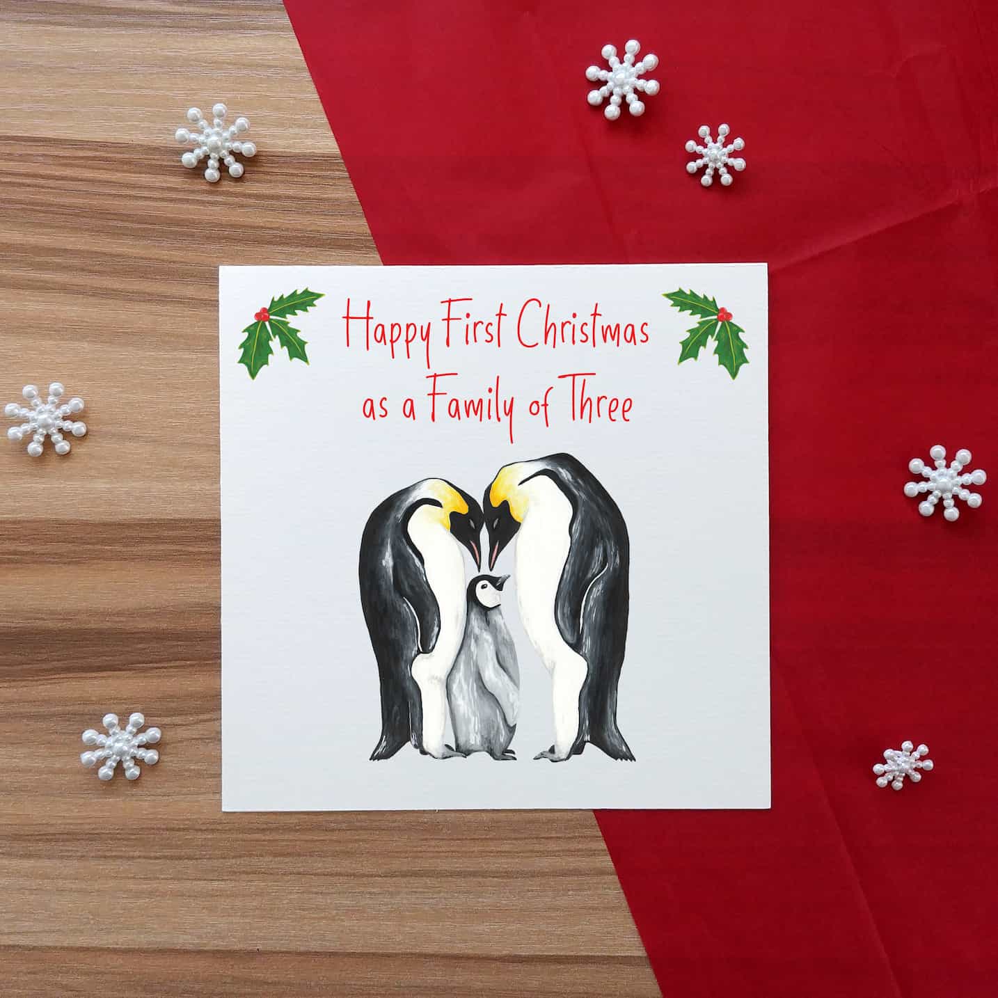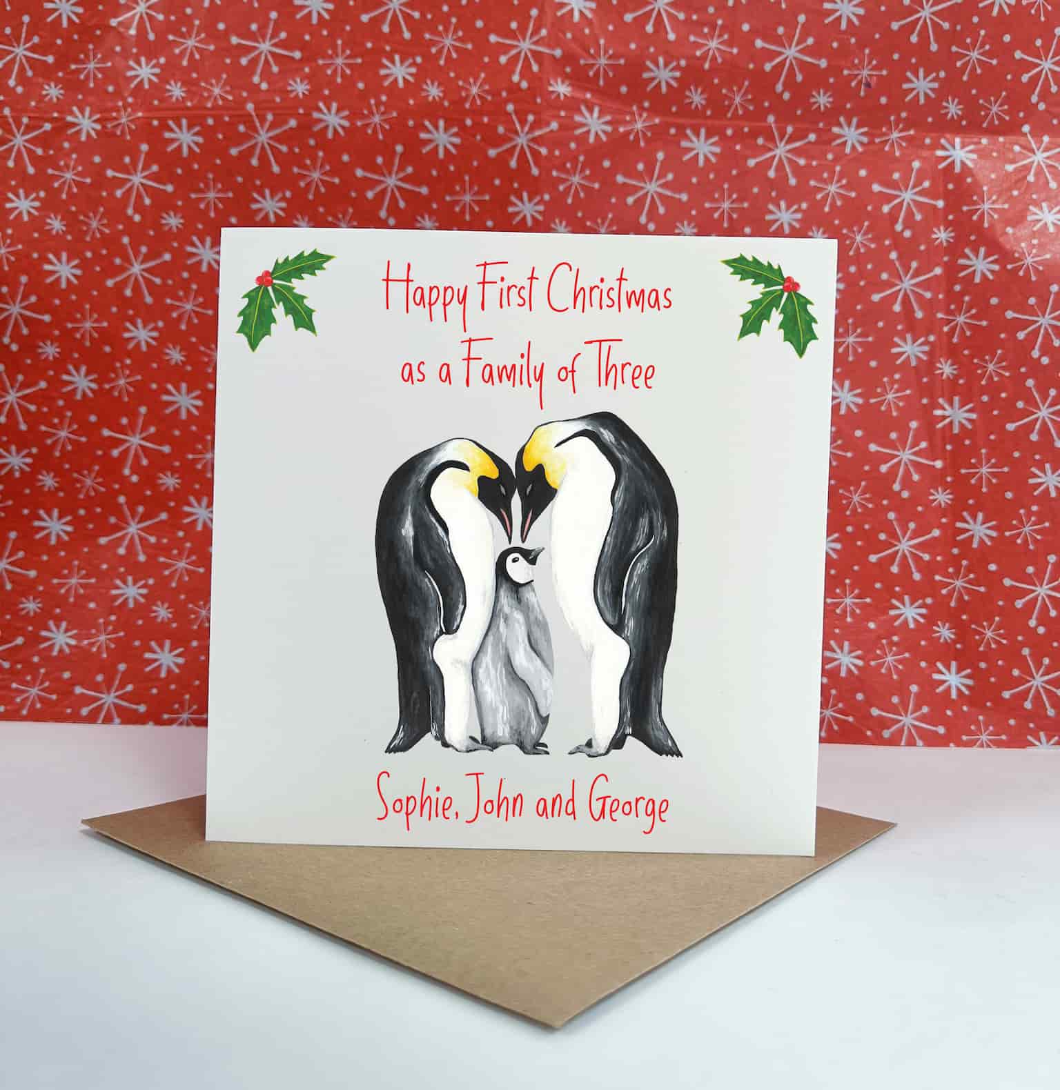 Option to change the text on the front, choose between 'Merry Christmas', Happy First Christmas as a Family of Three' with the option to add the recipients name to both of these.