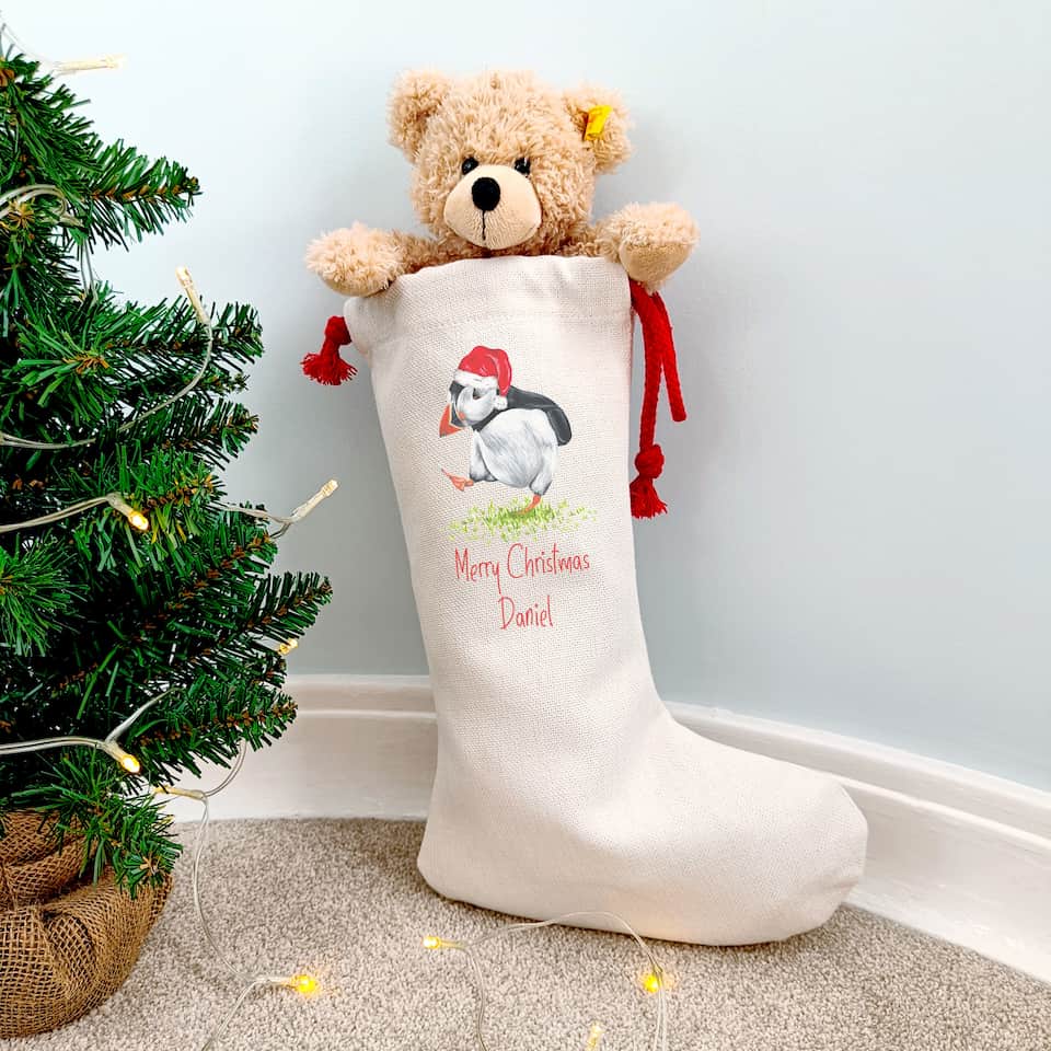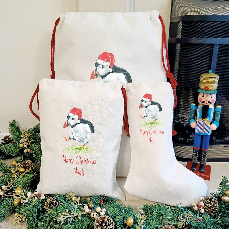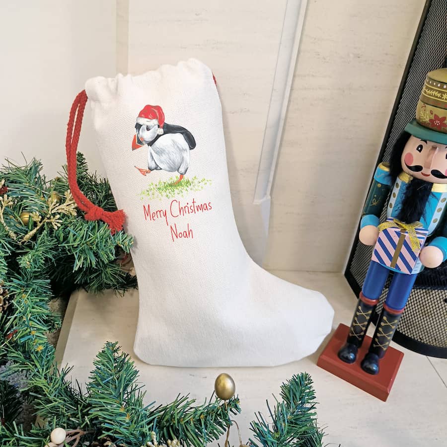 Make gifting extra special this holiday season with our personalised Christmas stockings! Featuring puffin wearing a Father Christmas hat, this stocking will bring festive cheer to your home - and make your gift recipient feel extra special!
