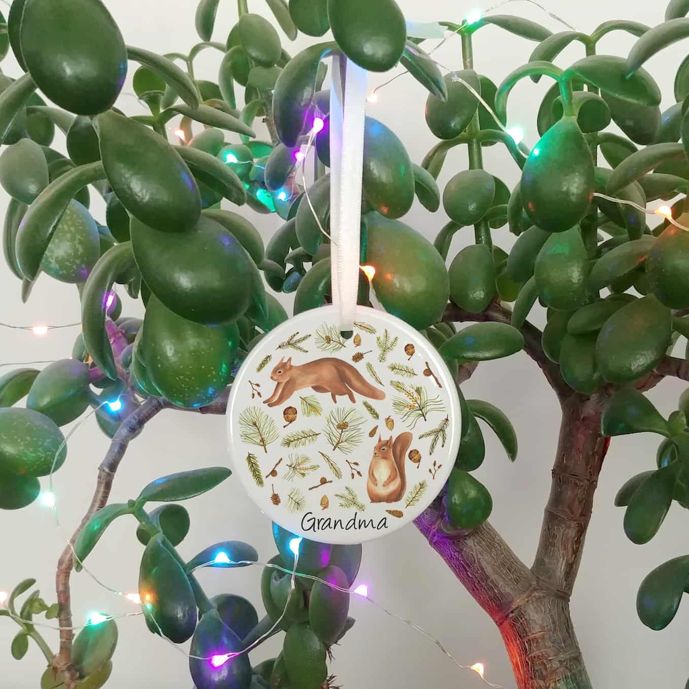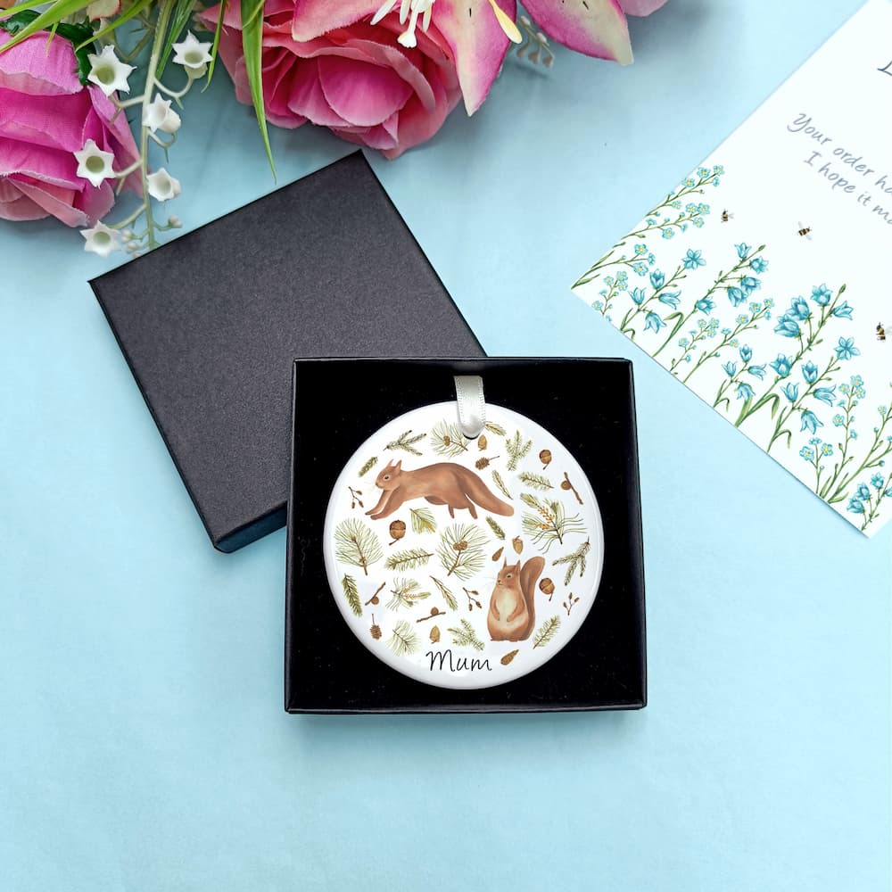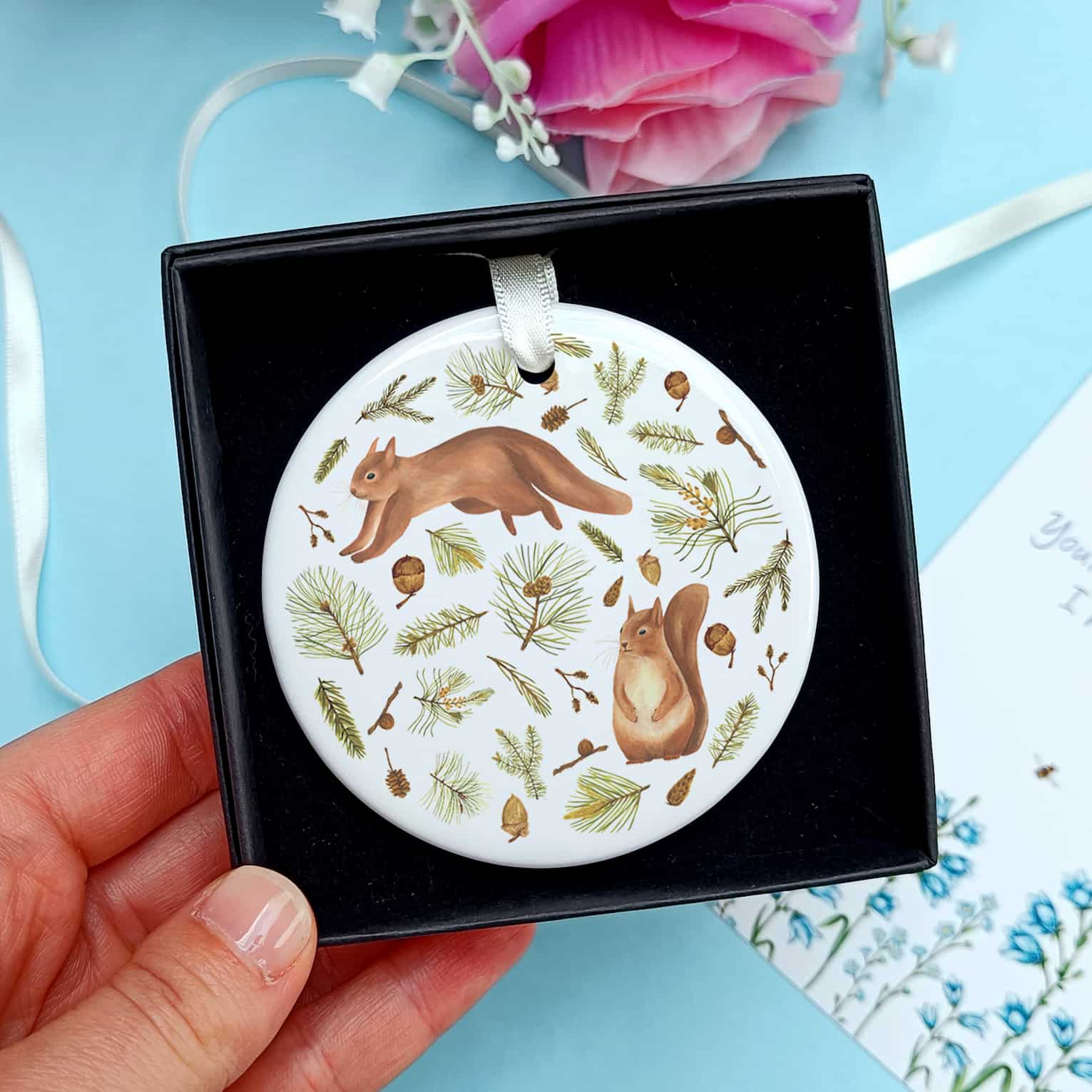 Ceramic ornaments are 7cm by 7cm and are flat, print is only on one side. Comes with a cream ribbon. Print shows Laura's hand-painted red squirrels, with acorns and leaves surrounding.