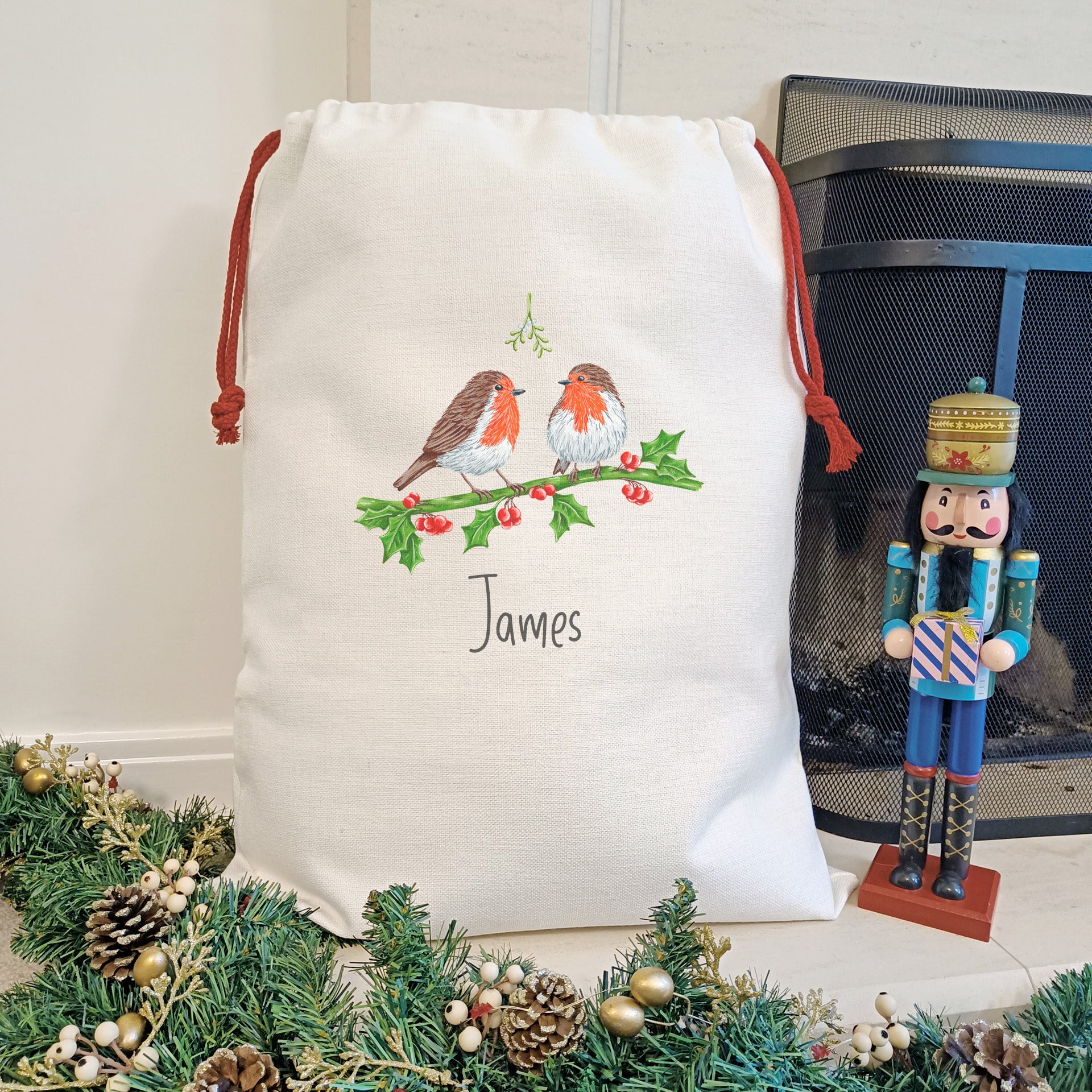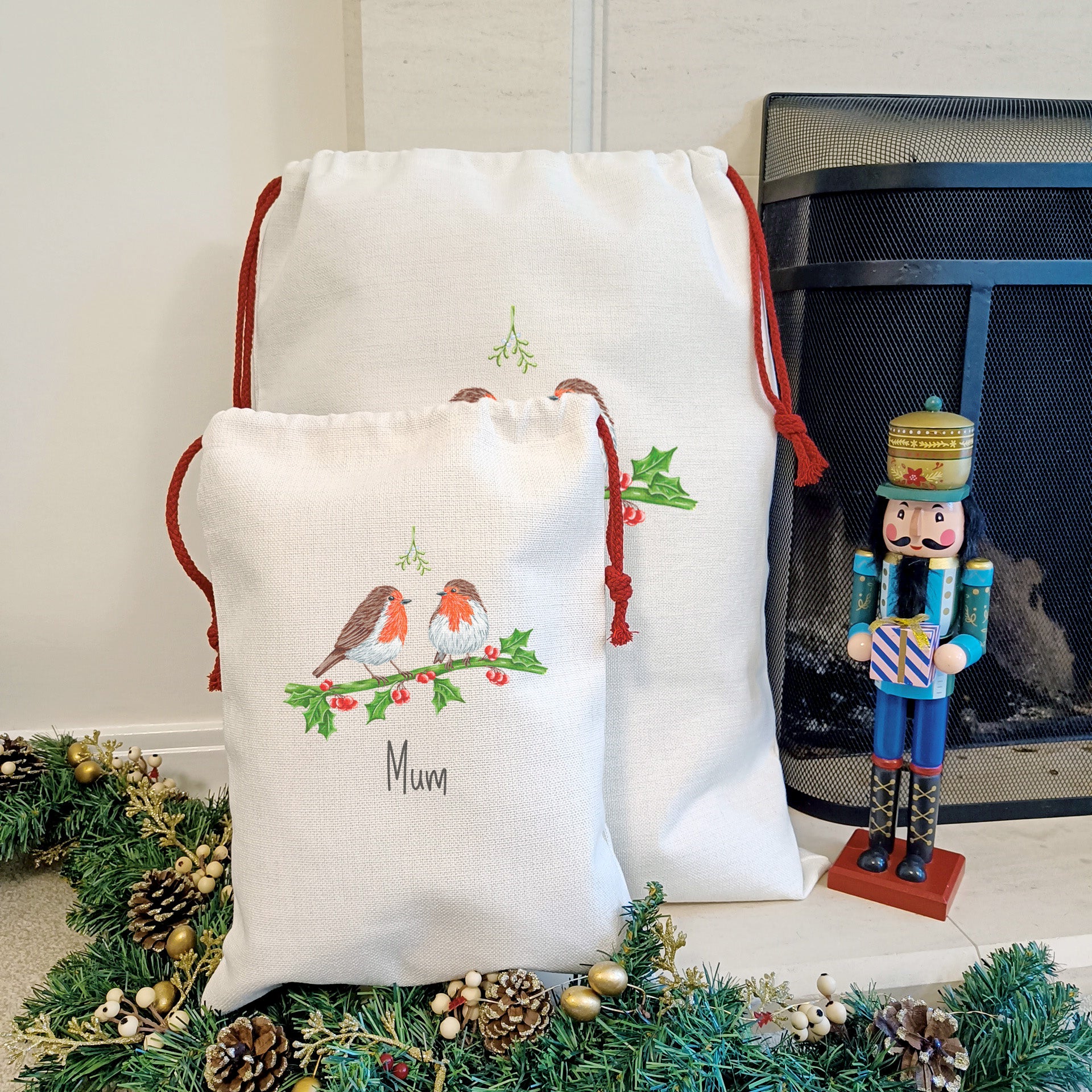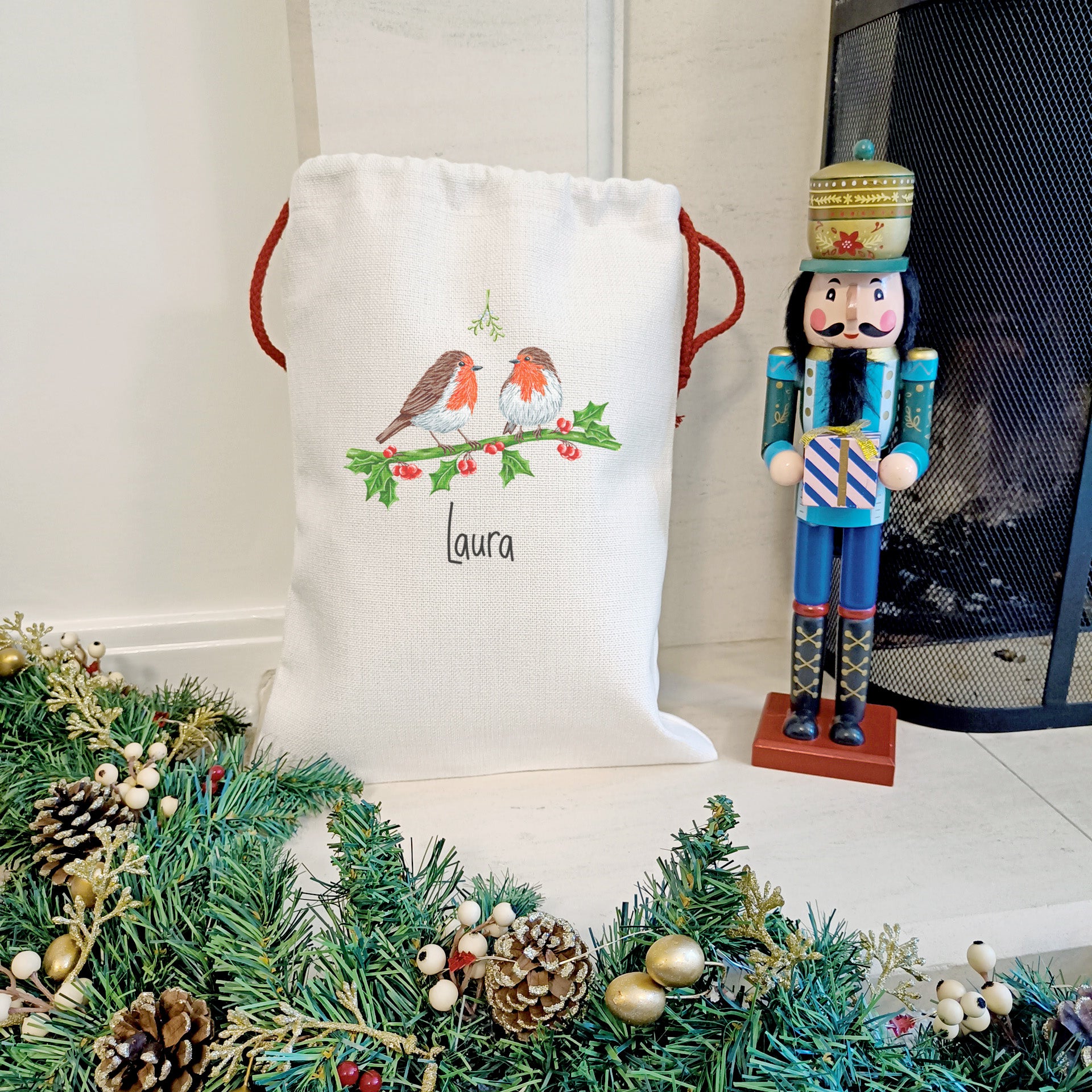 Get ready for a festive flutter of charm with our Robin Christmas Sack! This delightful design features a sweet robin couple nestled beneath a sprig of mistletoe, sharing a merry moment together. With their cosy red feathers and a touch of holiday magic, these lovebirds are ready to spread a little joy and a lot of cheer. Perfect for holding all your Christmas goodies, this sack is as heart-warming as a holiday hug. Wrap up your presents with a dash of whimsy, and let the robins bring a smile to your season!