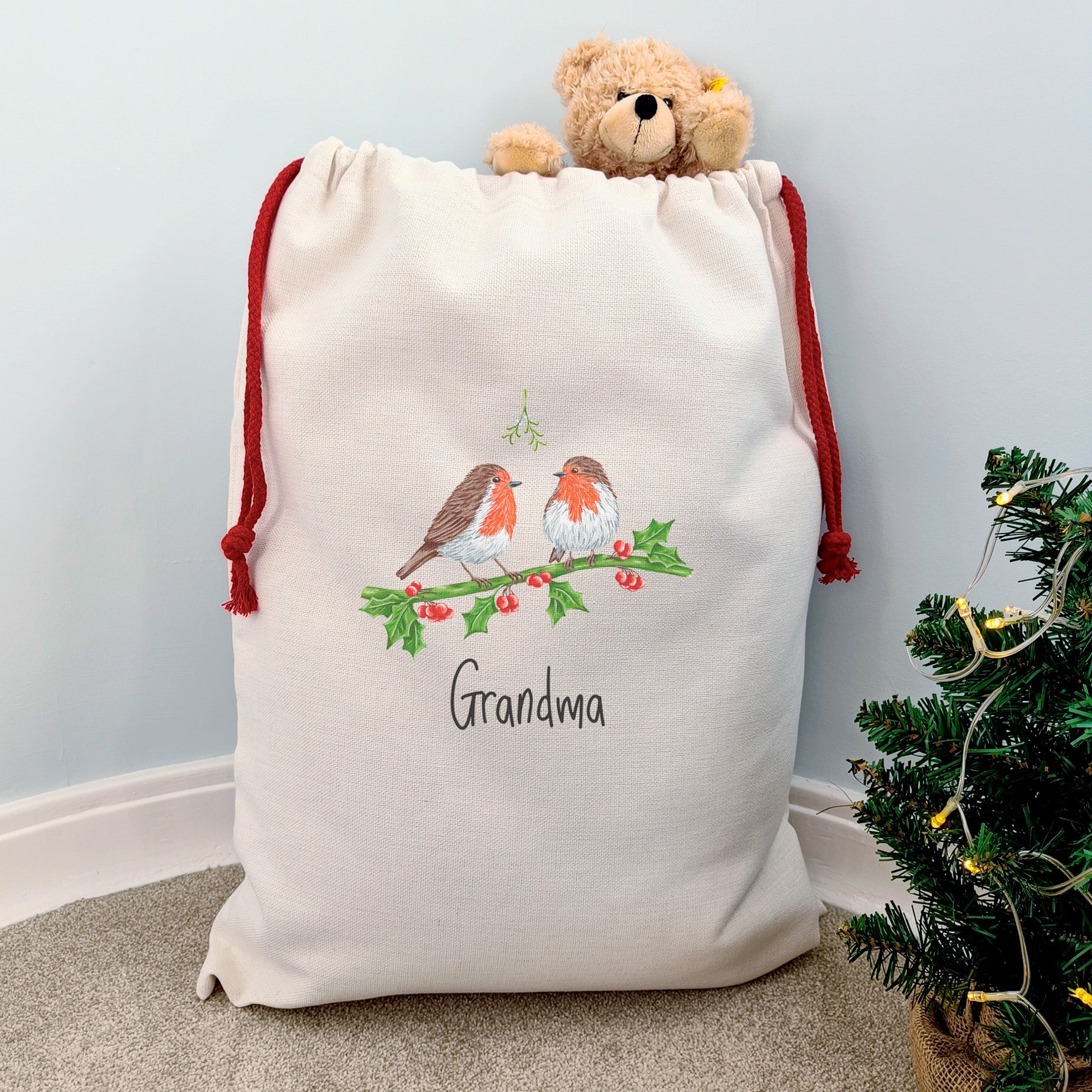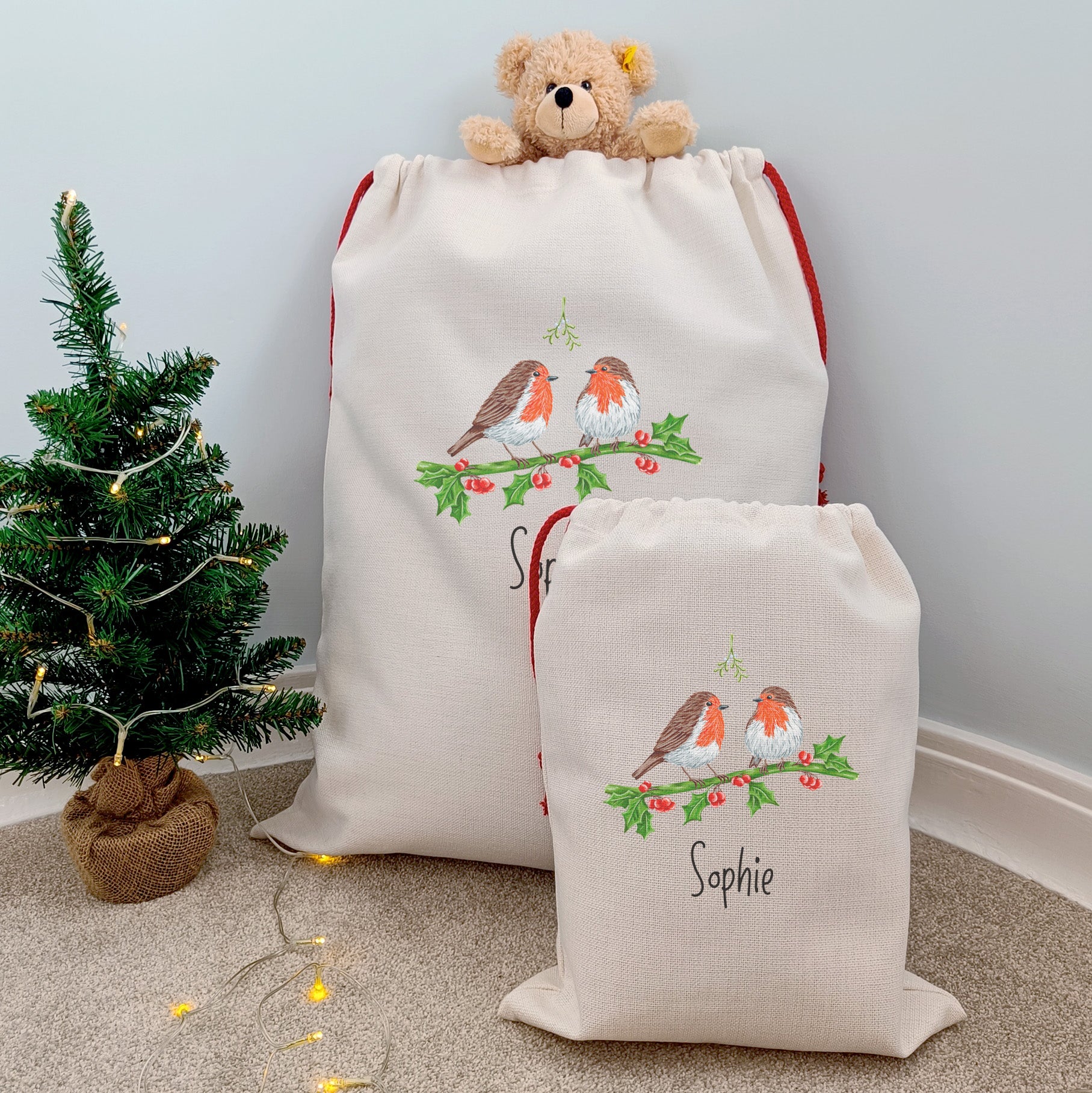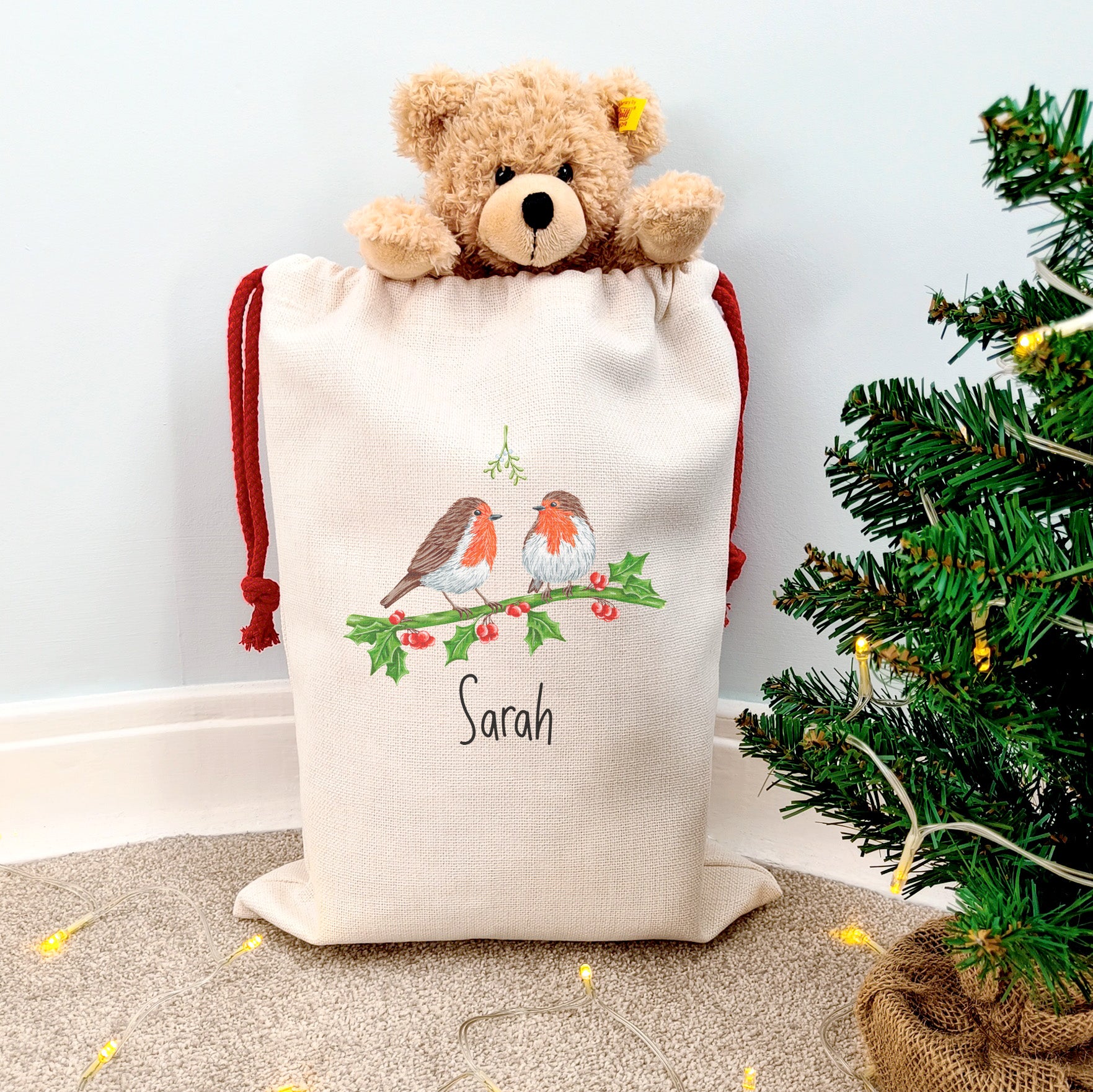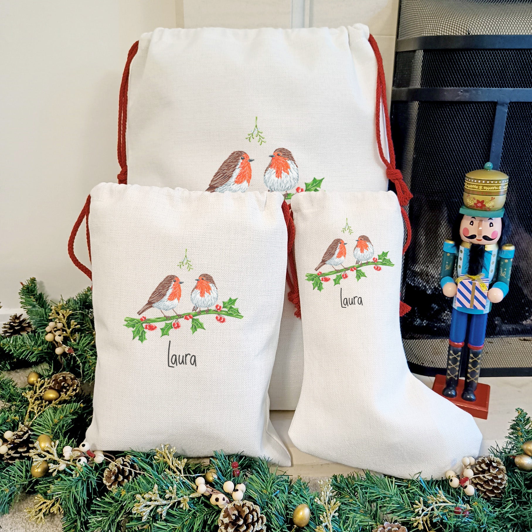 Get ready for a festive flutter of charm with our Robin Christmas Sack! This delightful design features a sweet robin couple nestled beneath a sprig of mistletoe, sharing a merry moment together. With their cosy red feathers and a touch of holiday magic, these lovebirds are ready to spread a little joy and a lot of cheer. Perfect for holding all your Christmas goodies, this sack is as heart-warming as a holiday hug. Wrap up your presents with a dash of whimsy, and let the robins bring a smile to your season!