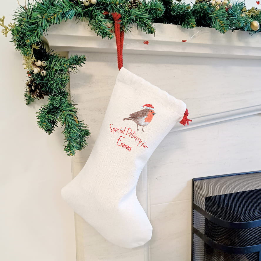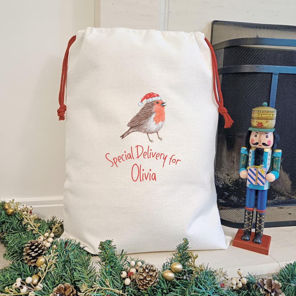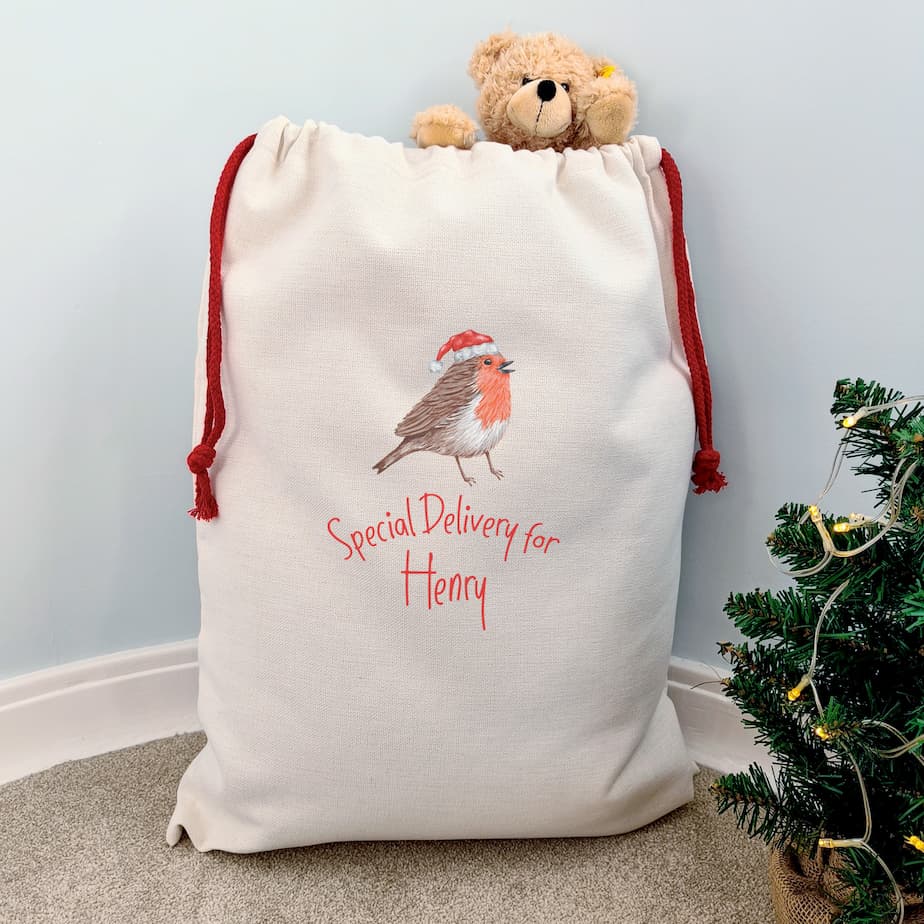 Get into the festive spirit with our Personalised Robin Christmas Sacks! These Father Christmas Sacks are perfect for custom gifting and feature a charming Robin wearing a Christmas hat. Spread some holiday cheer with our unique and playful sacks!