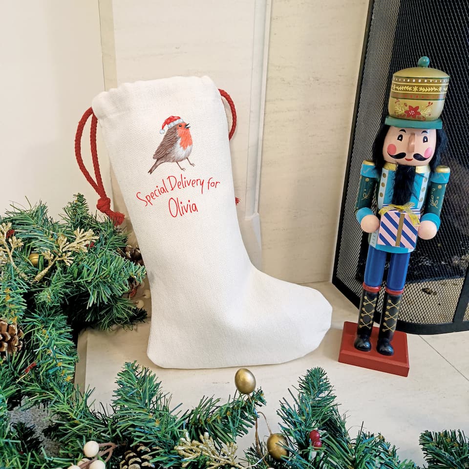 Give the gift of personalised holiday cheer with our Robin Christmas stocking! This unique stocking can be customised for a truly special delivery from Father Christmas. Perfect for those who appreciate a touch of uniqueness and fun in their Christmas décor.