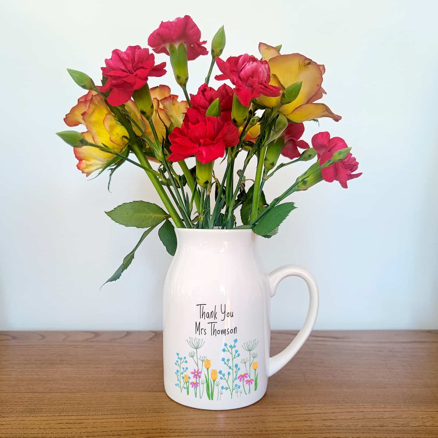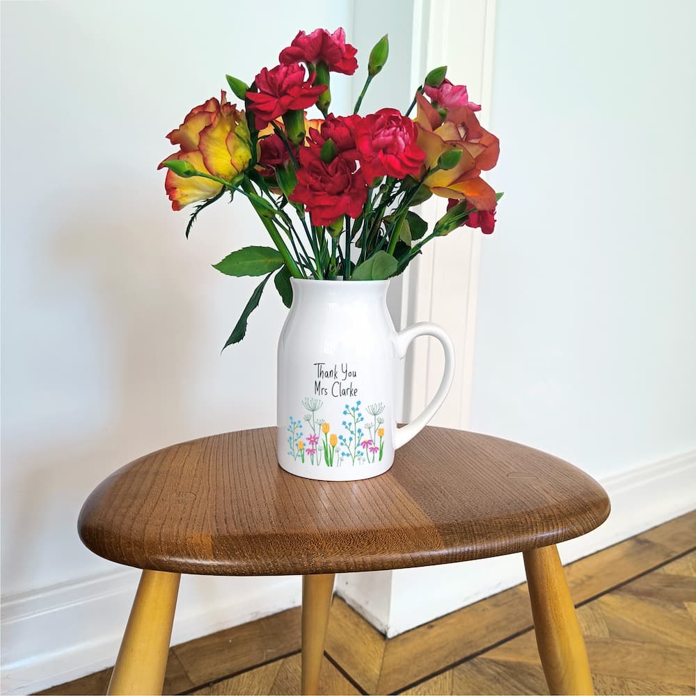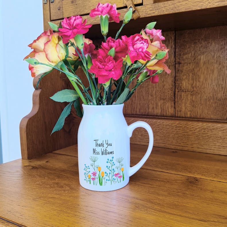 Show your appreciation with this personalised teacher gift! Perfect for thanking teachers or teaching assistants for their hard work, this flower vase is a unique and thoughtful way to say thank you. Great for end of term or as a leavers gift.