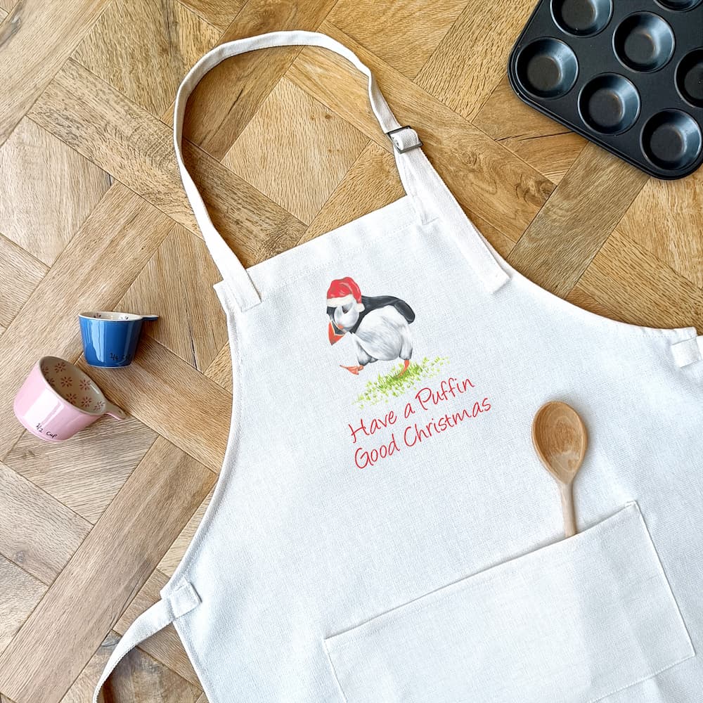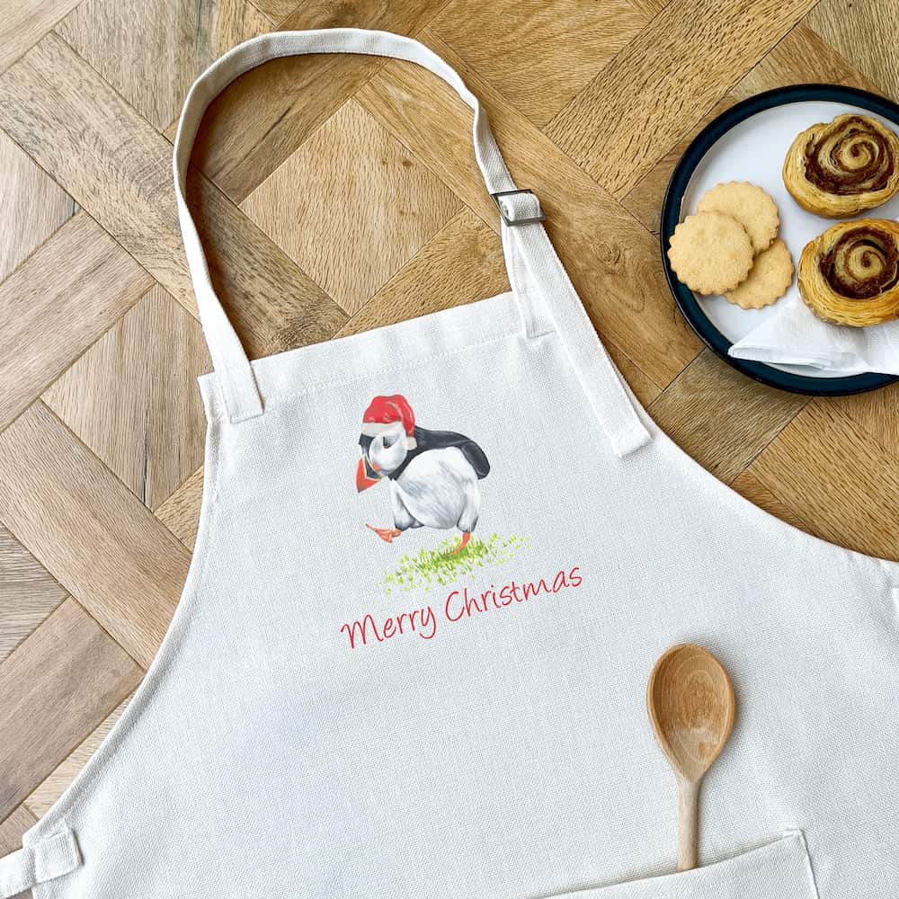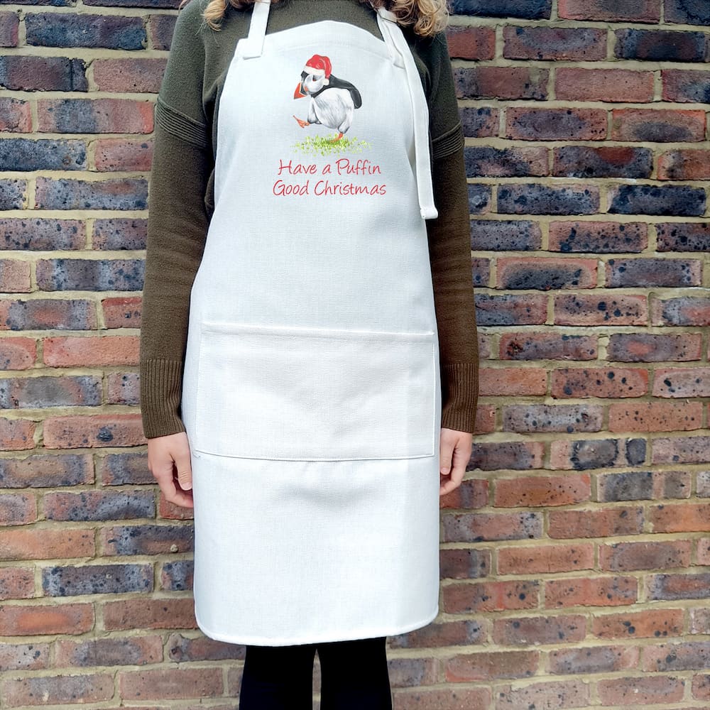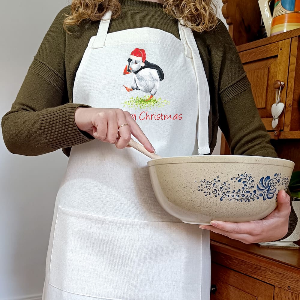 Protect your Christmas outfit in style this year with the festive puffin apron.