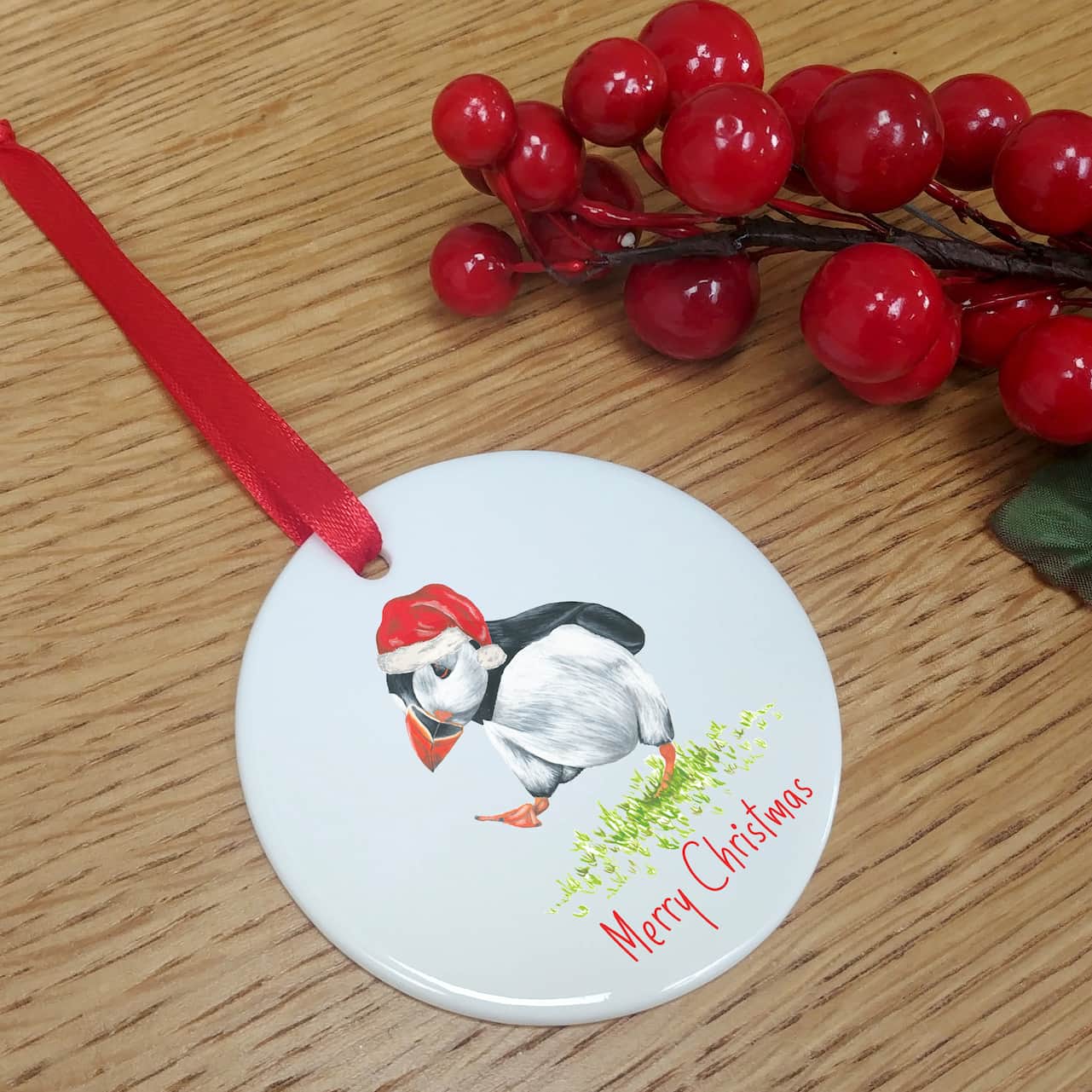 Ceramic ornaments are 7cm by 7cm and are flat, print is only on one side. Comes with a 0.7cm by 25cm red ribbon. Print shows Laura's hand-painted dancing puffin with a Santa's hat.
