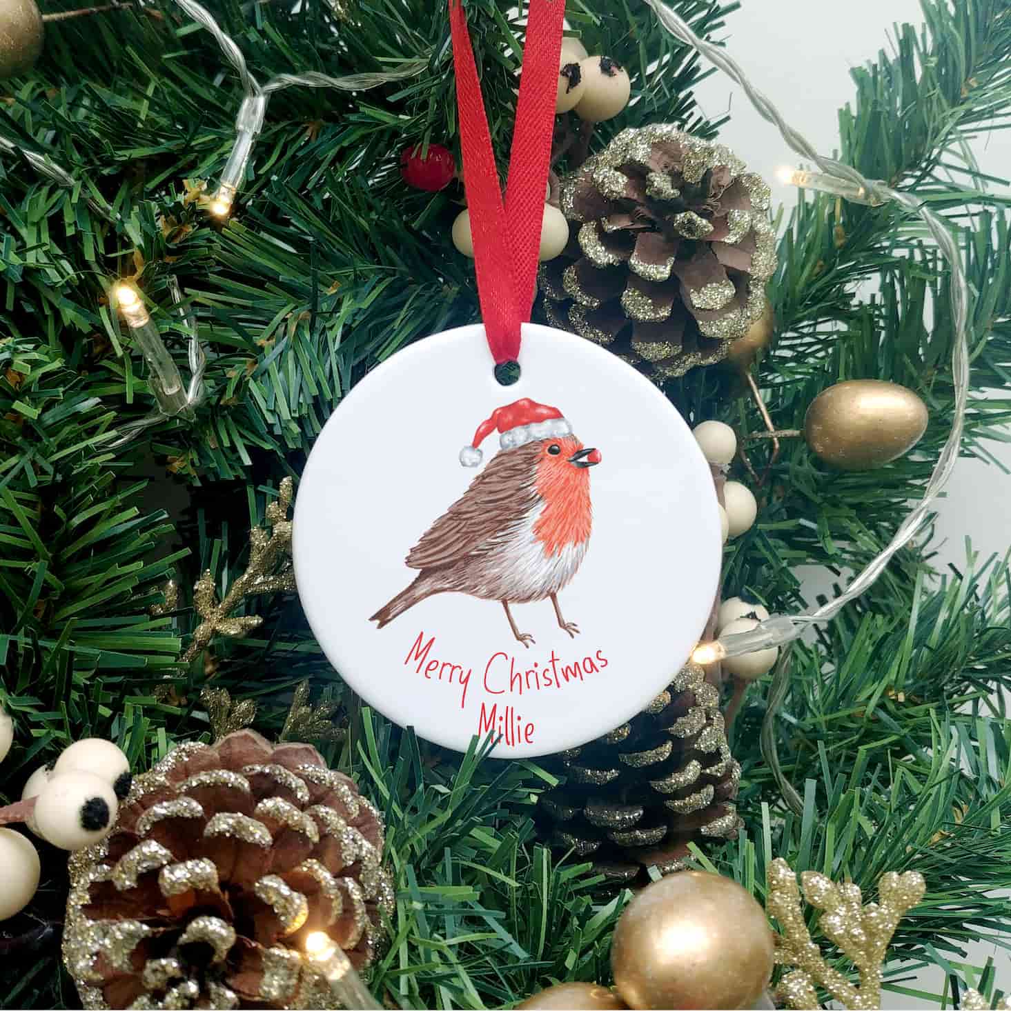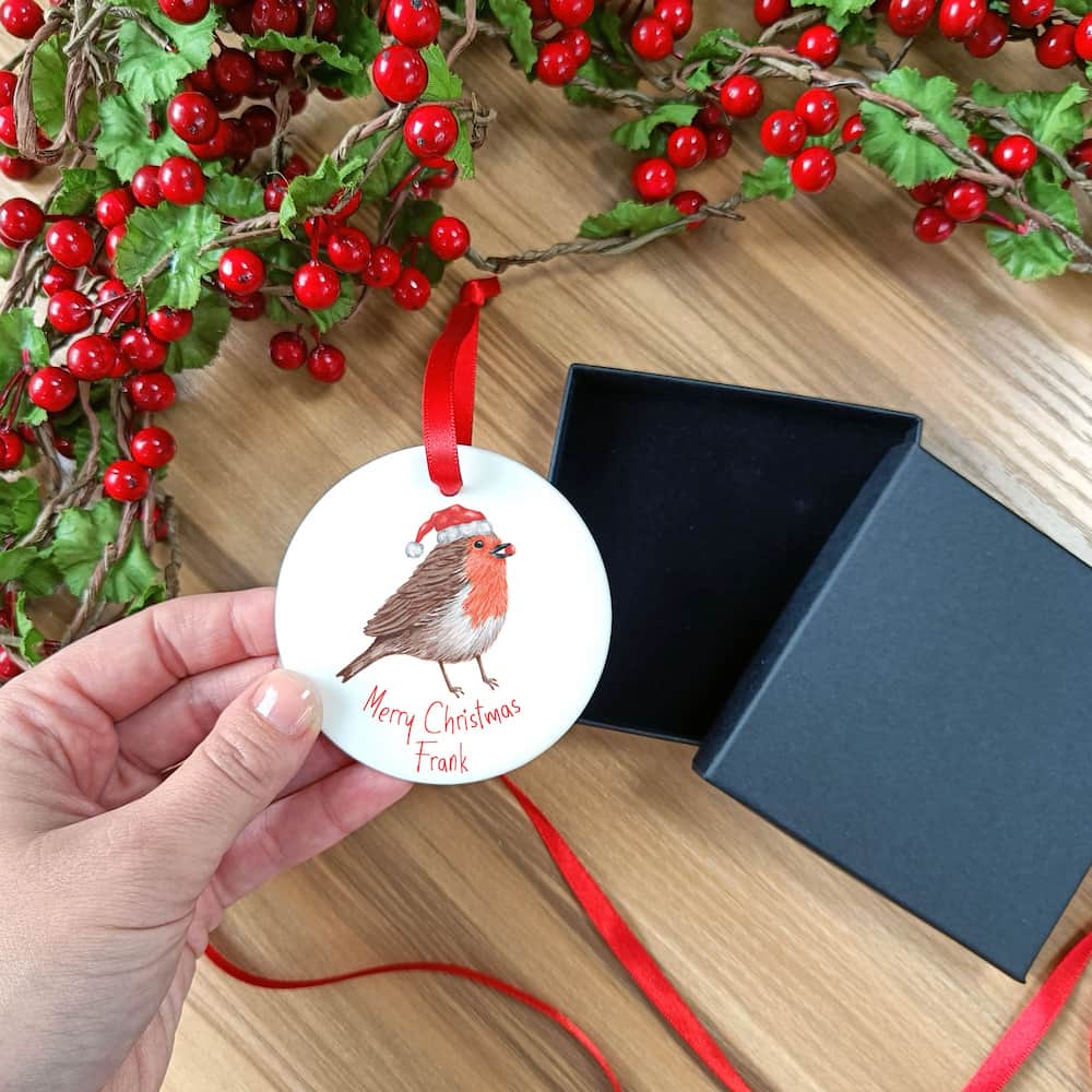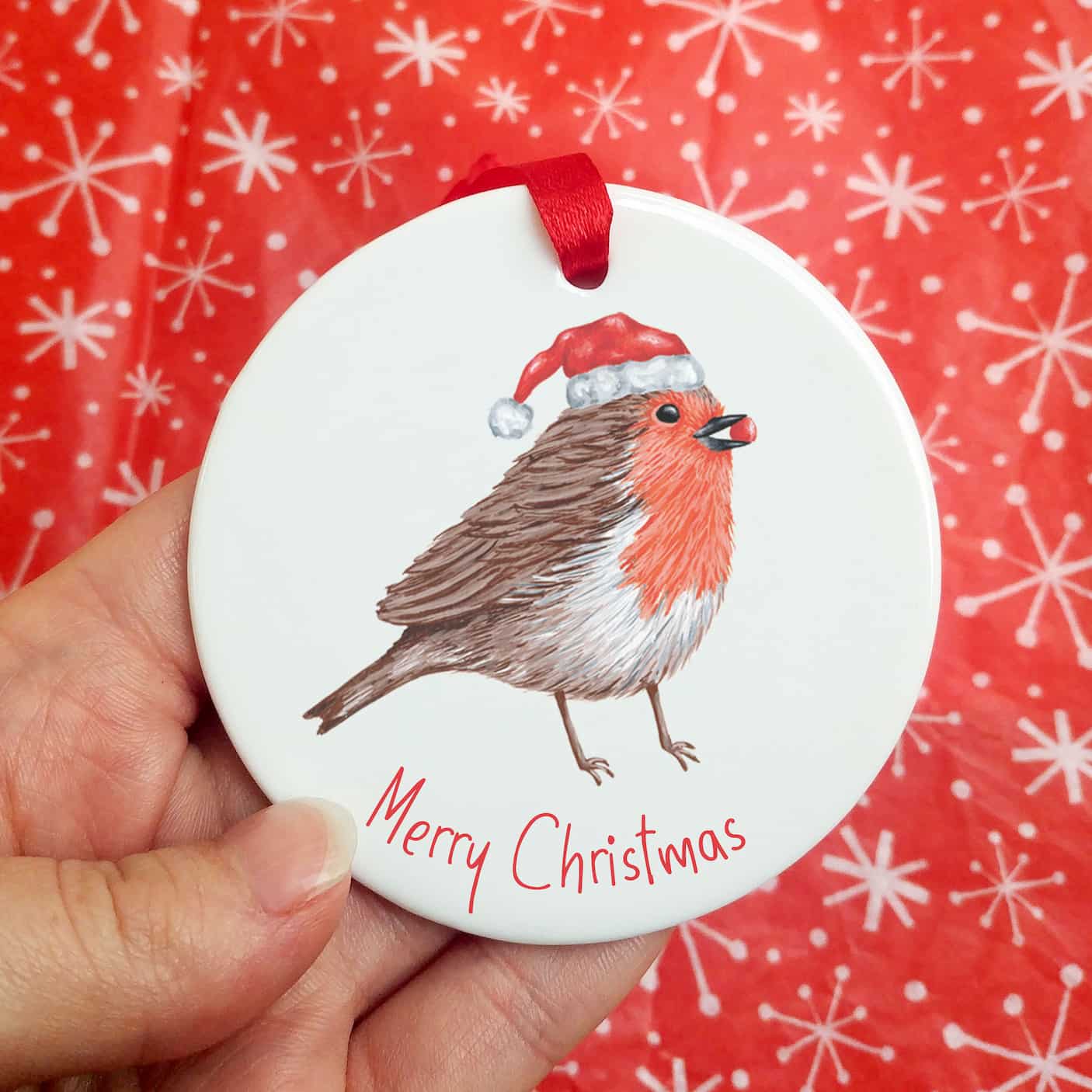 Ceramic ornaments are 7cm by 7cm and are flat, print is only on one side. Comes with a 0.7cm by 25cm red ribbon. Print shows Laura's hand-painted red robin with a santa hat on and a little red berry in his beak. The decoration also has the text 'Merry Christmas' and it has the option to add a name too.