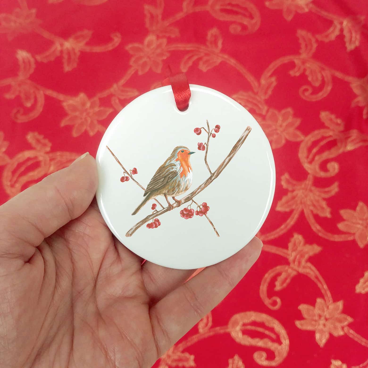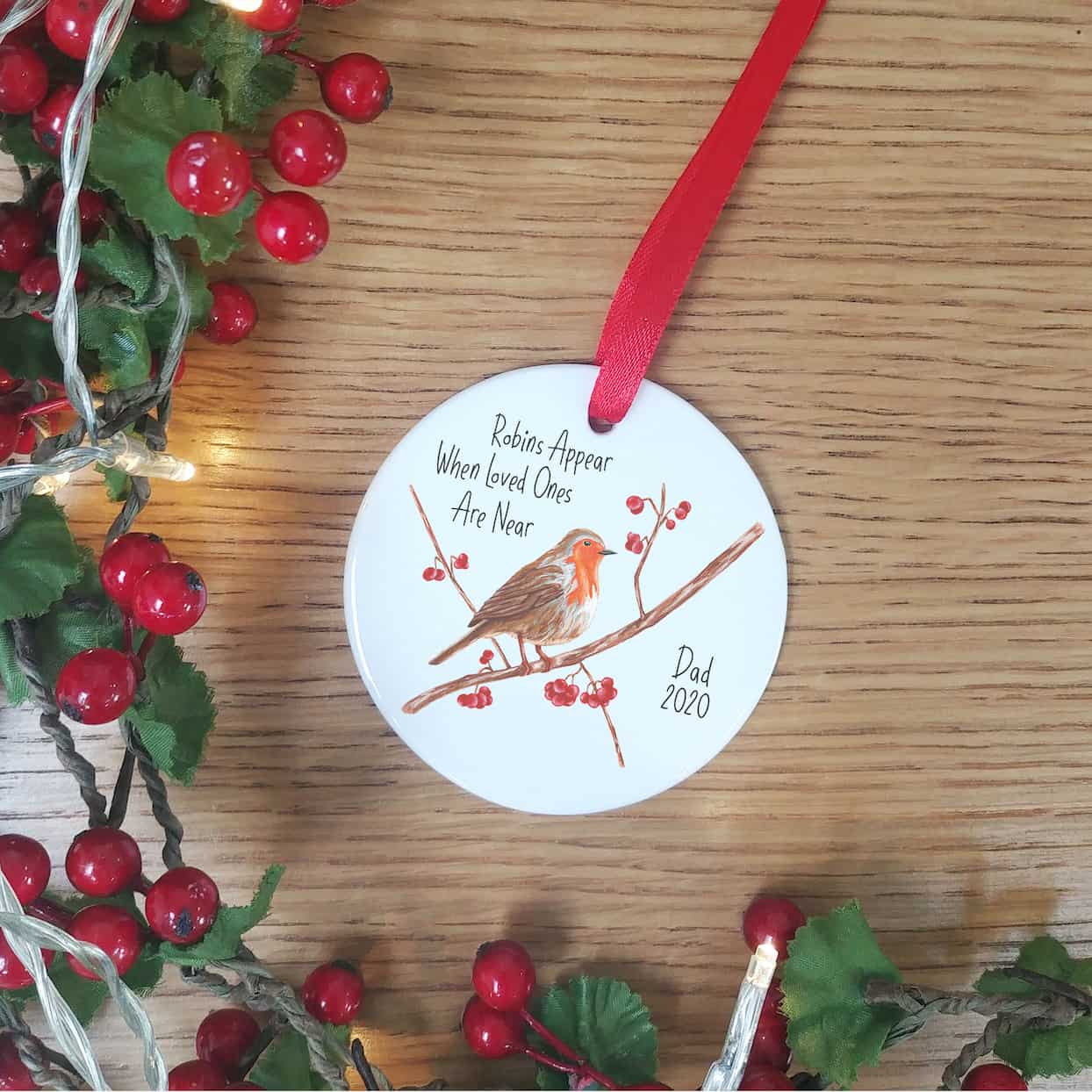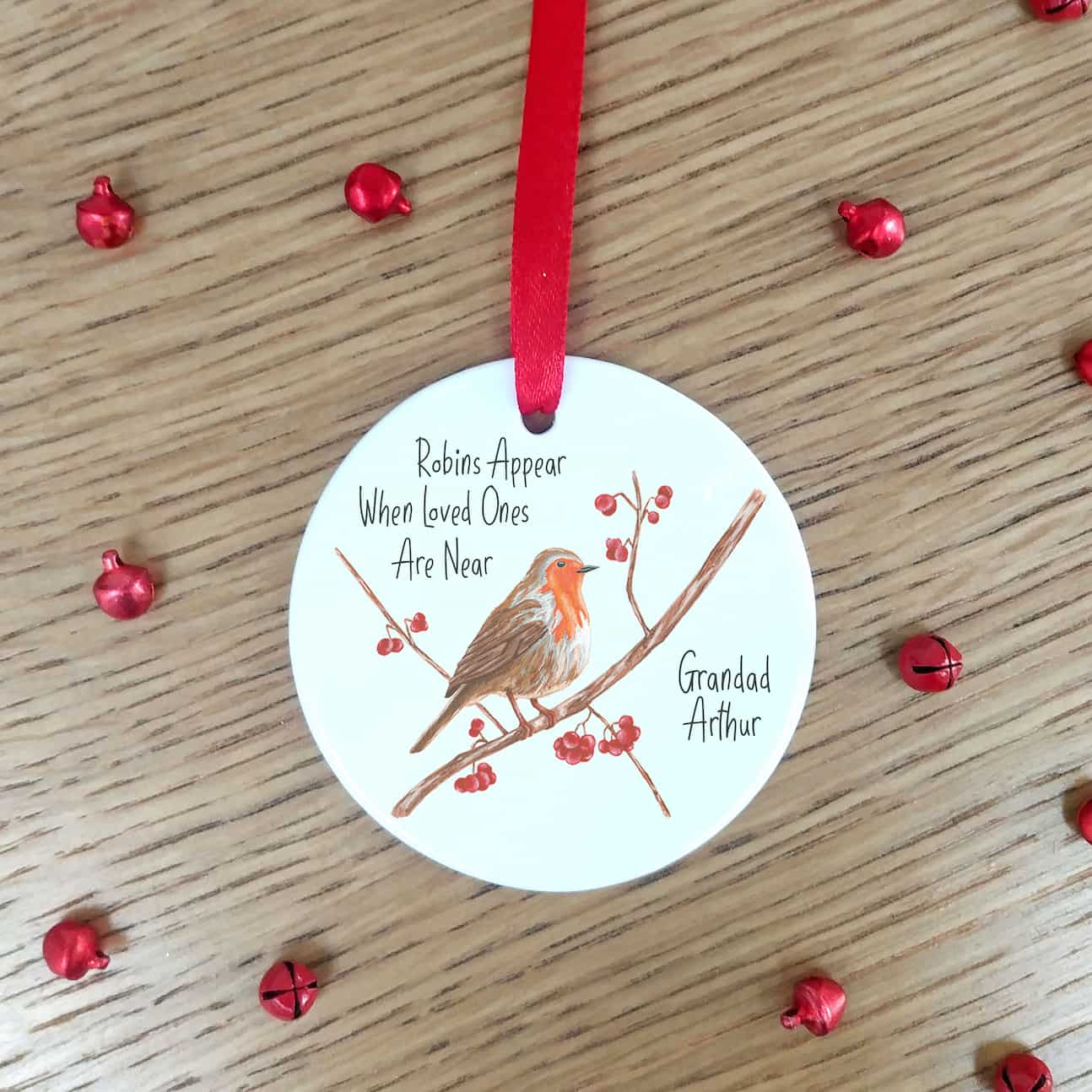 Ceramic ornaments are 7cm by 7cm and are flat, print is only on one side. Comes with a 0.7cm by 25cm red ribbon. Print shows Laura's hand-painted red robin on a branch with red berries with the text 'Robins Appear When Loved Ones Are Near', you can then also add a name and a date if you wish.