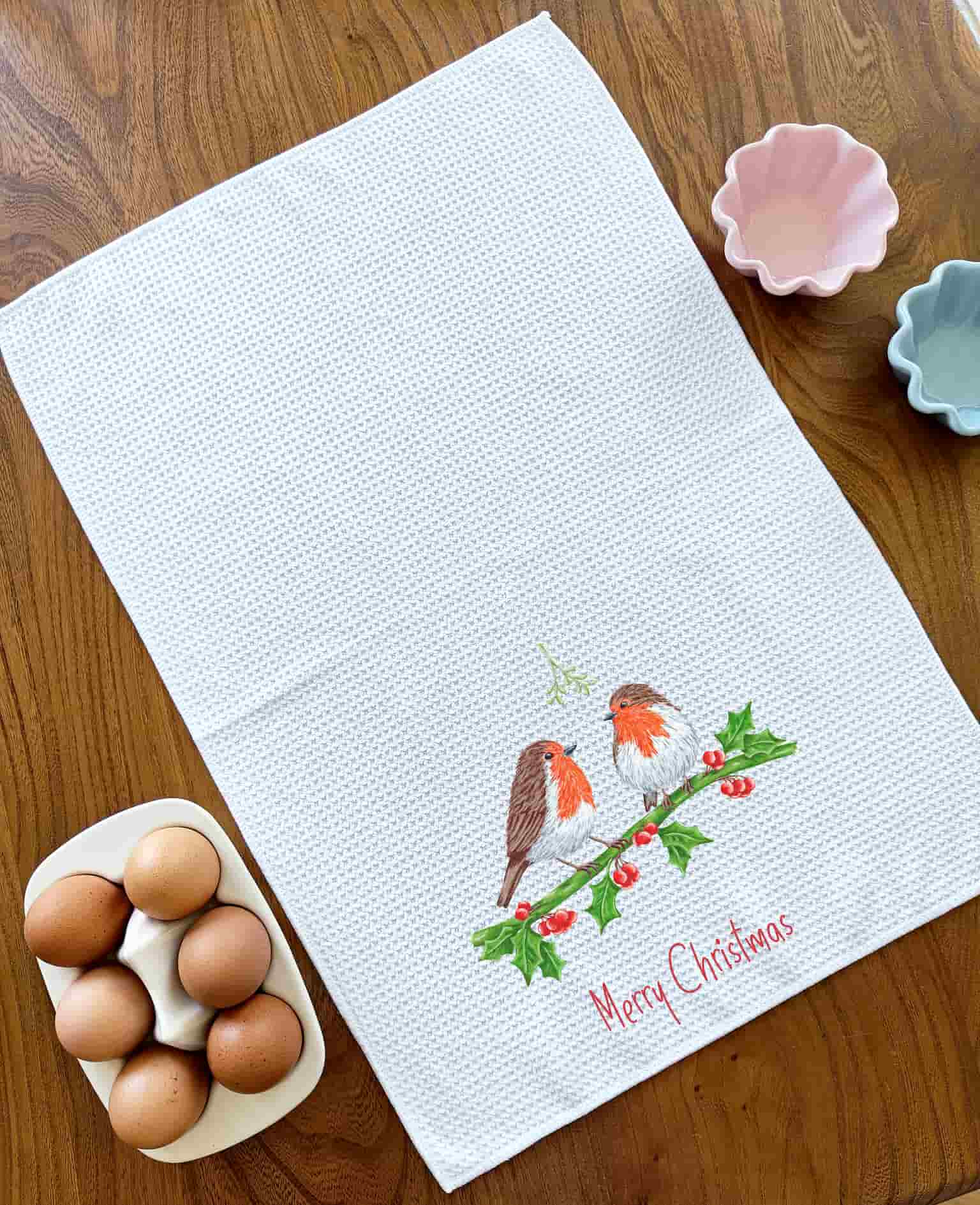 Tea towels measure 40cm by 60cm and are made of polyester 380gsm.