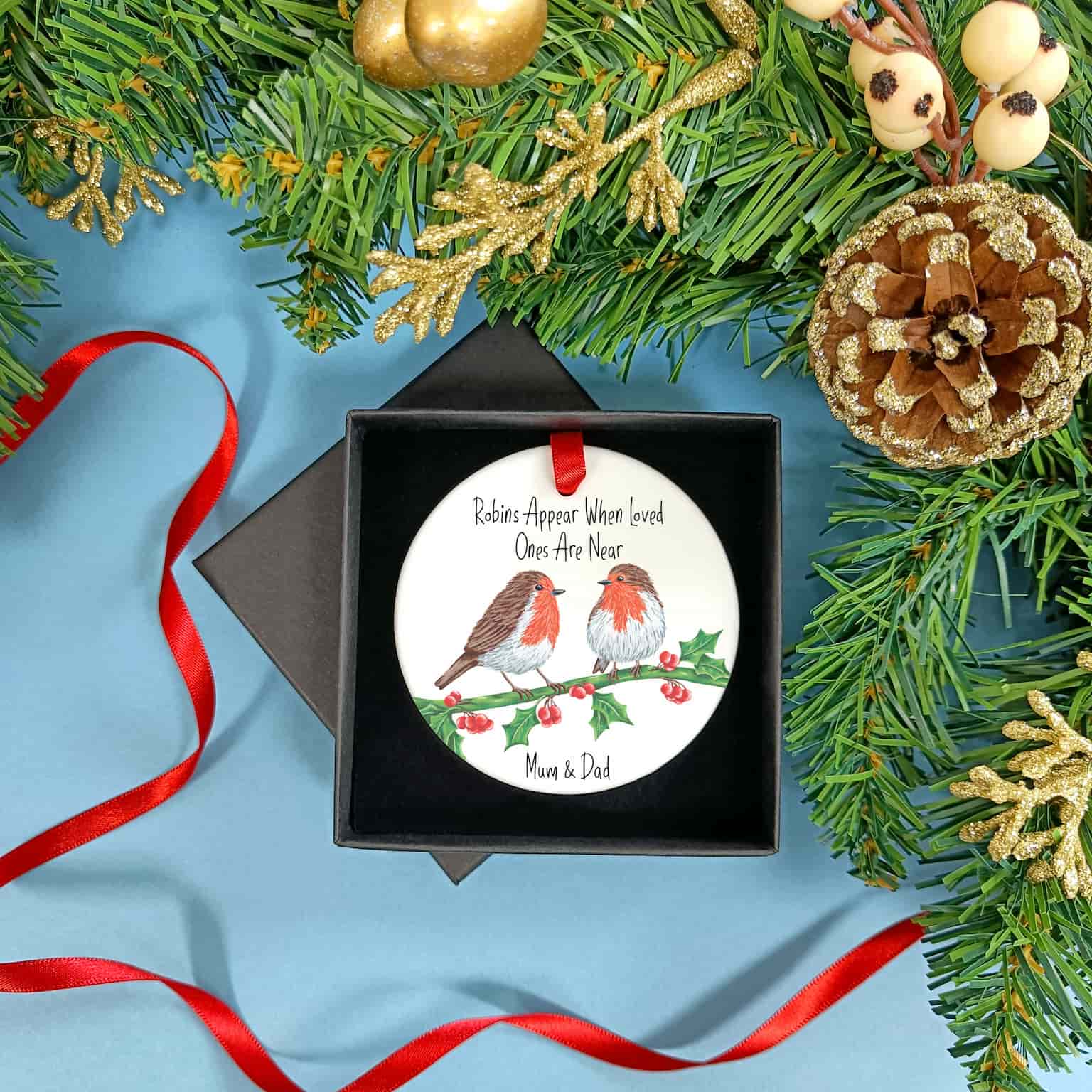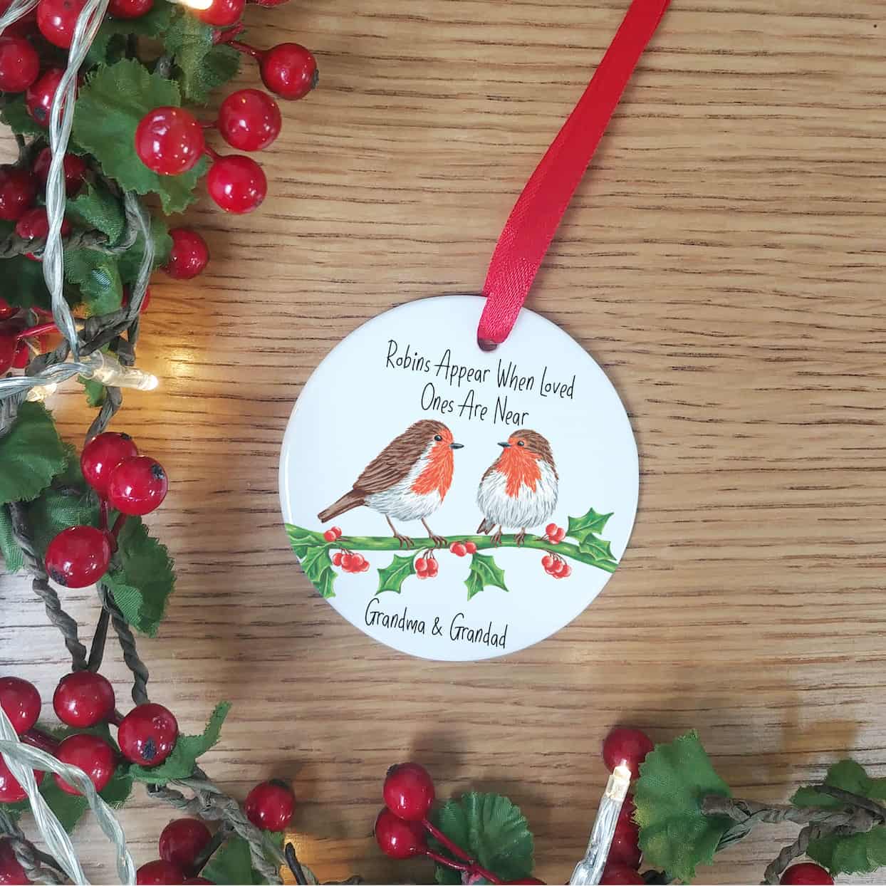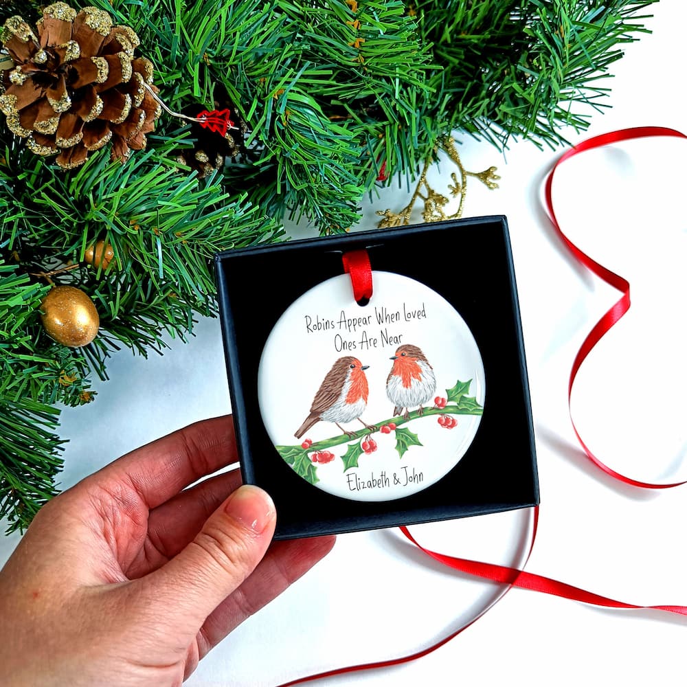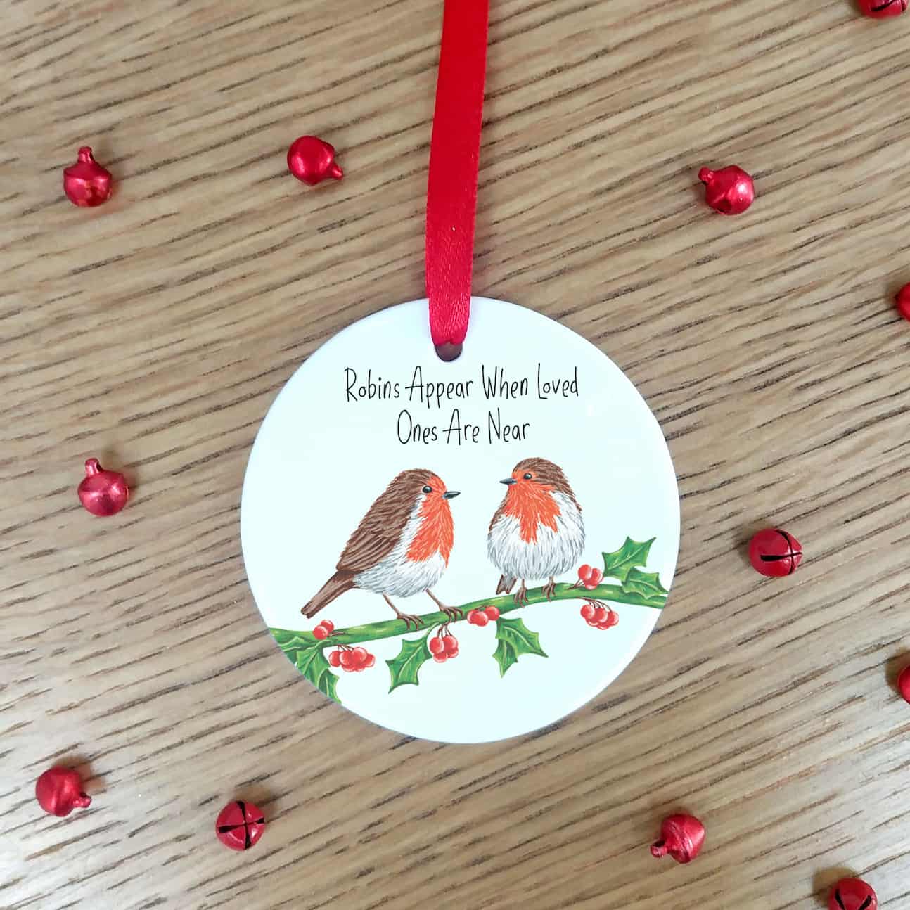 Ceramic ornaments are 7cm by 7cm and are flat, print is only on one side. Comes with a 0.7cm by 25cm red or cream ribbon. Print shows Laura's hand-painted red robin on a branch with red berries with the text 'Robins Appear When Loved Ones Are Near', you can then also add a name and a date if you wish.