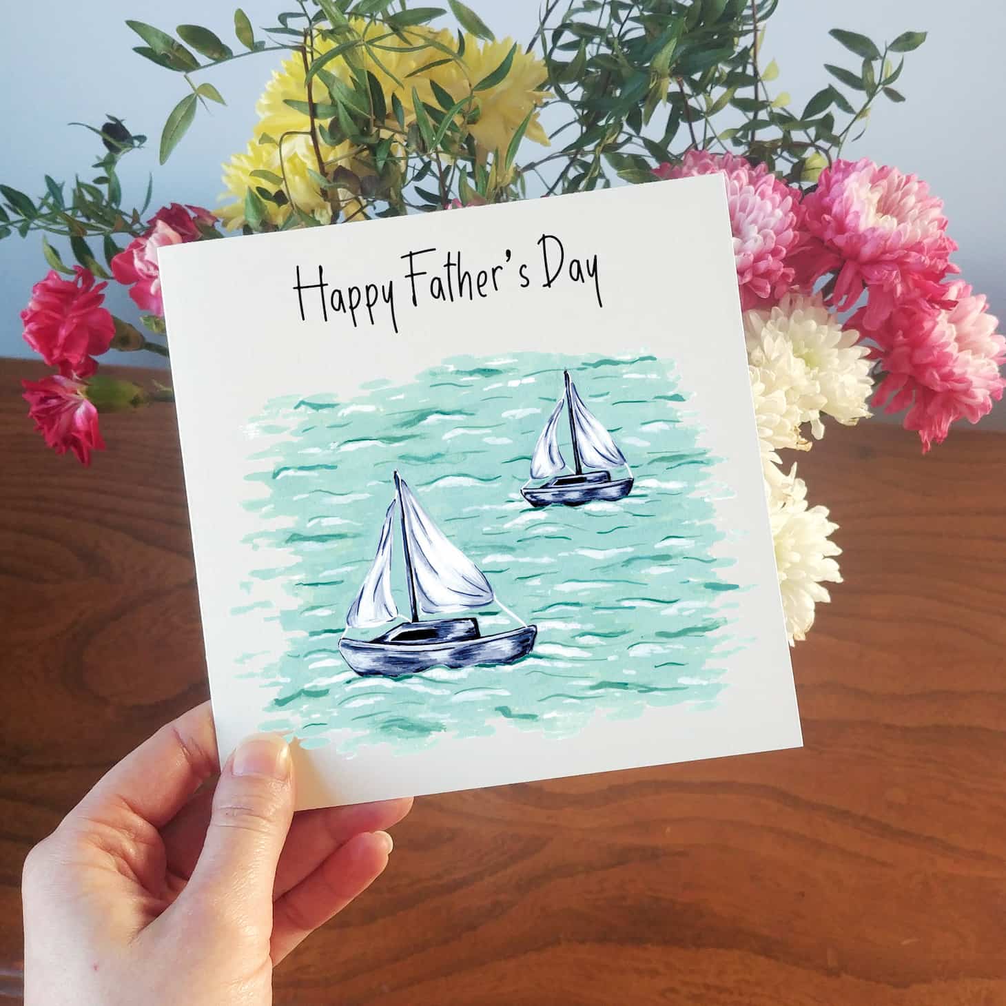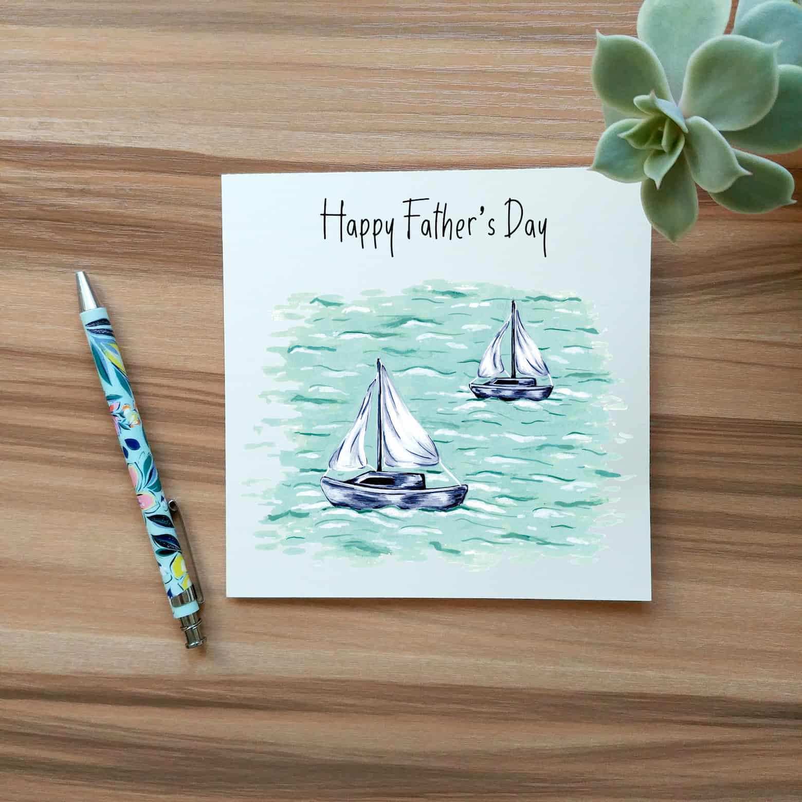 Sailing fathers day card, featuring a digital print of Laura's hand-painted sailing boats out at sea.